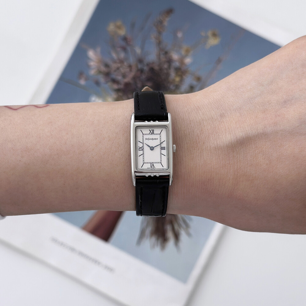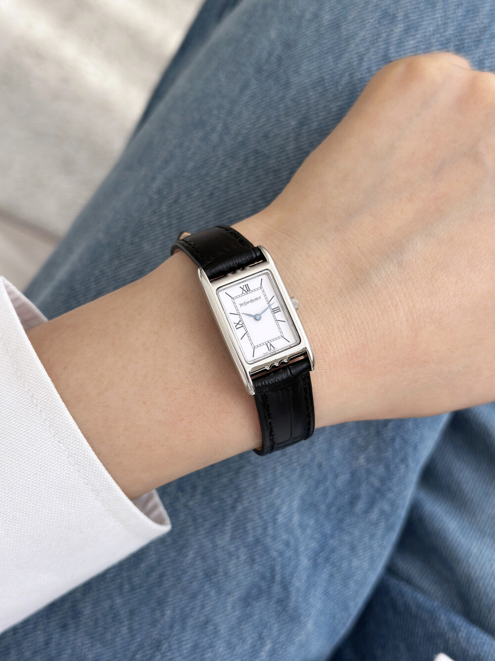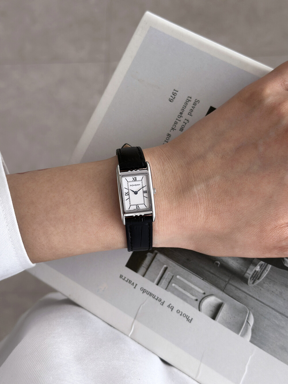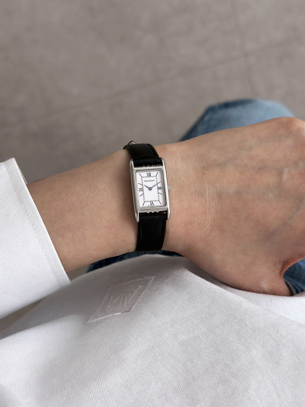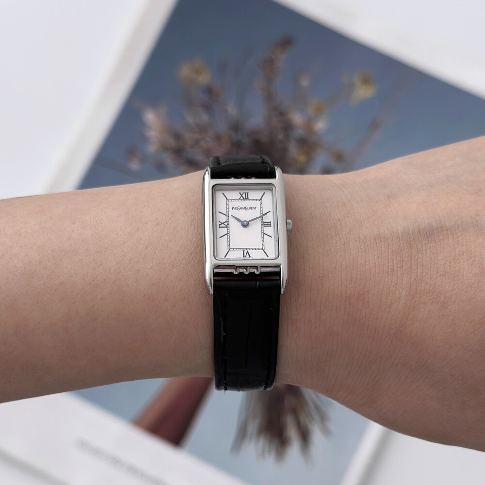 부드러운 곡선의 스퀘어 케이스와 화이트 다이얼 위를 장식하는 생로랑 로고가 매력적인 시계입니다.