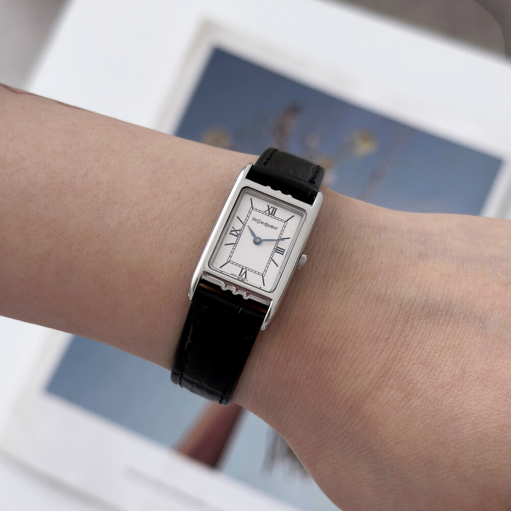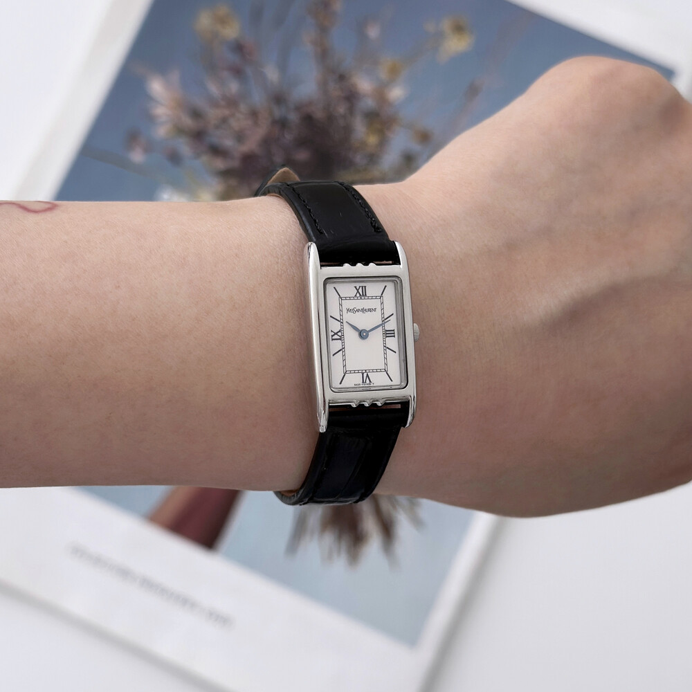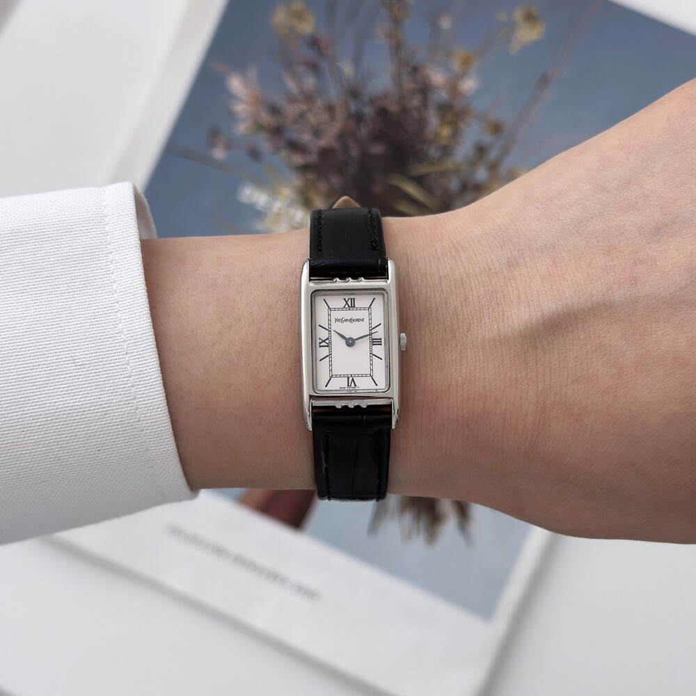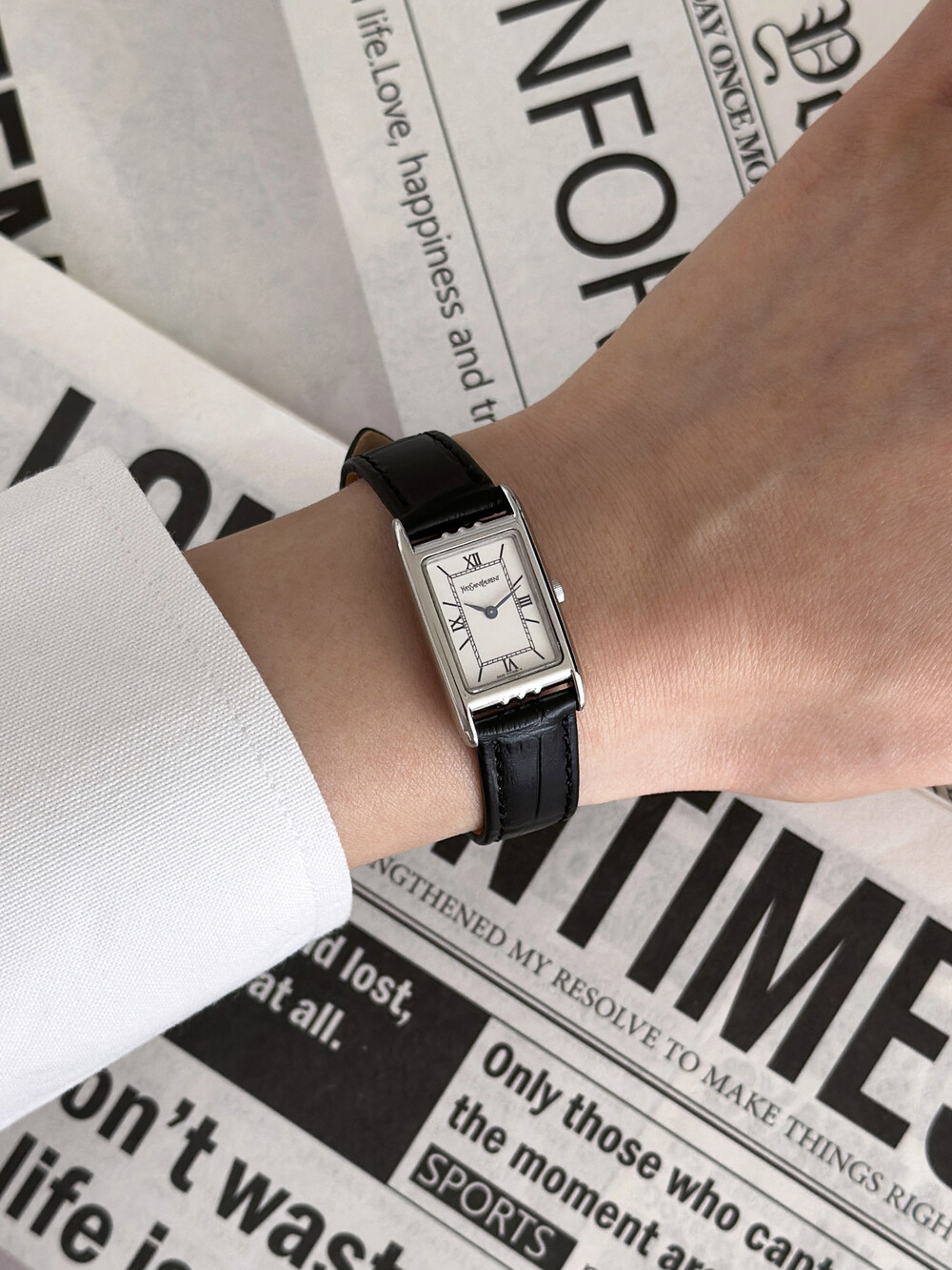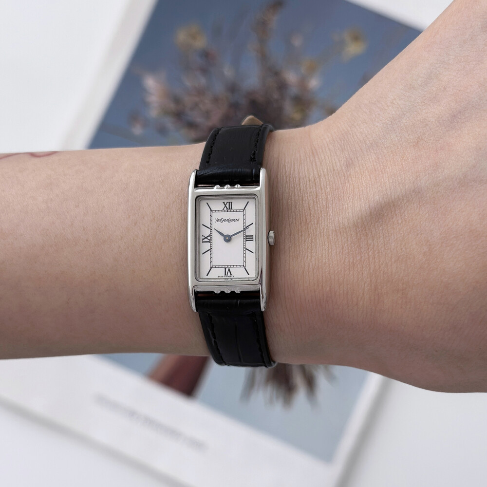 부드러운 곡선의 스퀘어 케이스와 화이트 다이얼 위를 장식하는 생로랑 로고가 매력적인 시계입니다.