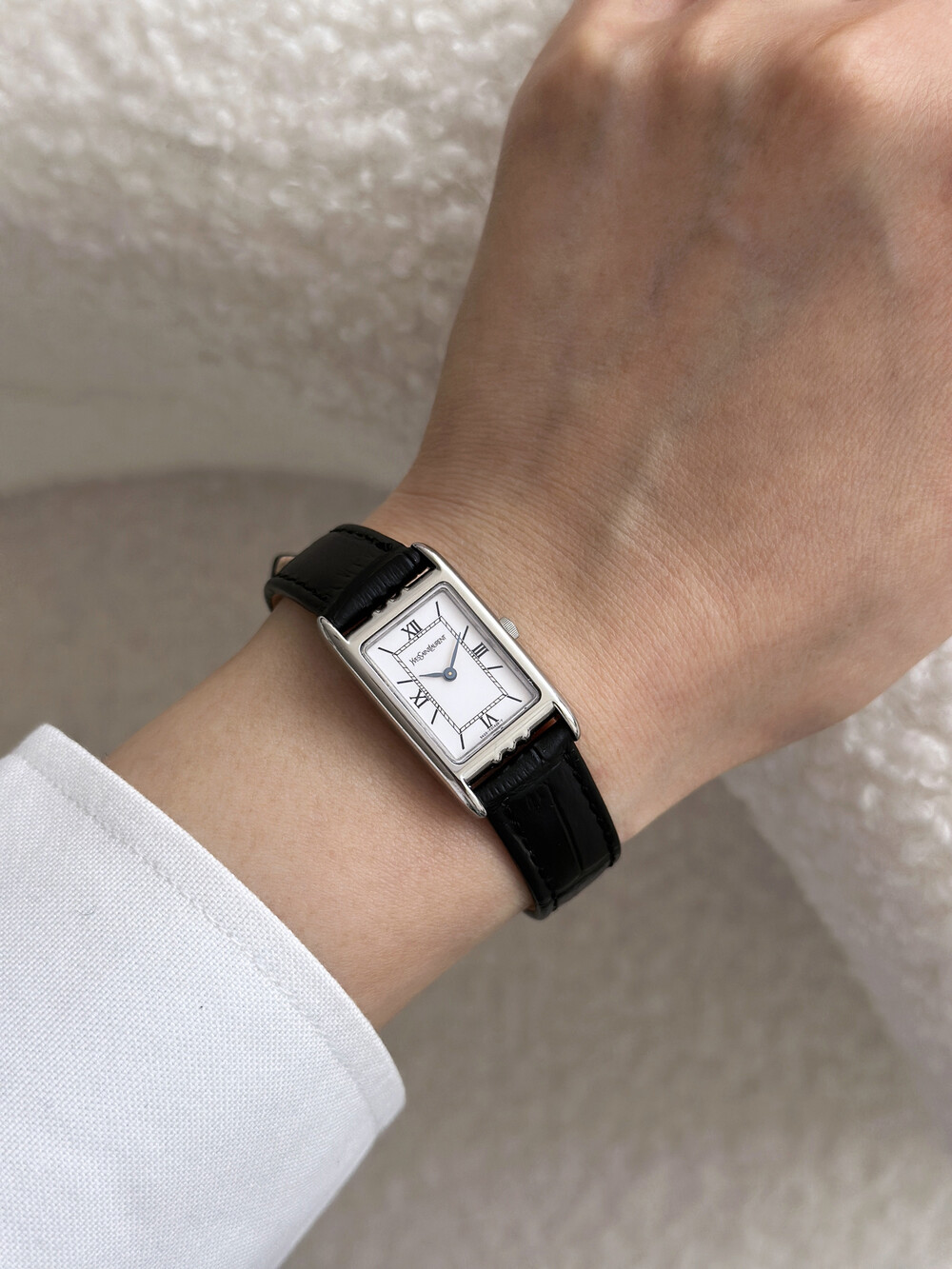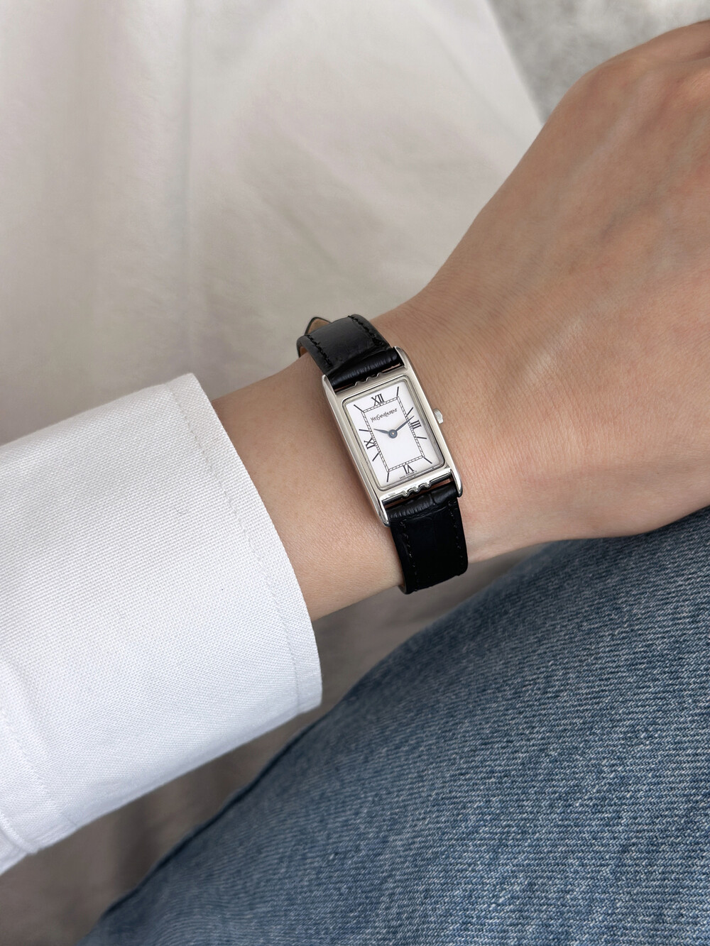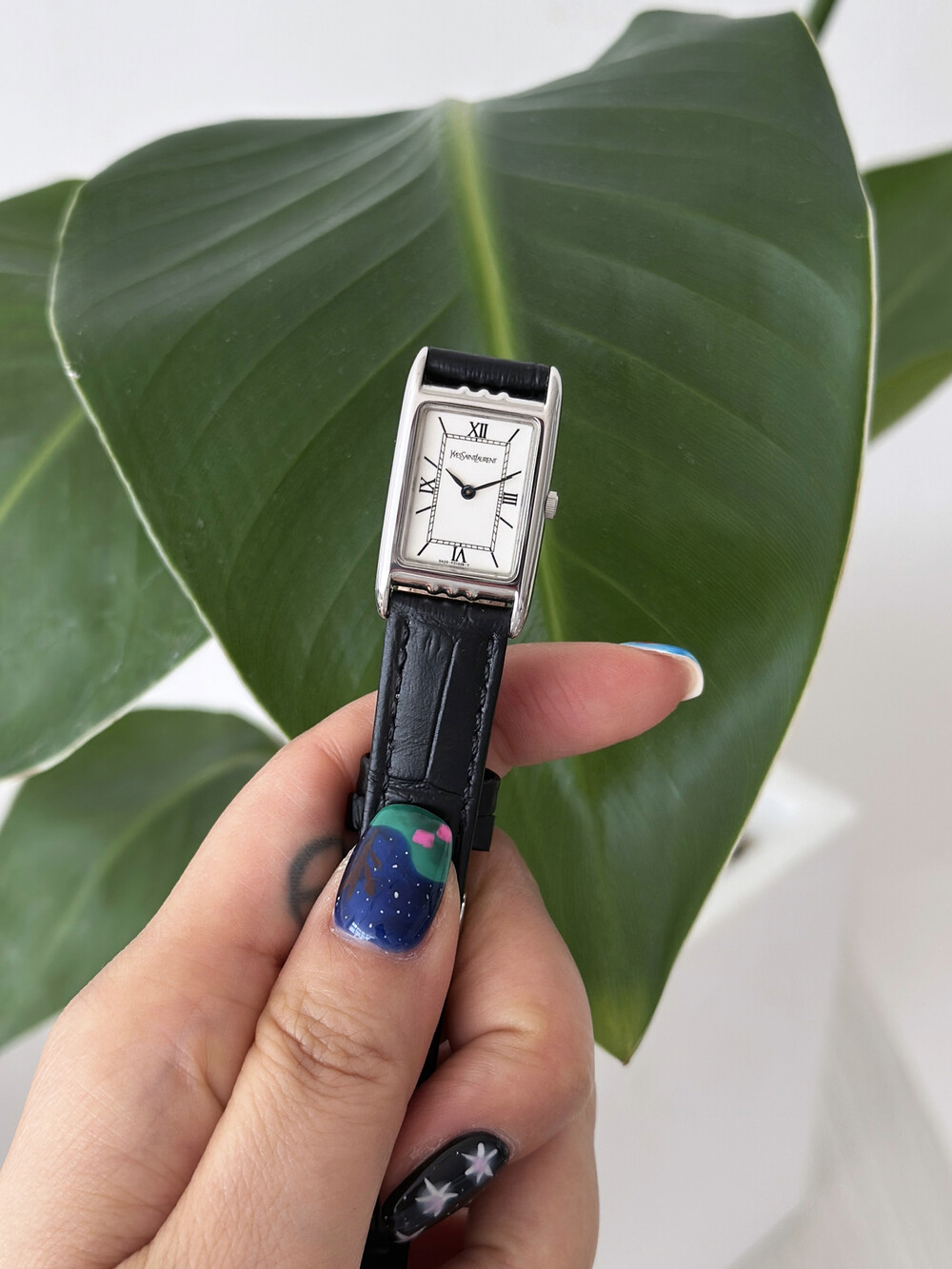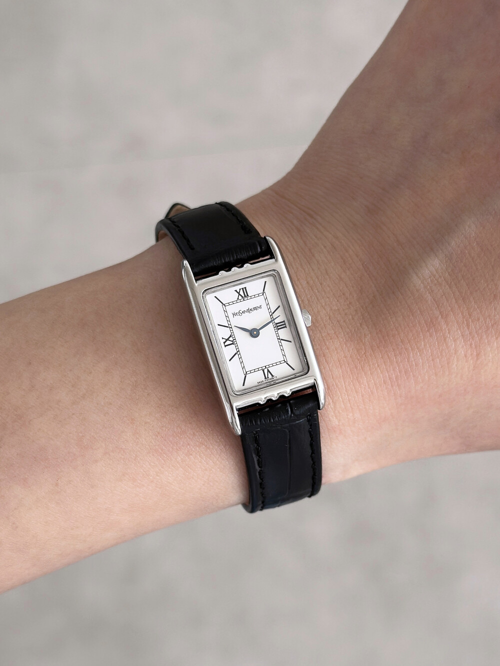부드러운 곡선의 스퀘어 케이스와 화이트 다이얼 위를 장식하는 생로랑 로고가 매력적인 시계입니다.