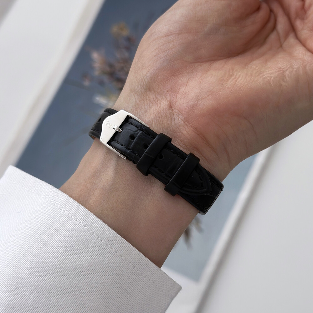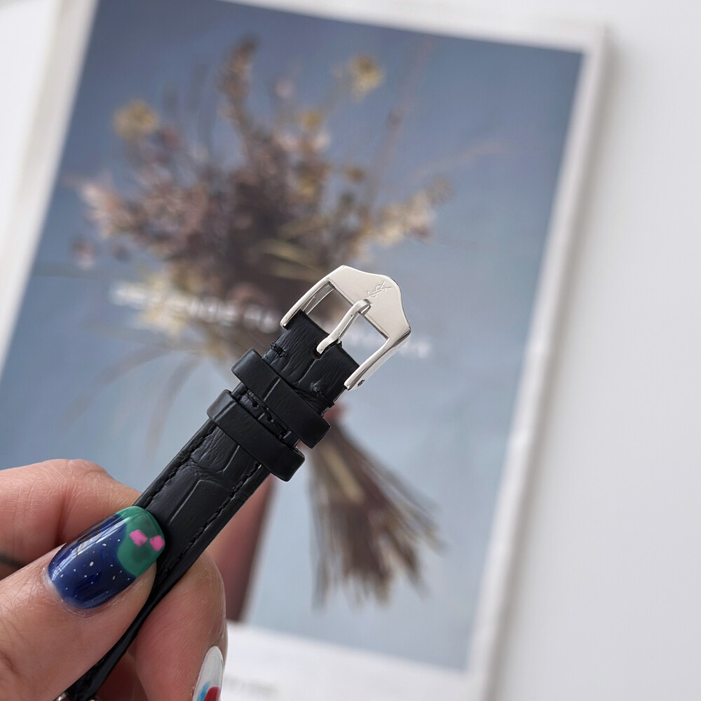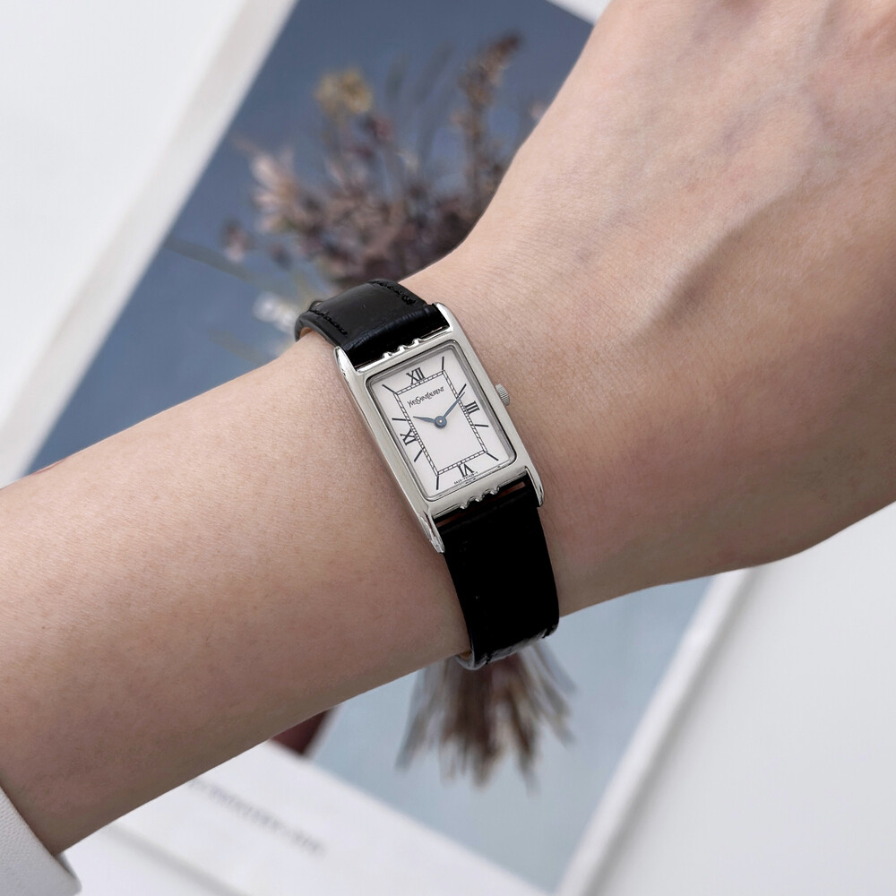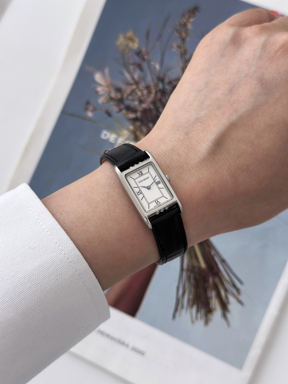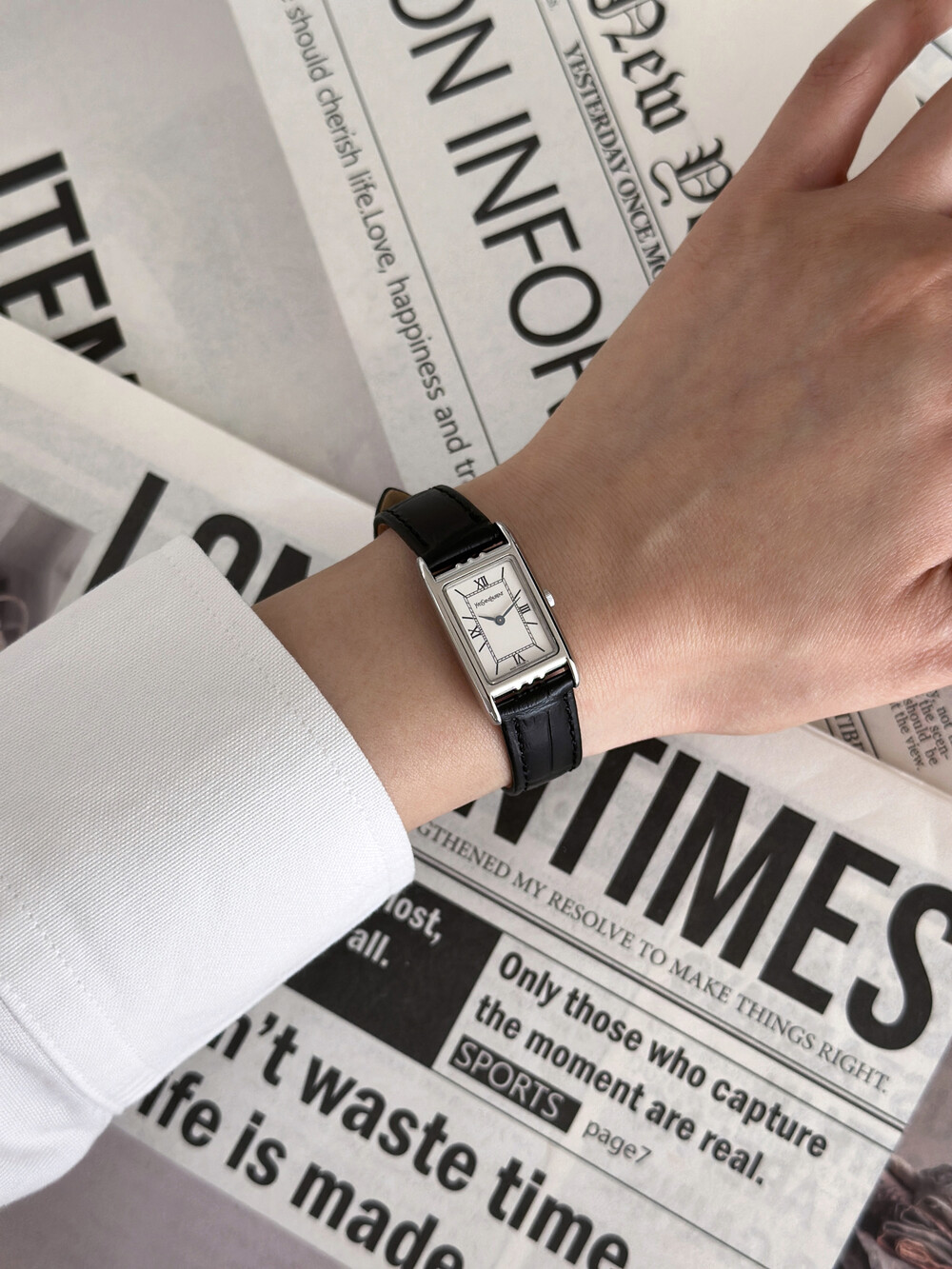 부드러운 곡선의 스퀘어 케이스와 화이트 다이얼 위를 장식하는 생로랑 로고가 매력적인 시계입니다.