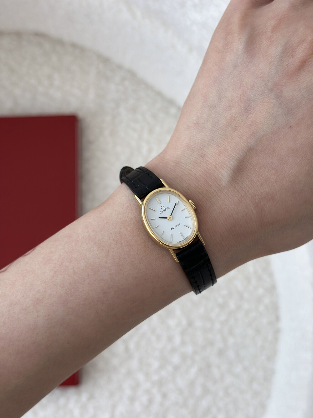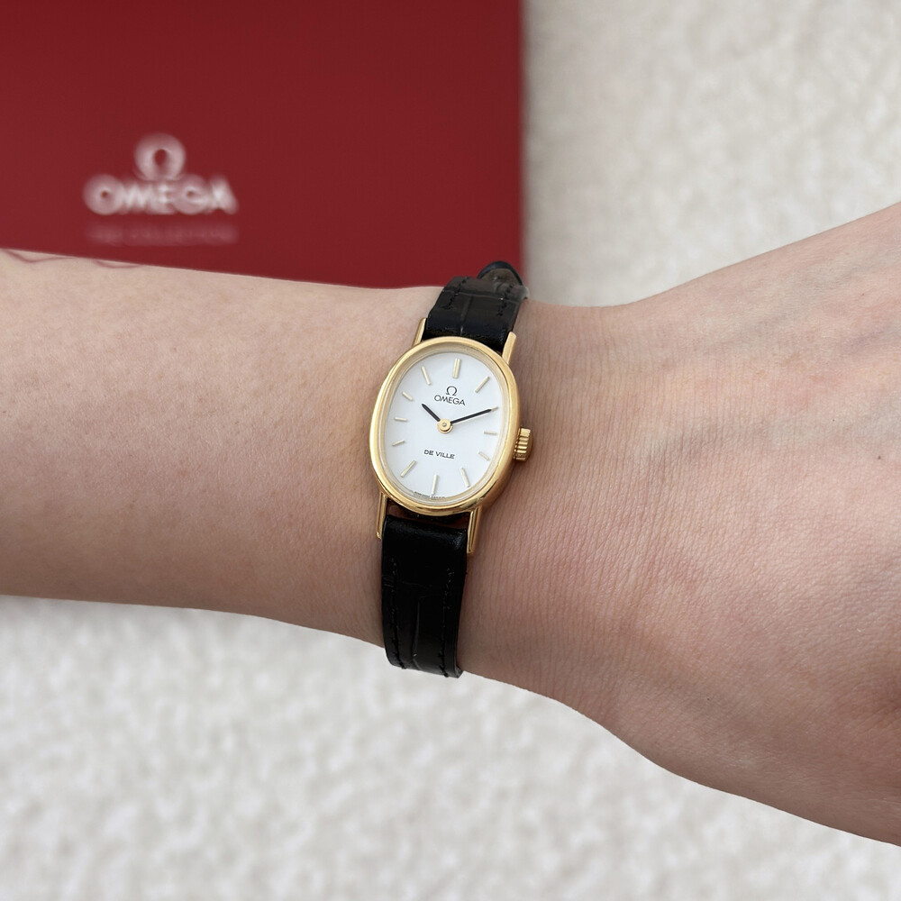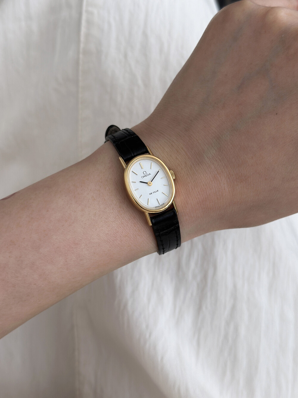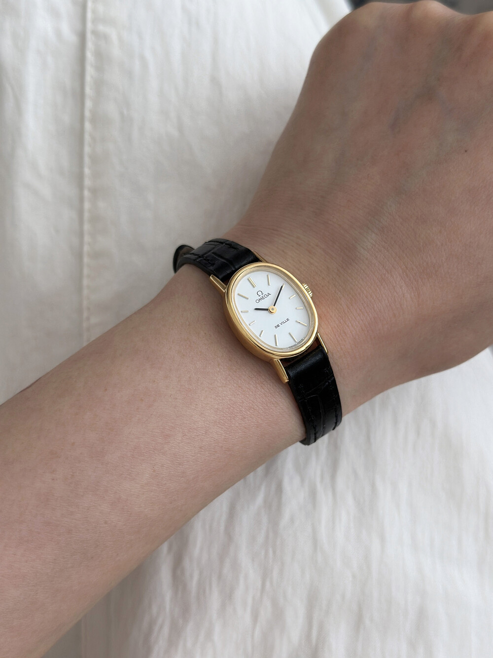 1979년도에 제작된 오메가 드빌 모델로 깔끔한 화이트 다이얼 위를 장식하는