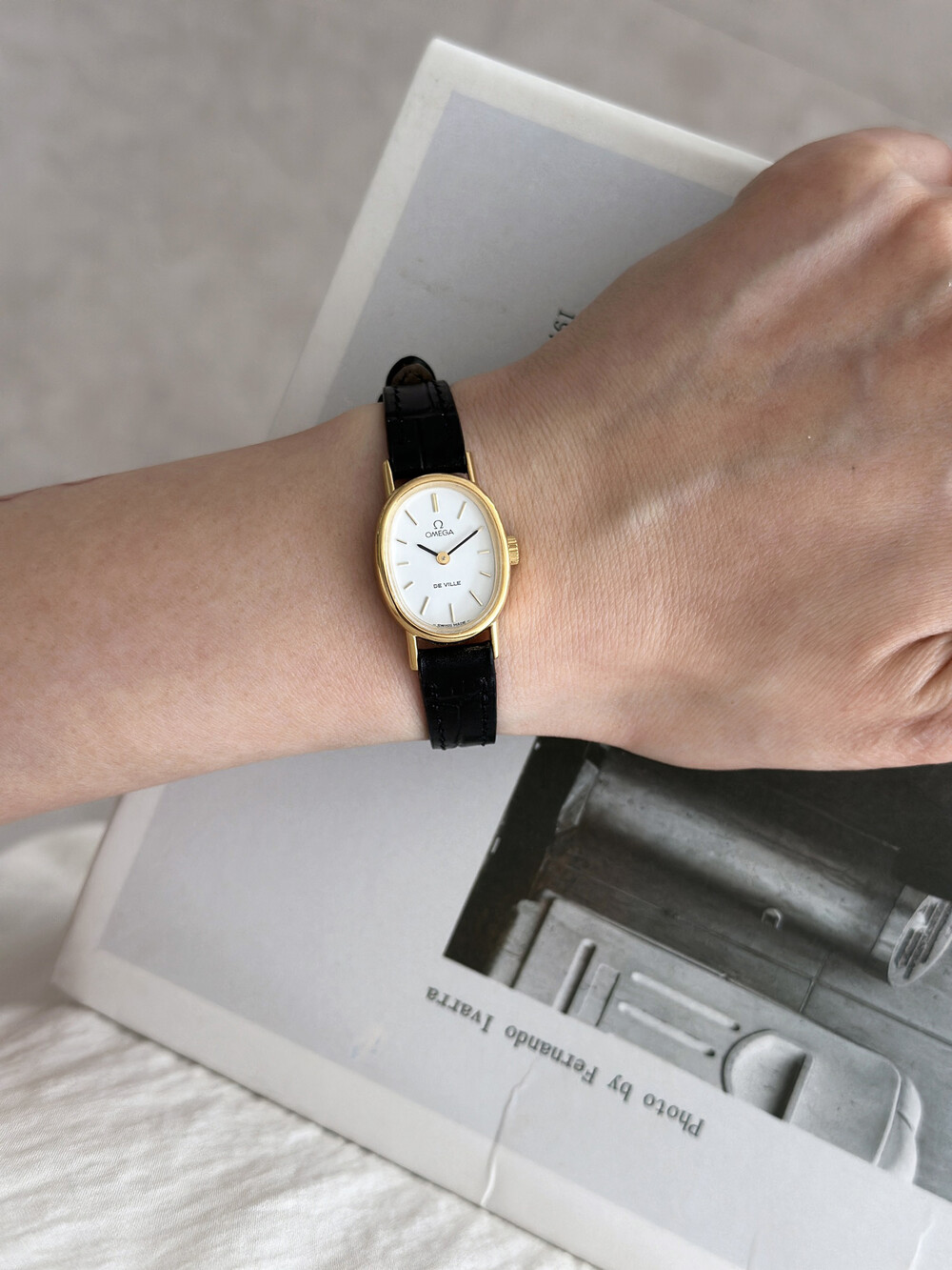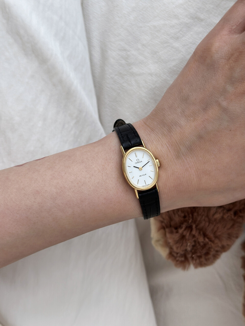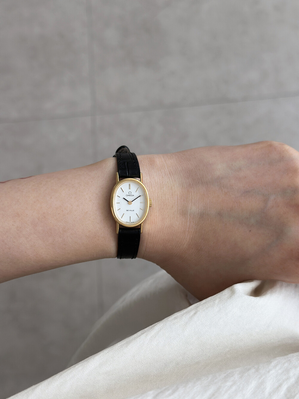 1979년도에 제작된 오메가 드빌 모델로 깔끔한 화이트 다이얼 위를 장식하는