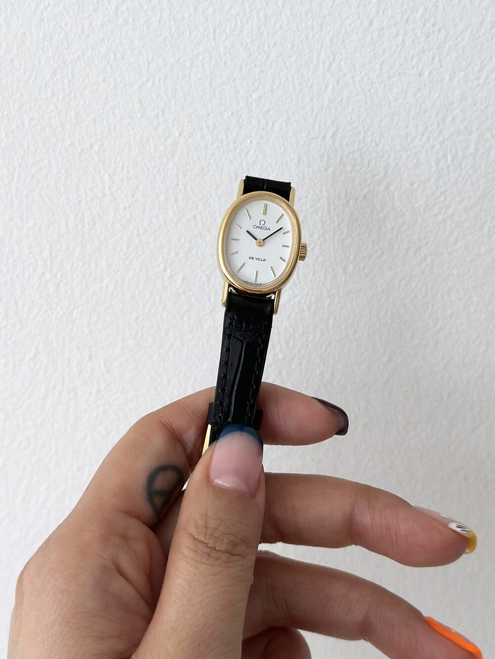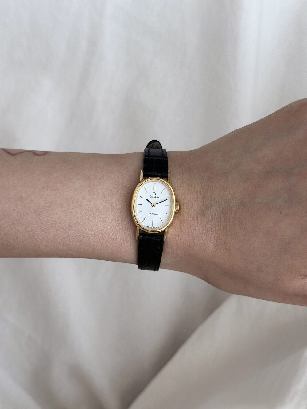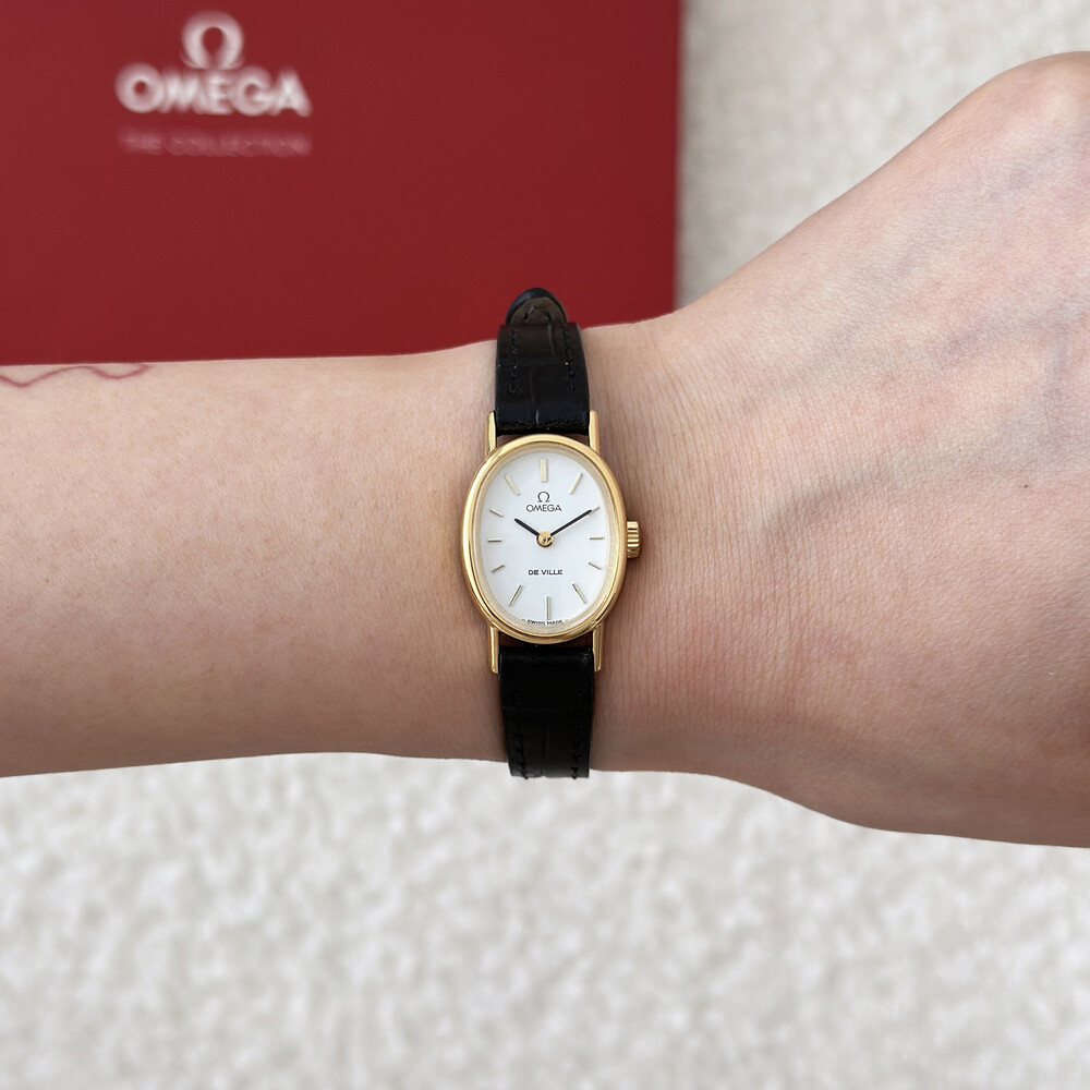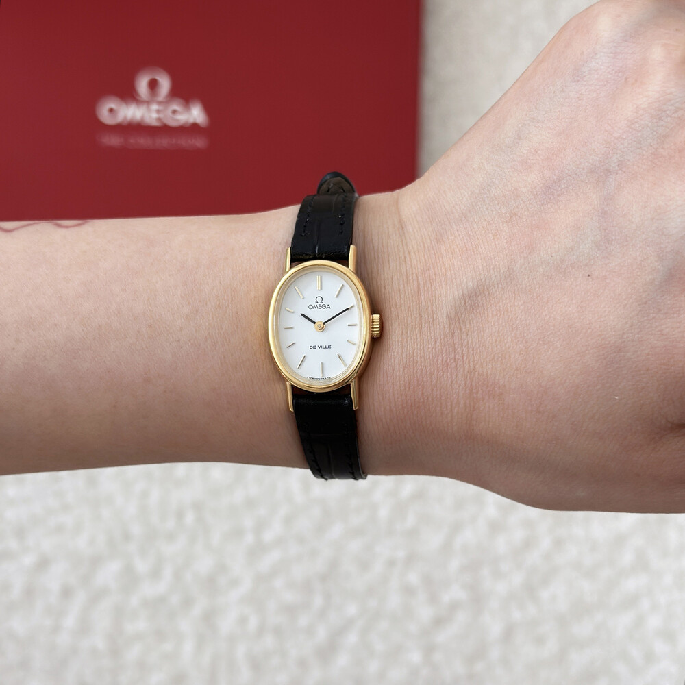 1979년도에 제작된 오메가 드빌 모델로 깔끔한 화이트 다이얼 위를 장식하는