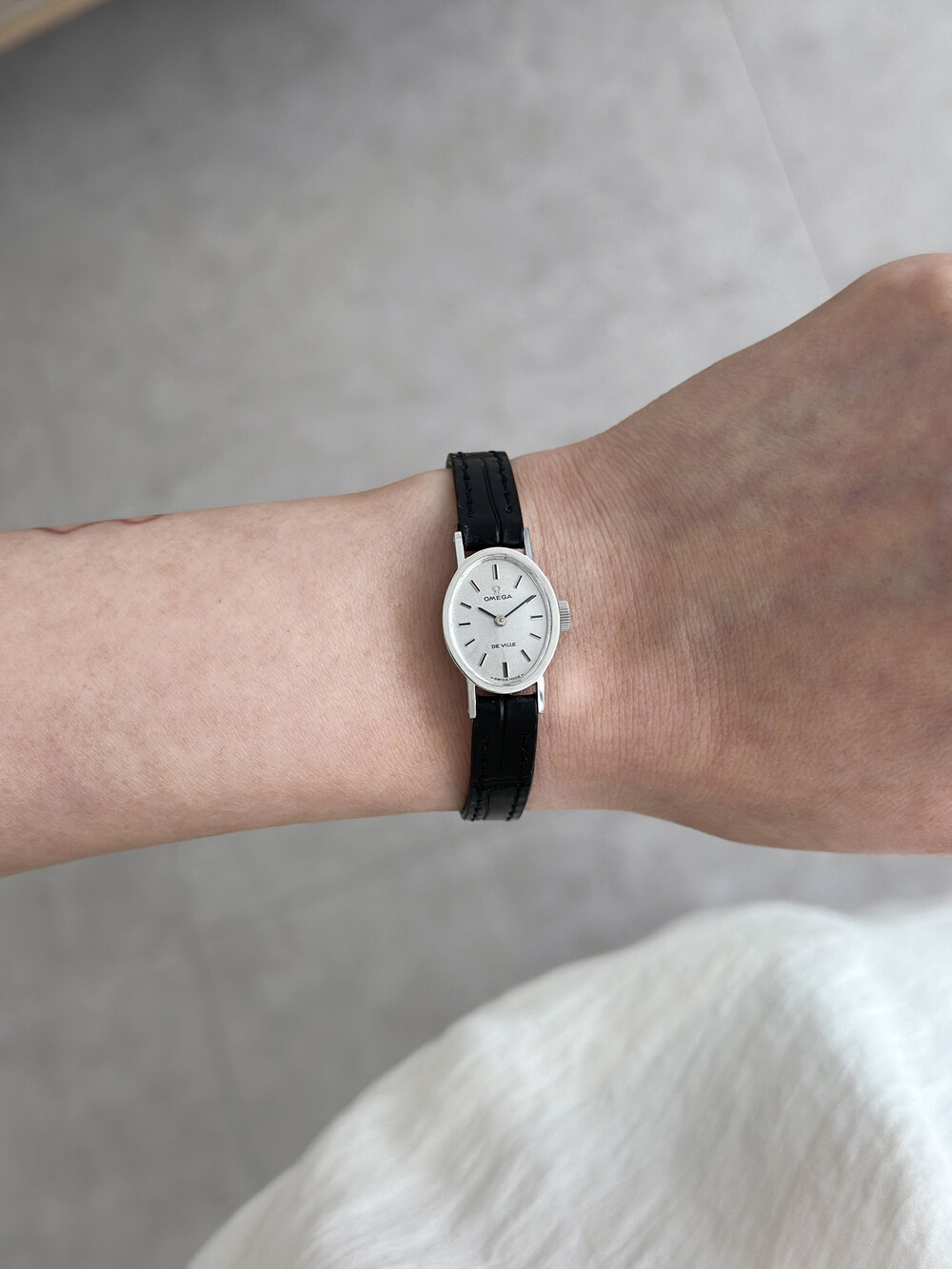 1970년도에 제작된 오메가 드빌 모델로 실버 다이얼 위를 장식하는