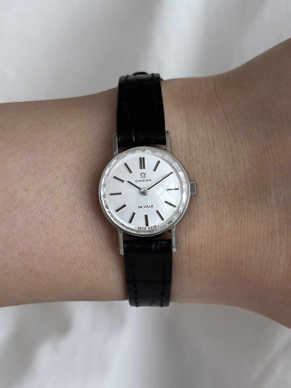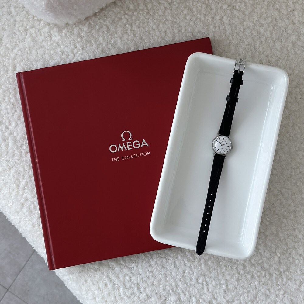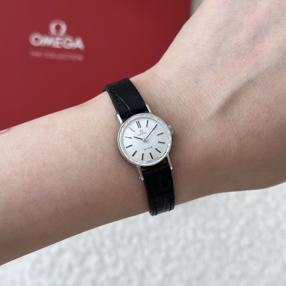 1968년도에 제작된 오메가 드빌 모델로 깔끔한 화이트 다이얼 위를 장식하는