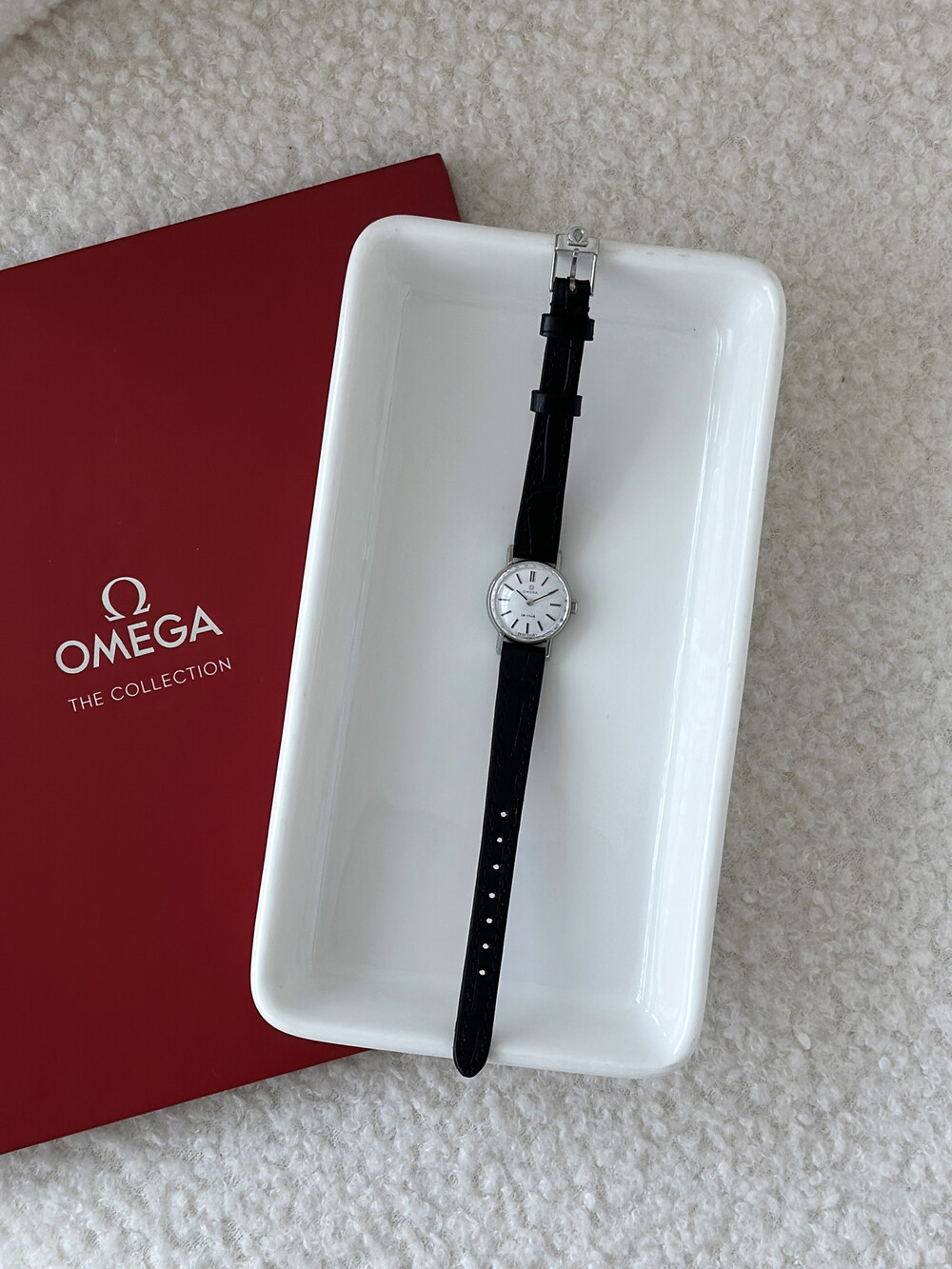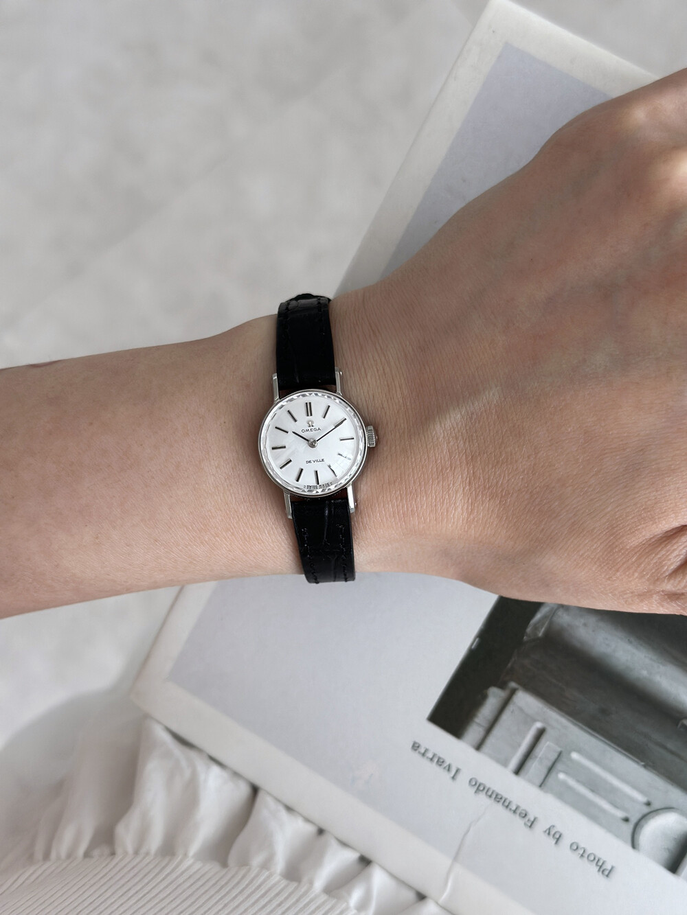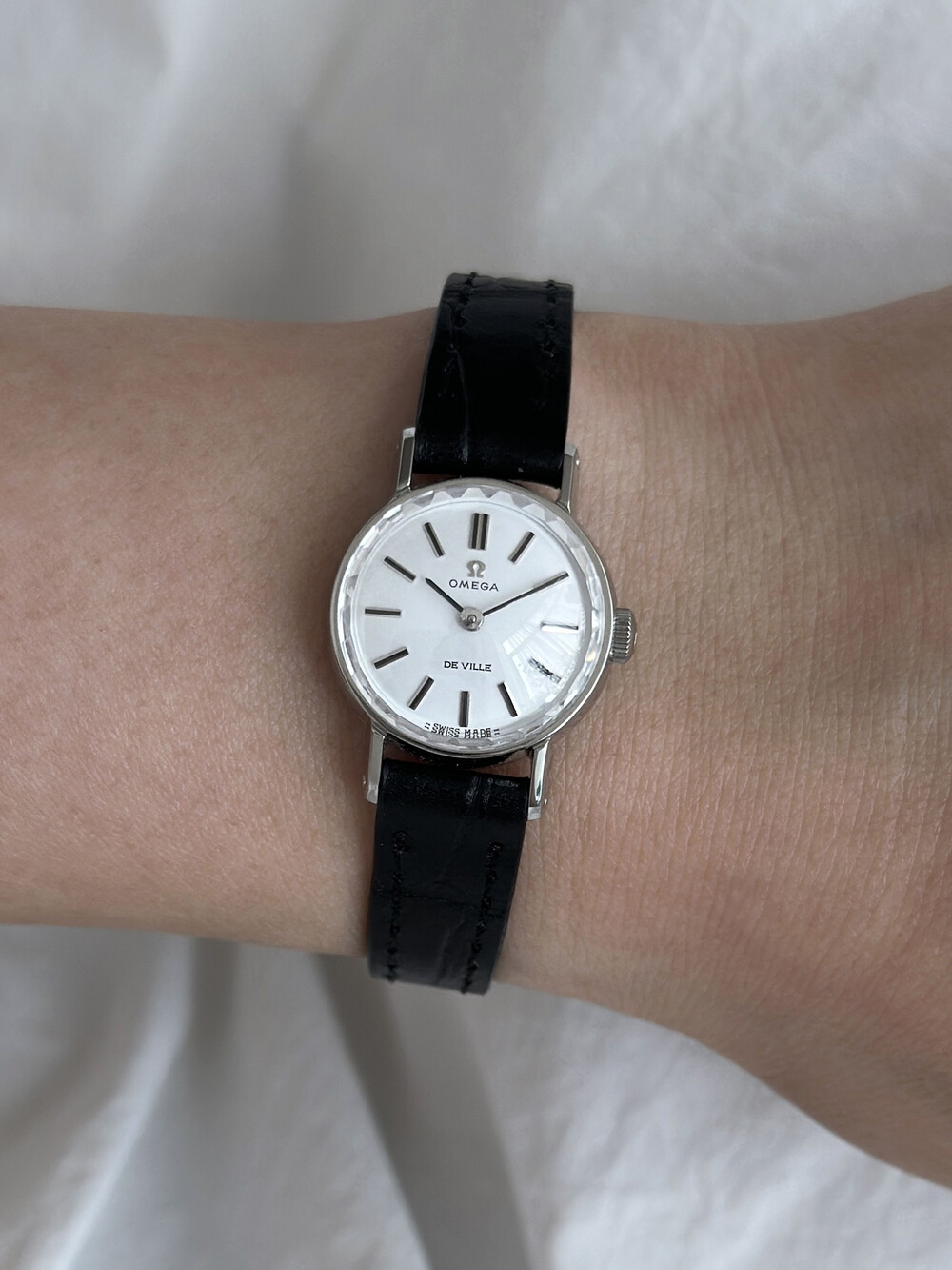 1968년도에 제작된 오메가 드빌 모델로 깔끔한 화이트 다이얼 위를 장식하는