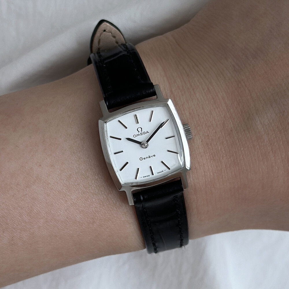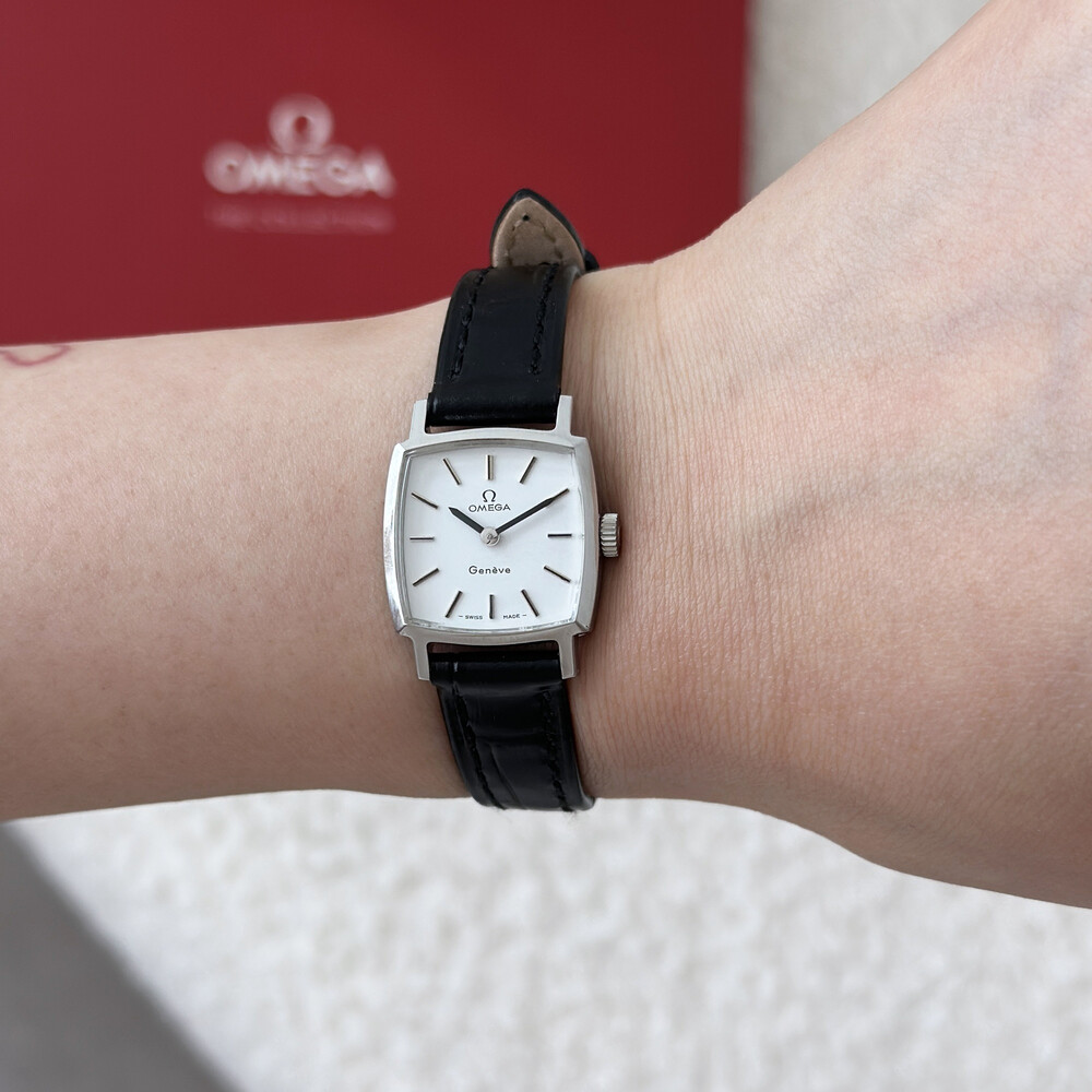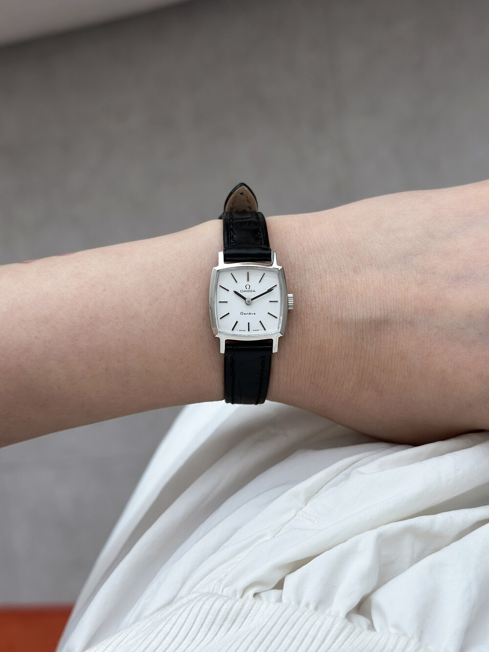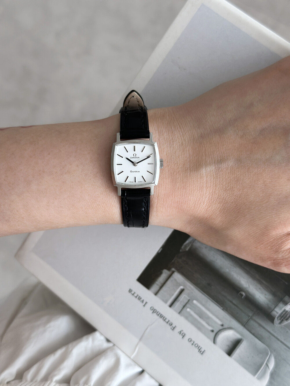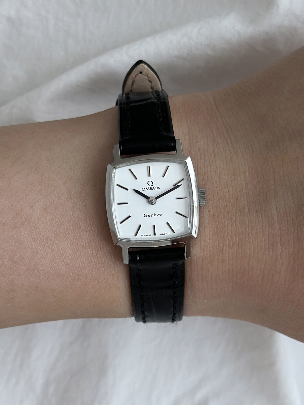 1972년도에 제작된 오메가 제네브 모델로 깔끔한 화이트 다이얼 위를 장식하는