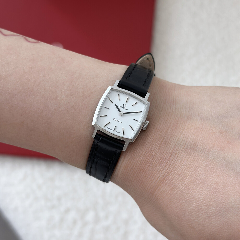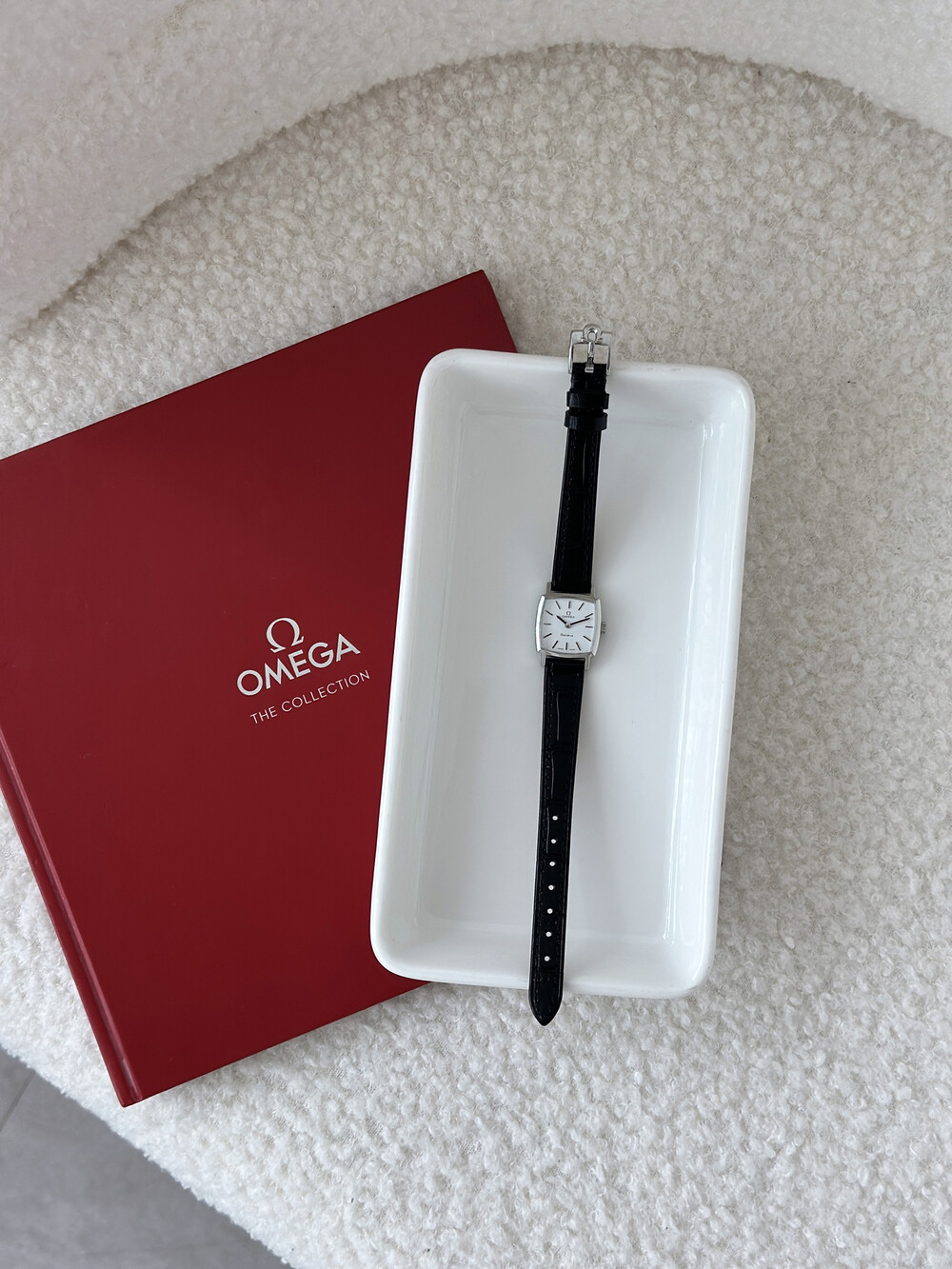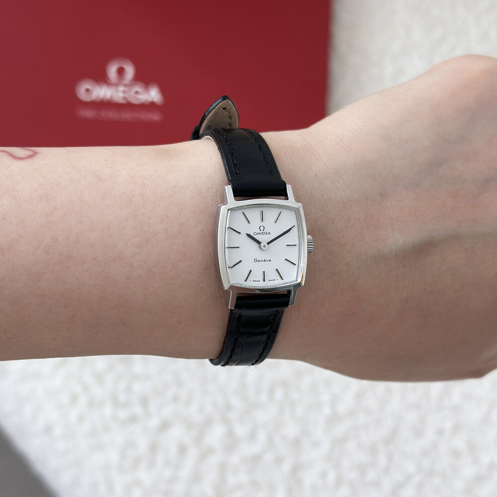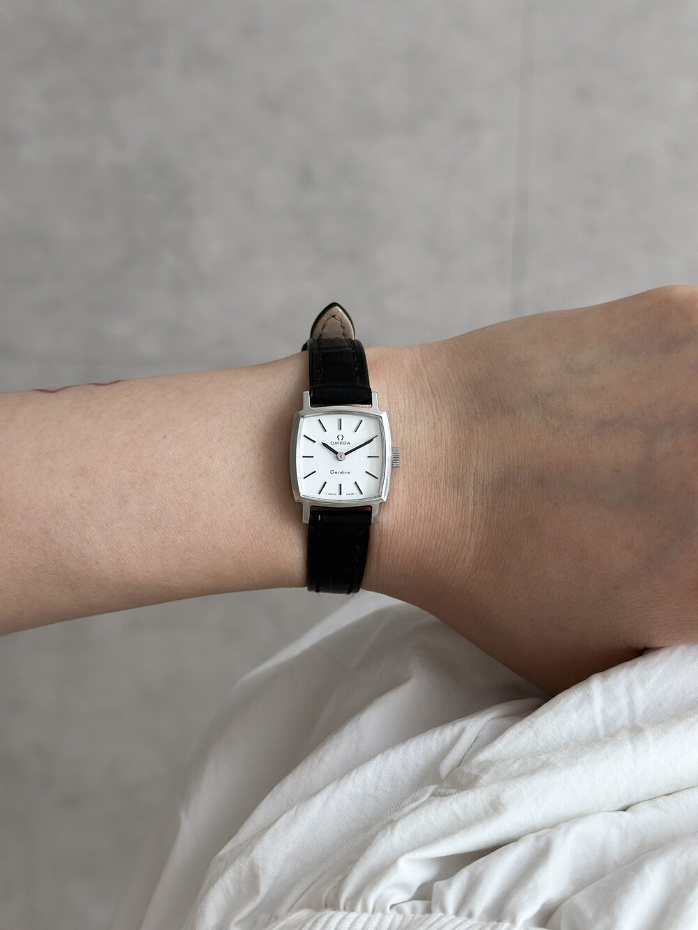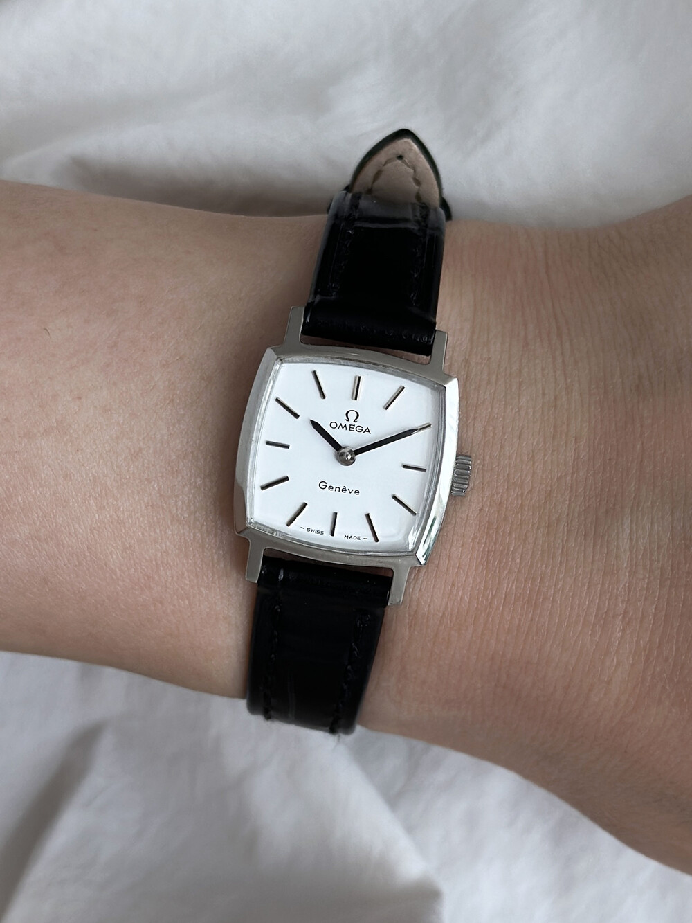 1972년도에 제작된 오메가 제네브 모델로 깔끔한 화이트 다이얼 위를 장식하는
