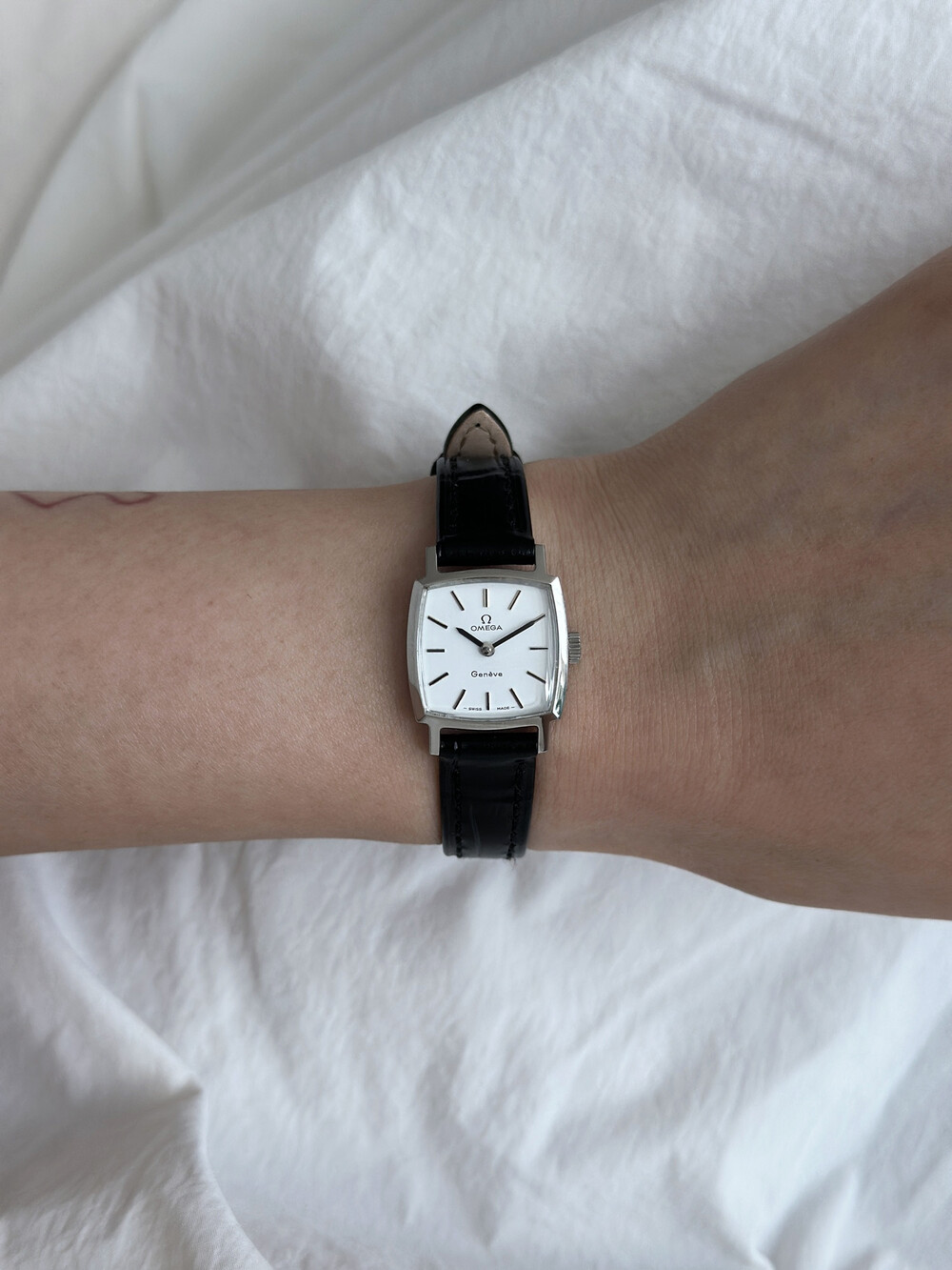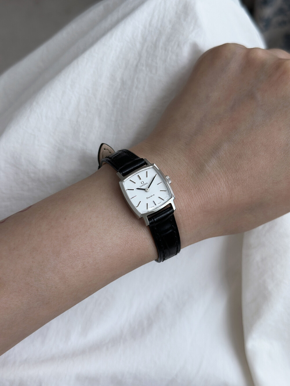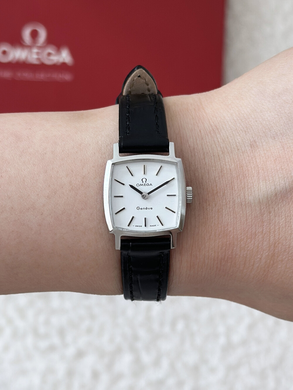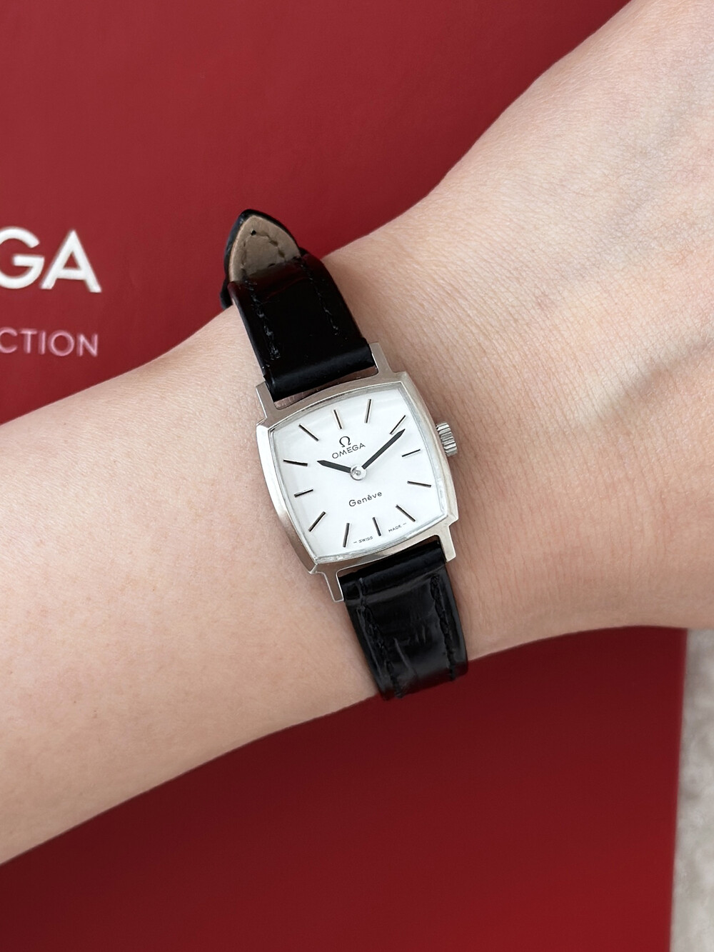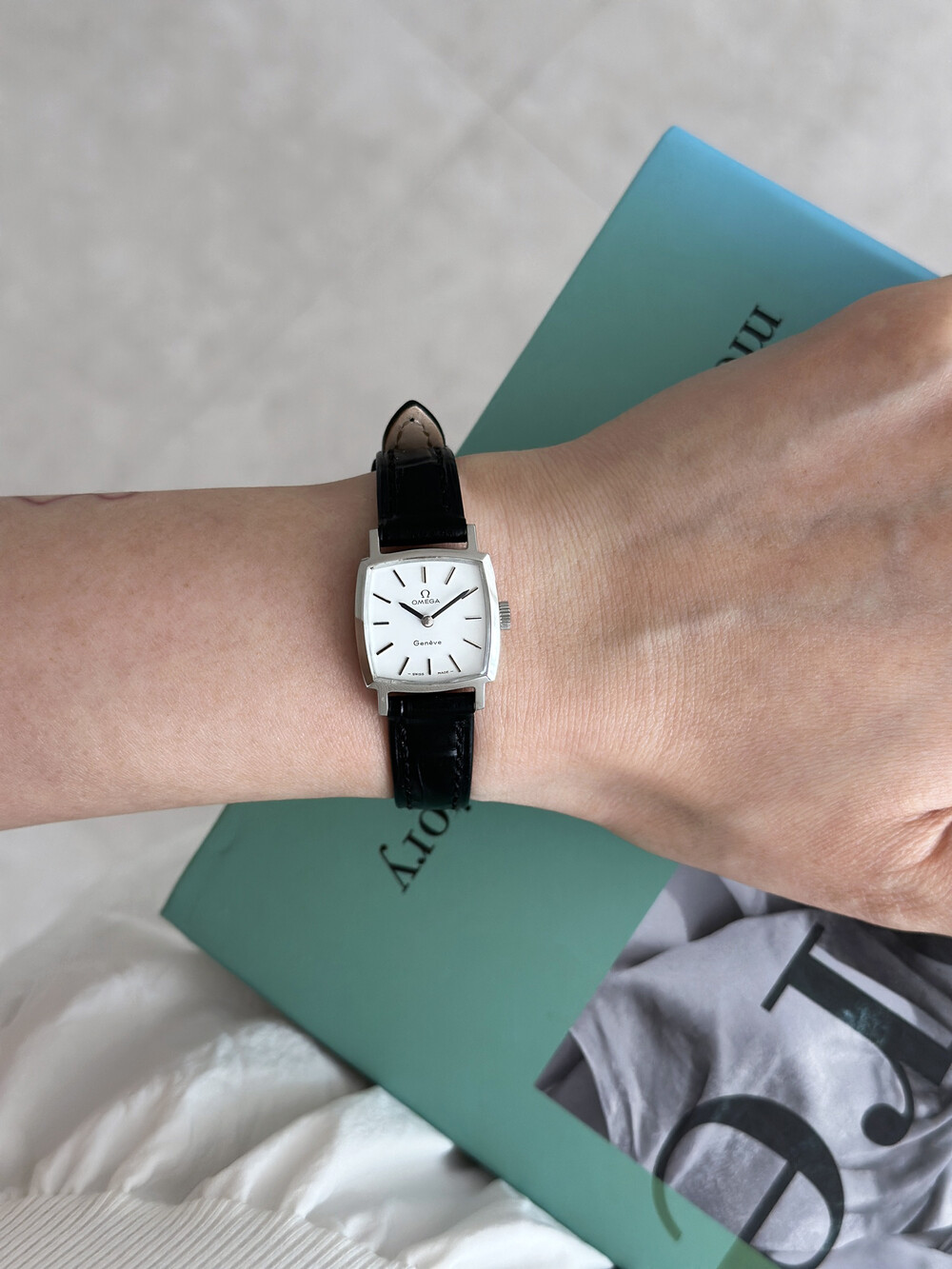 1972년도에 제작된 오메가 제네브 모델로 깔끔한 화이트 다이얼 위를 장식하는