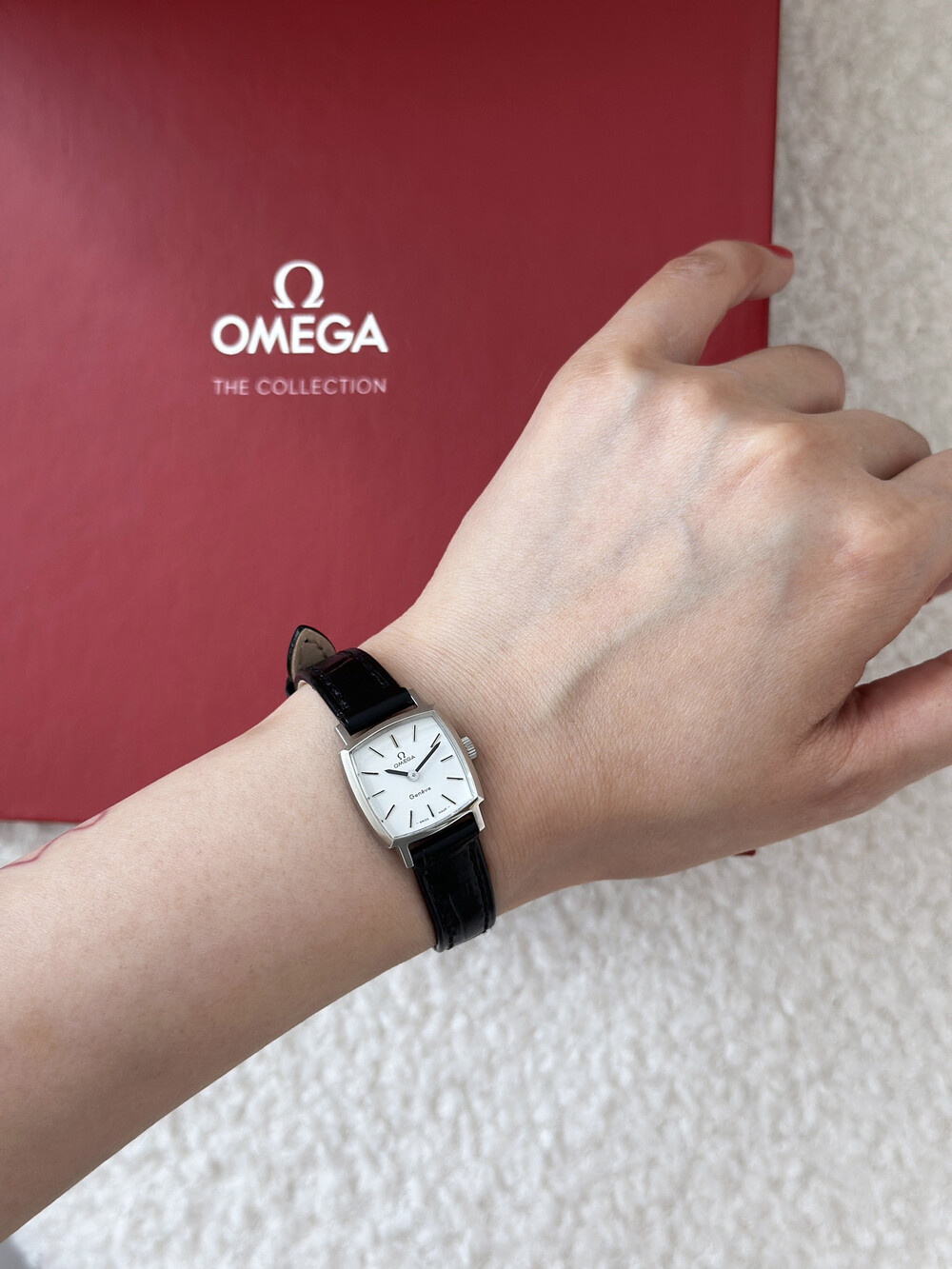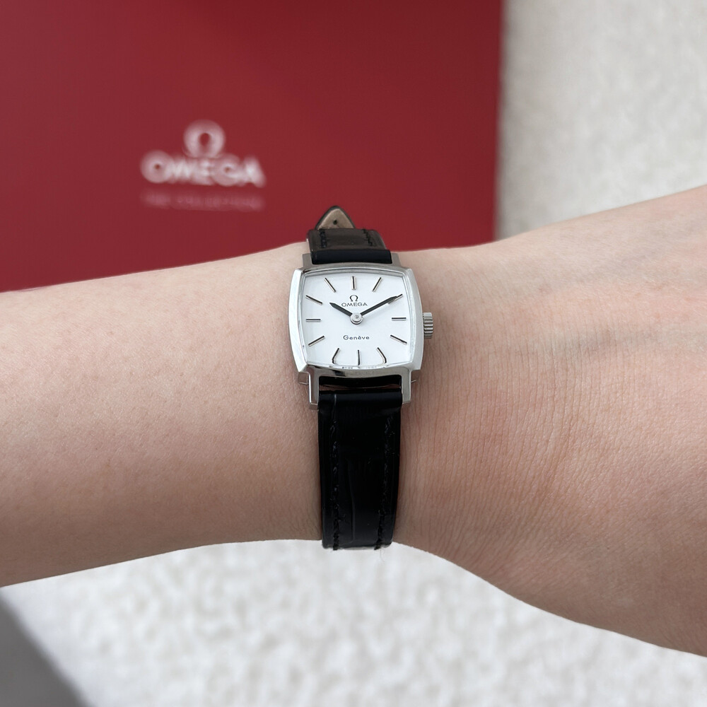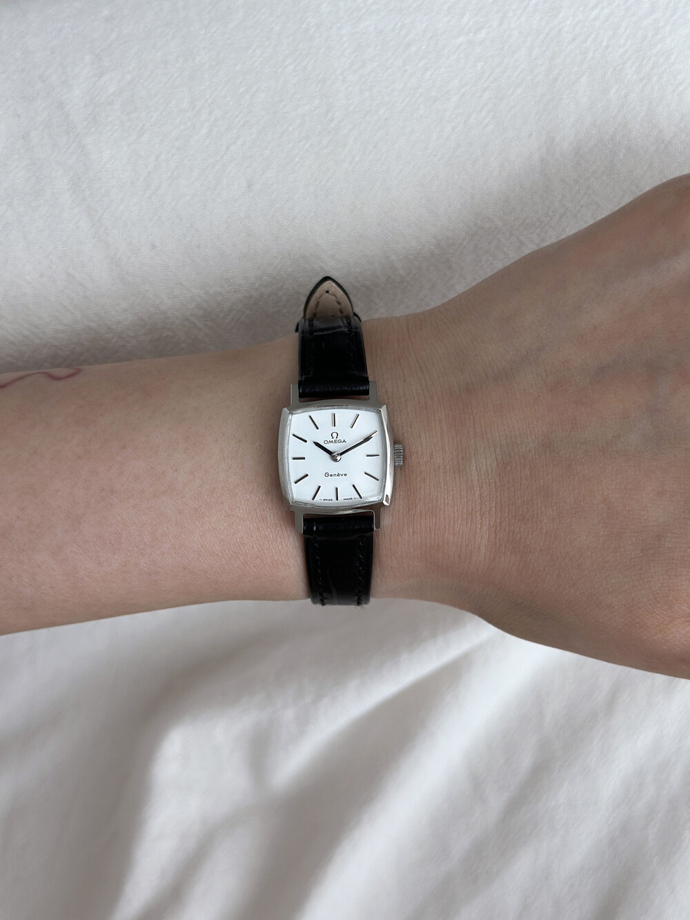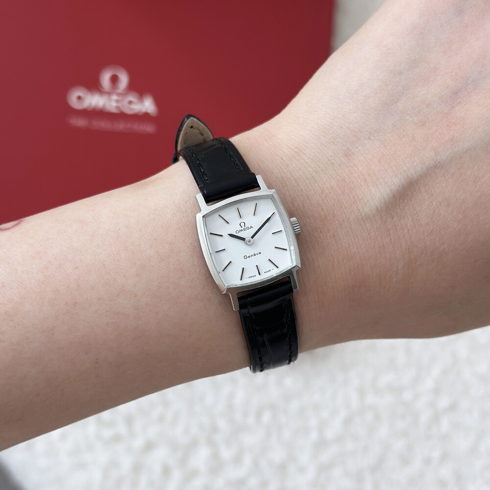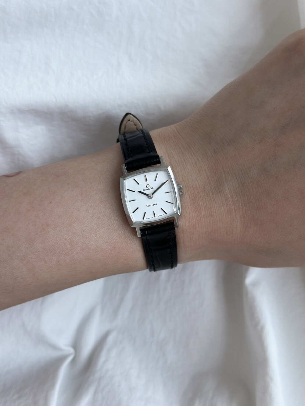 1972년도에 제작된 오메가 제네브 모델로 깔끔한 화이트 다이얼 위를 장식하는