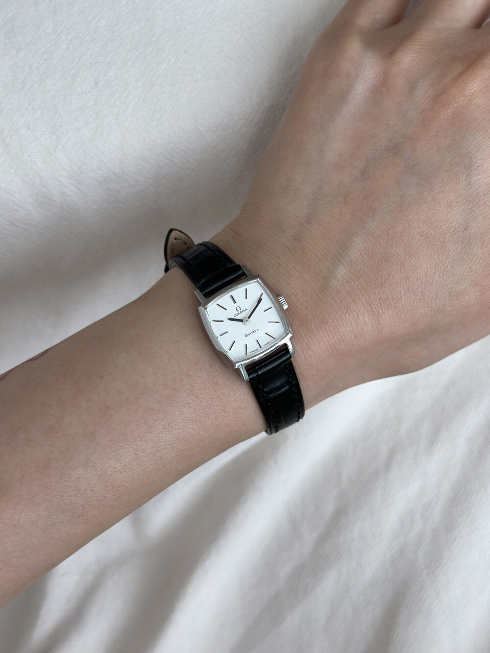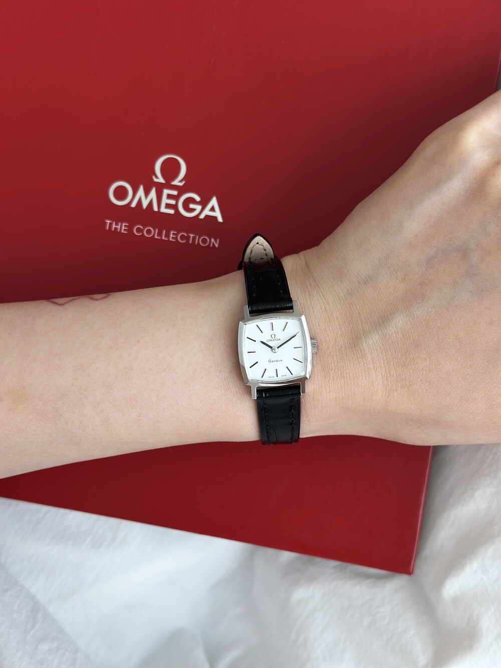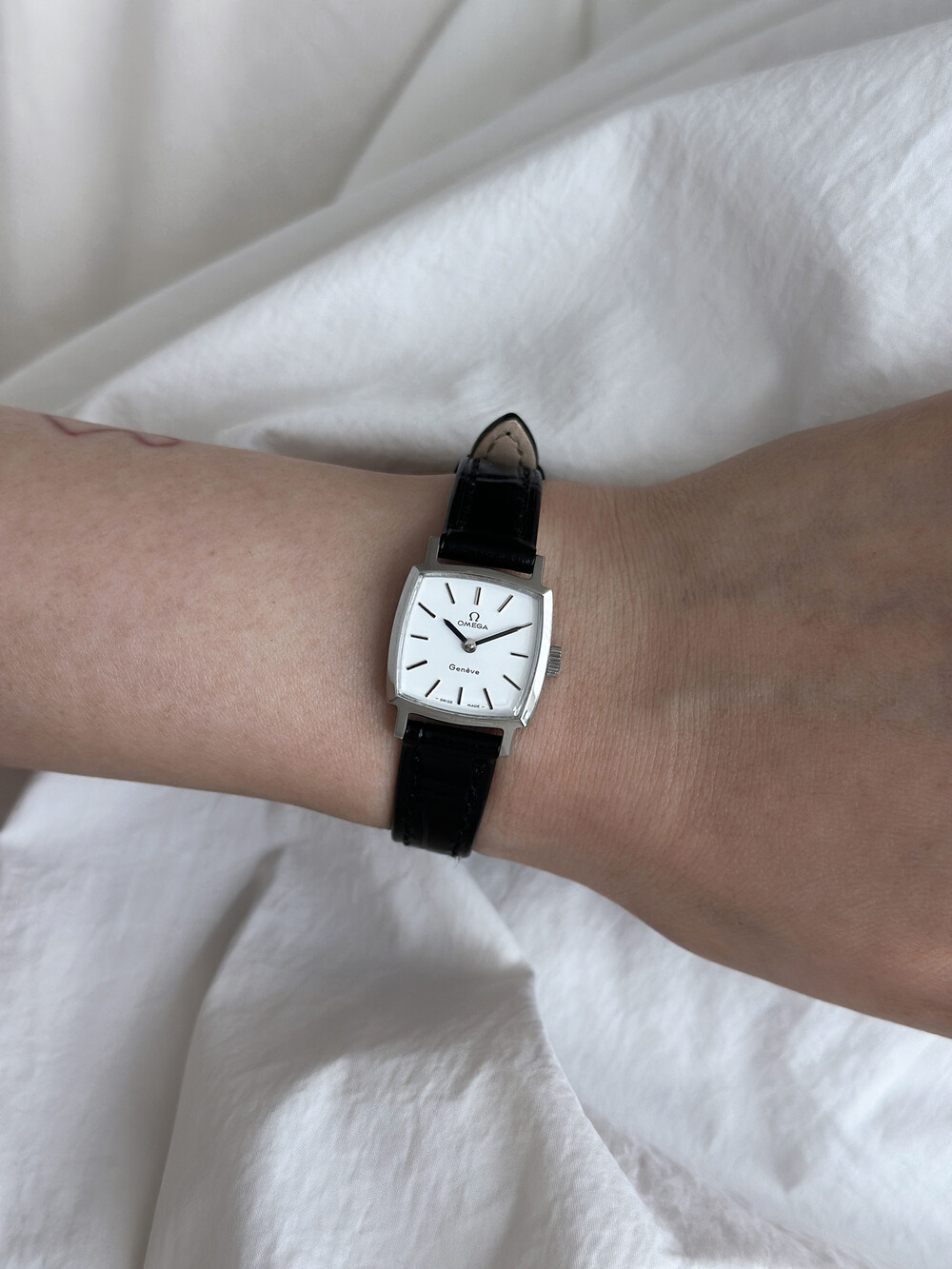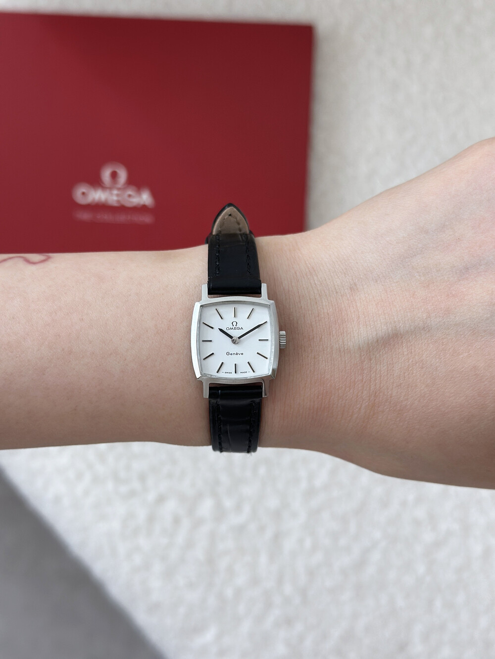 1972년도에 제작된 오메가 제네브 모델로 깔끔한 화이트 다이얼 위를 장식하는