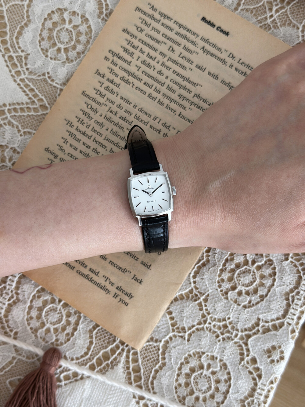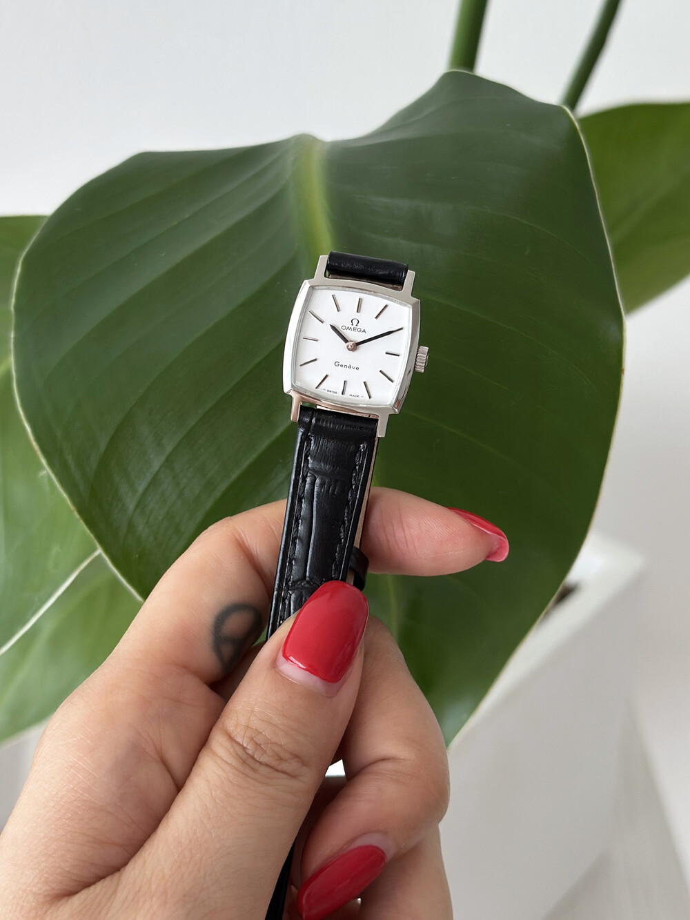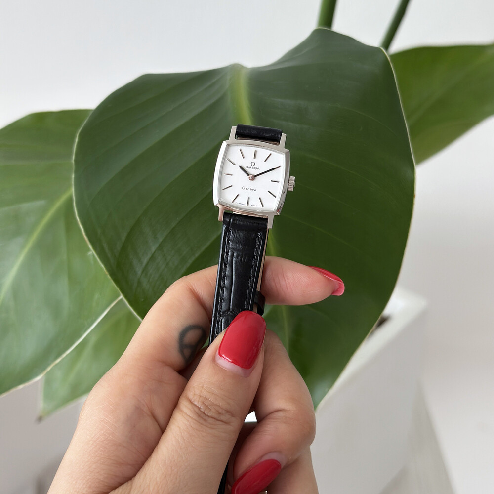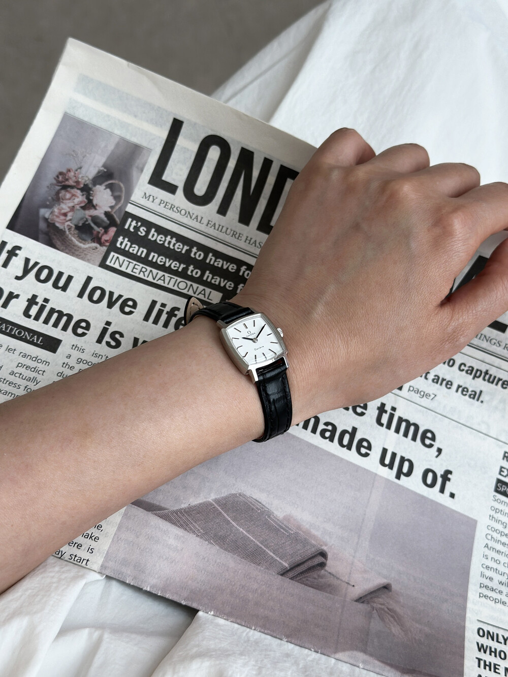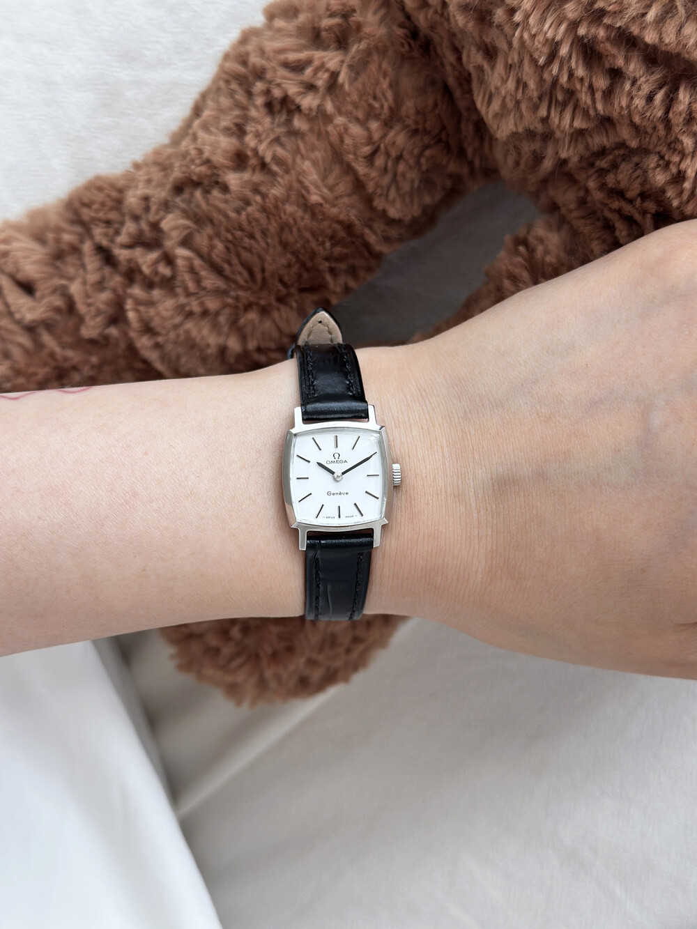 1972년도에 제작된 오메가 제네브 모델로 깔끔한 화이트 다이얼 위를 장식하는