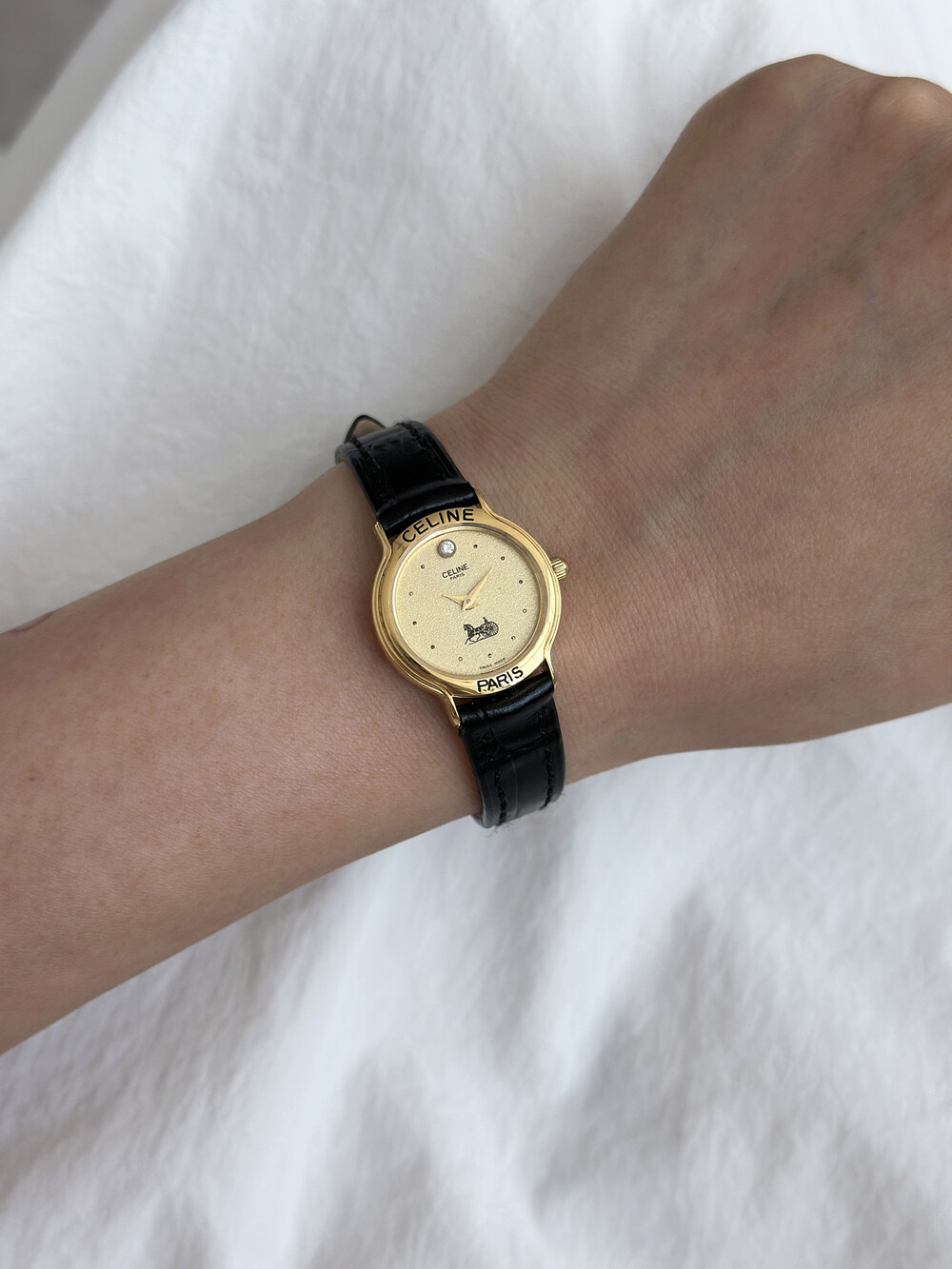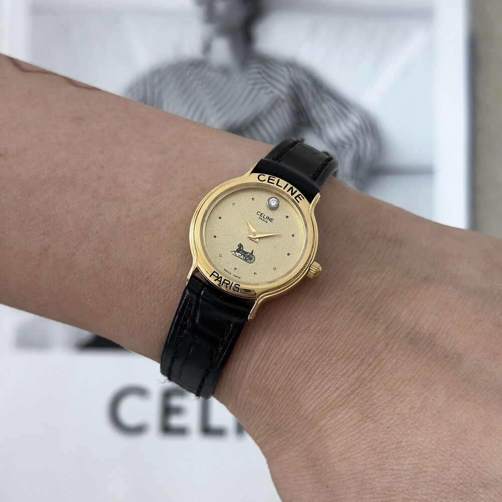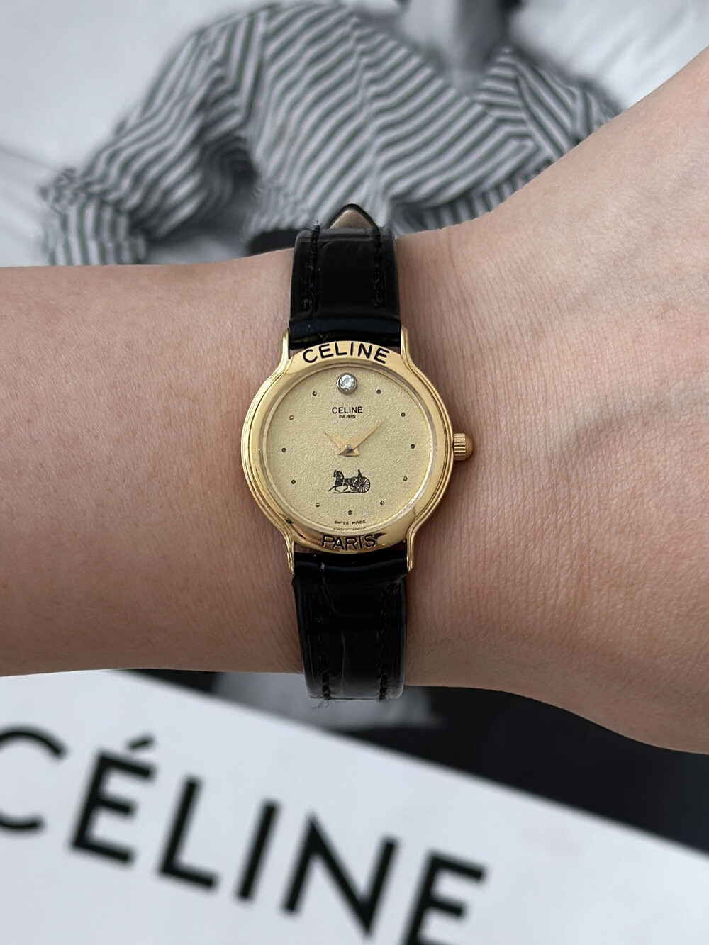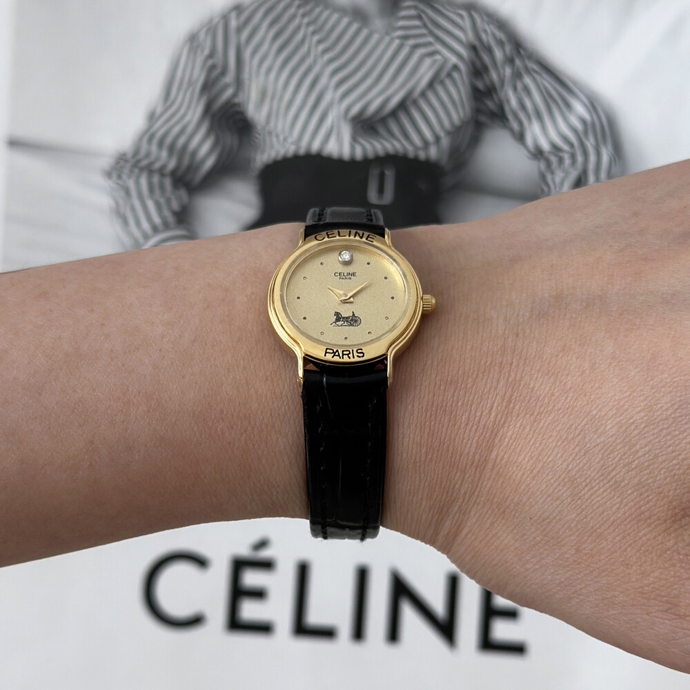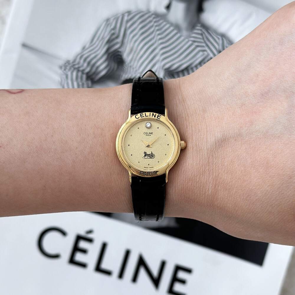 부드러운 골드 톤 케이스와 다이얼 위를 장식하는 셀린느 시그니처 마차 심볼이 매력적인 모델입니다.