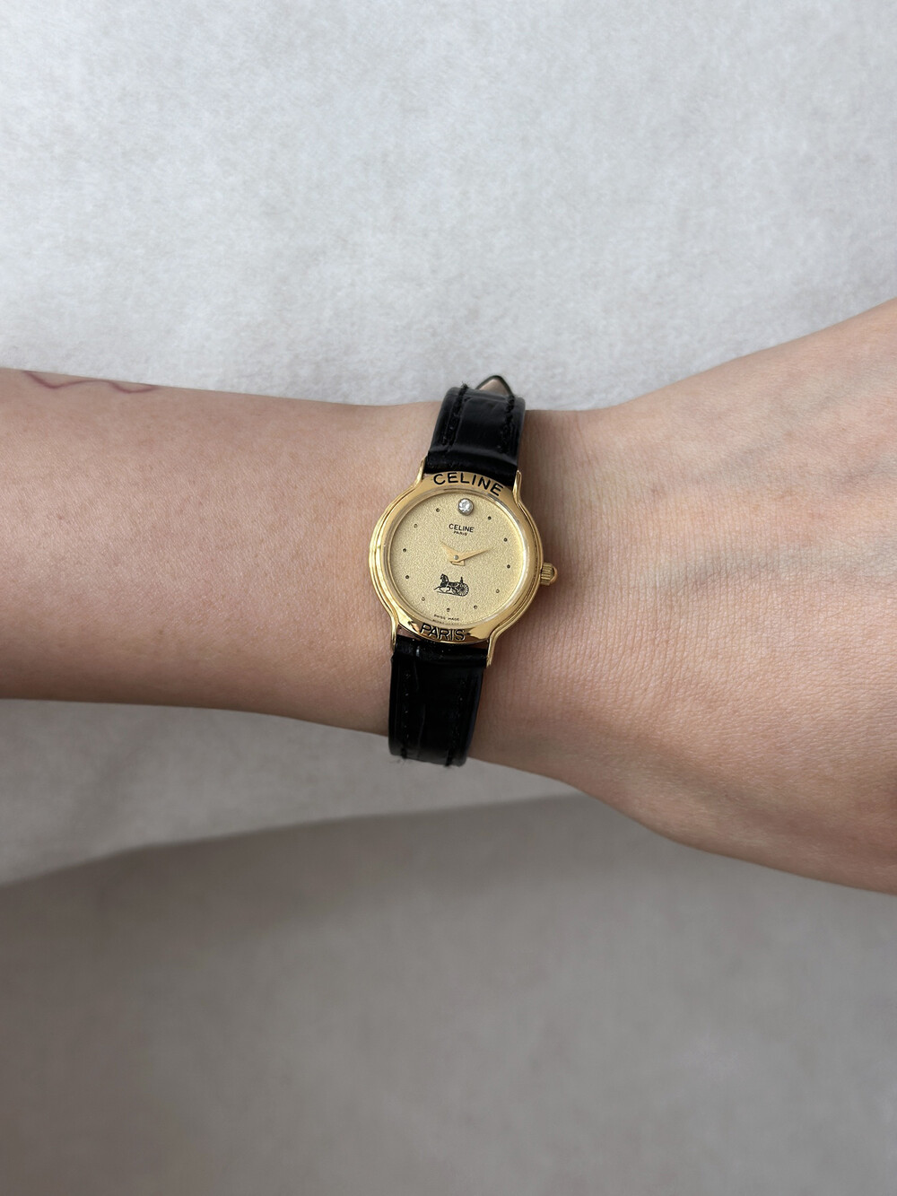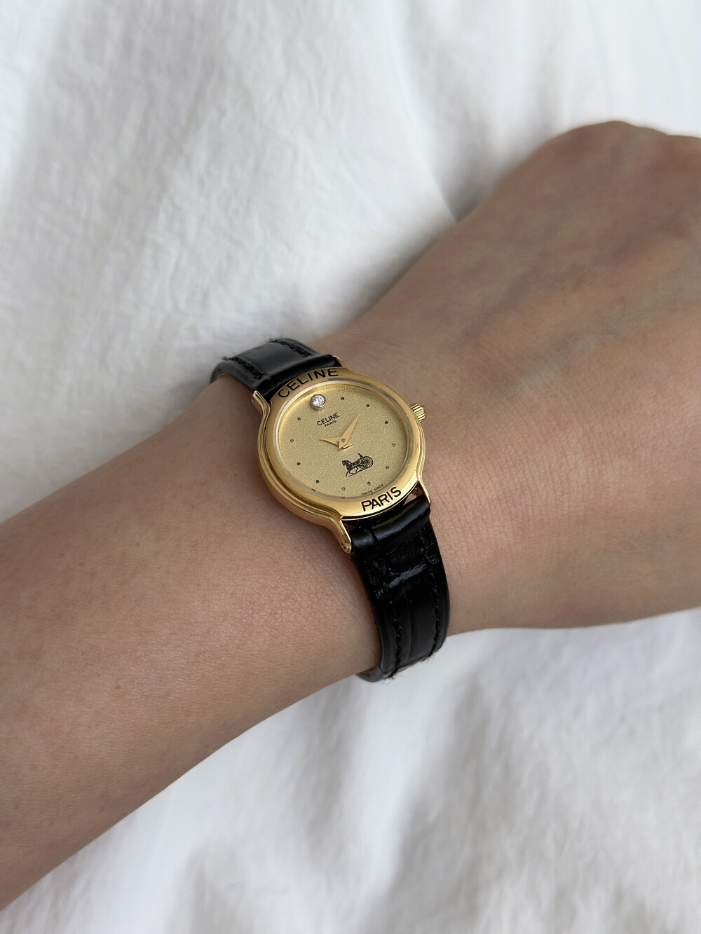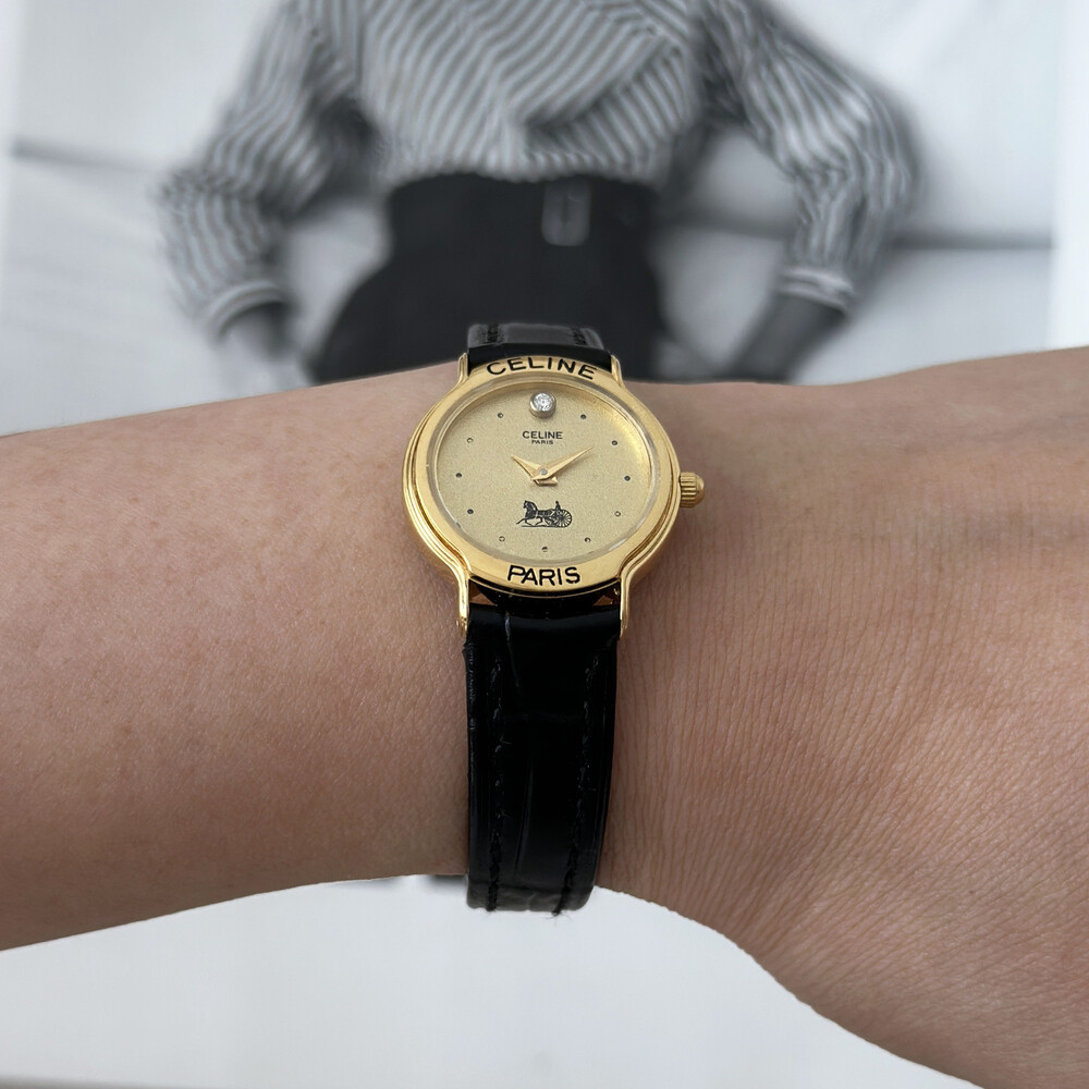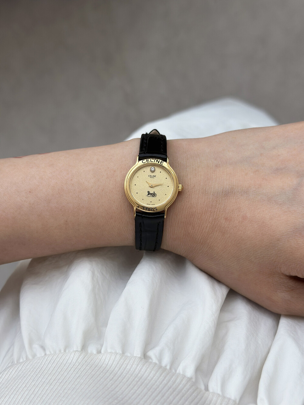 부드러운 골드 톤 케이스와 다이얼 위를 장식하는 셀린느 시그니처 마차 심볼이 매력적인 모델입니다.