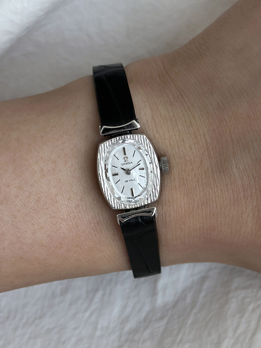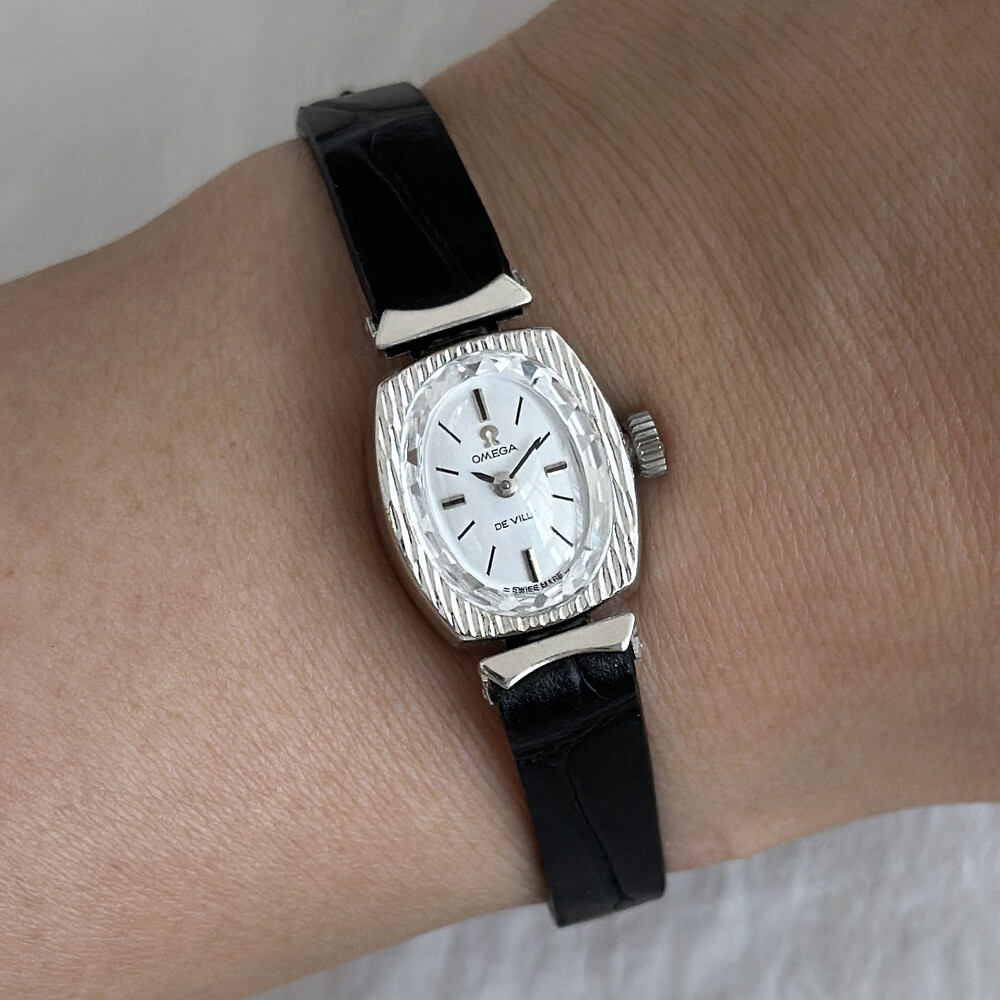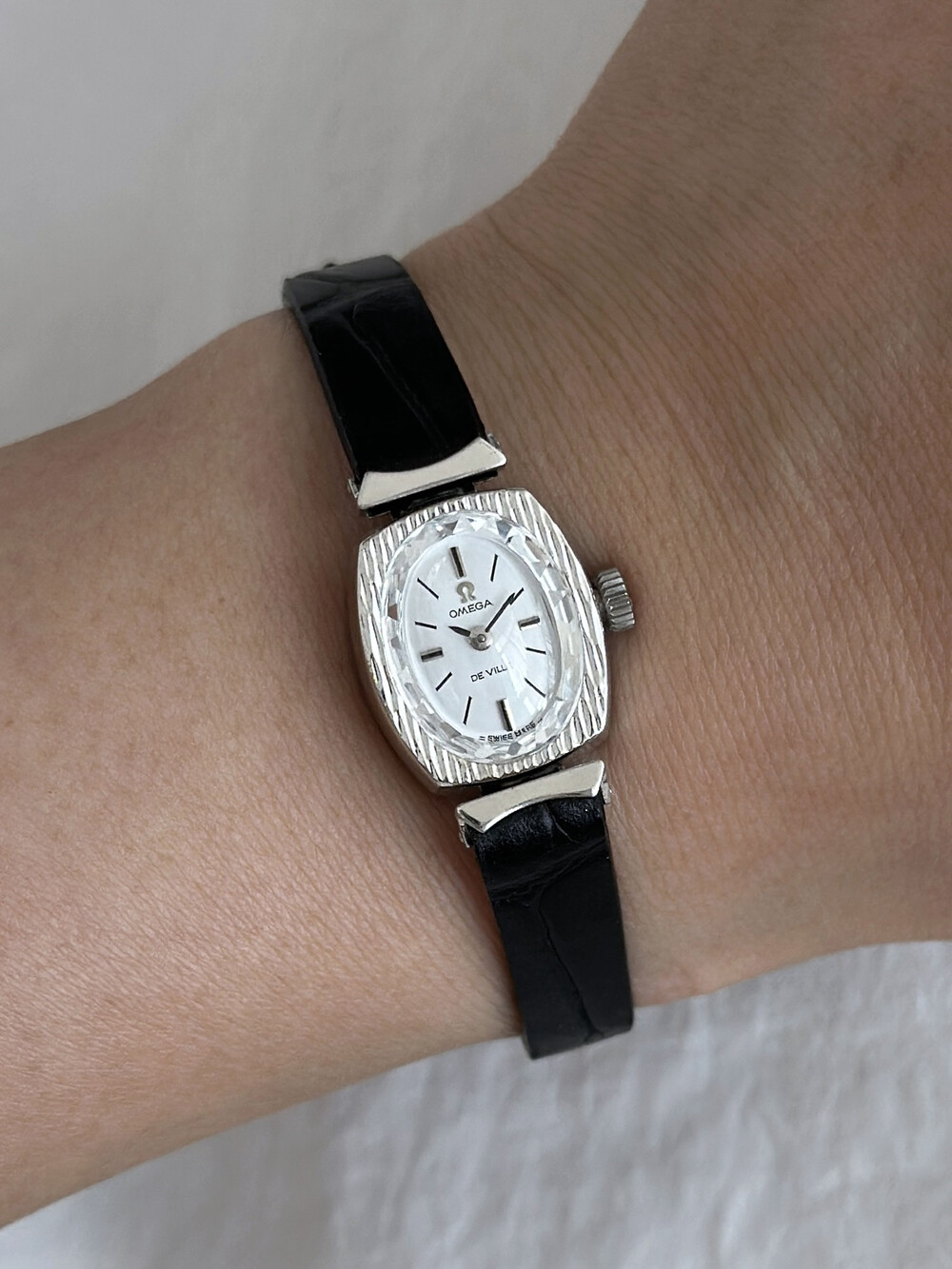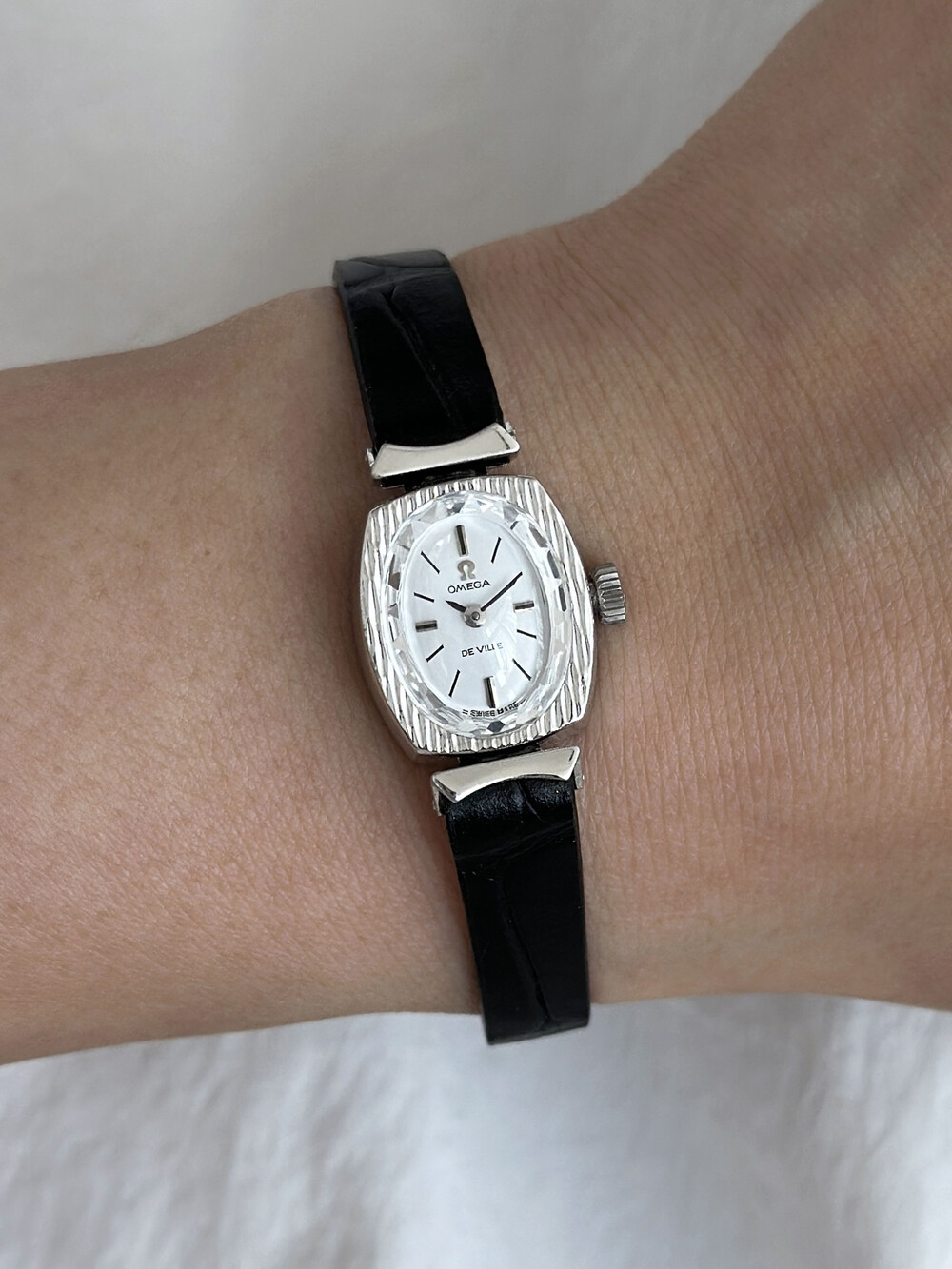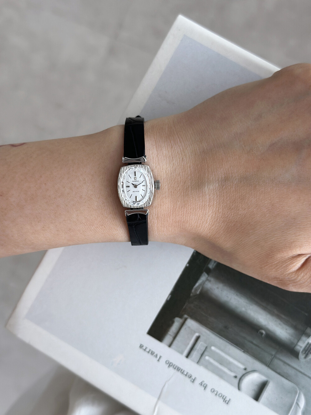 1969년도에 제작된 오메가 드빌 모델로 깔끔한 화이트 다이얼 위를 장식하는
