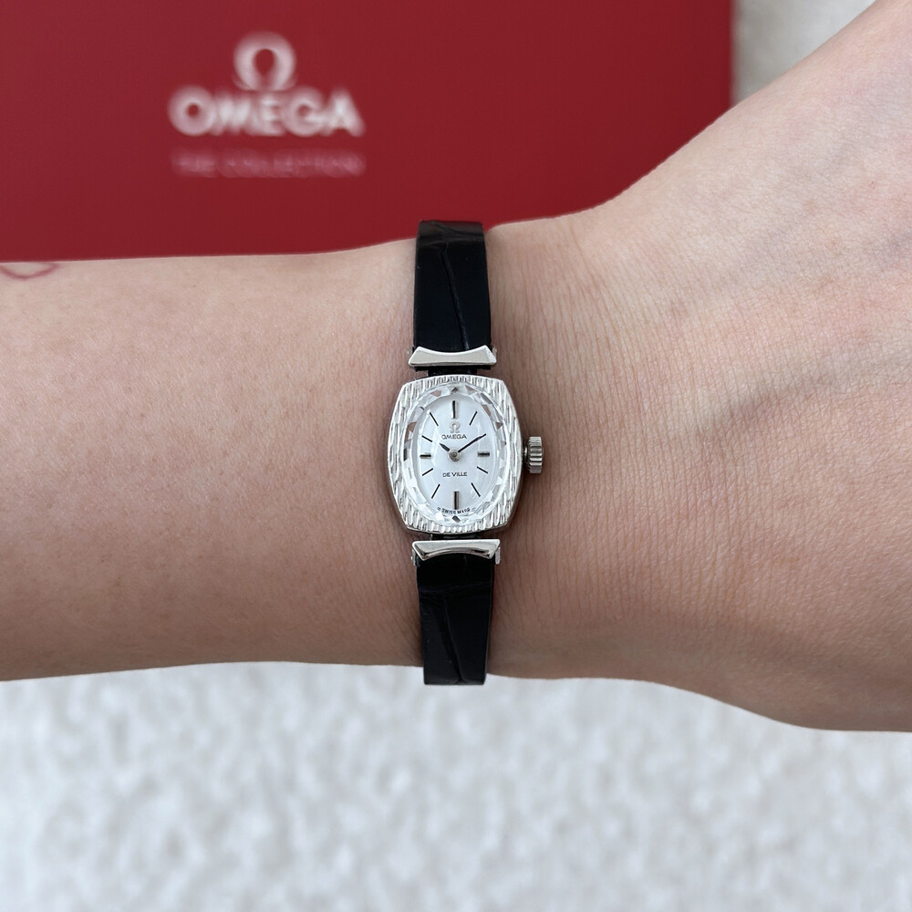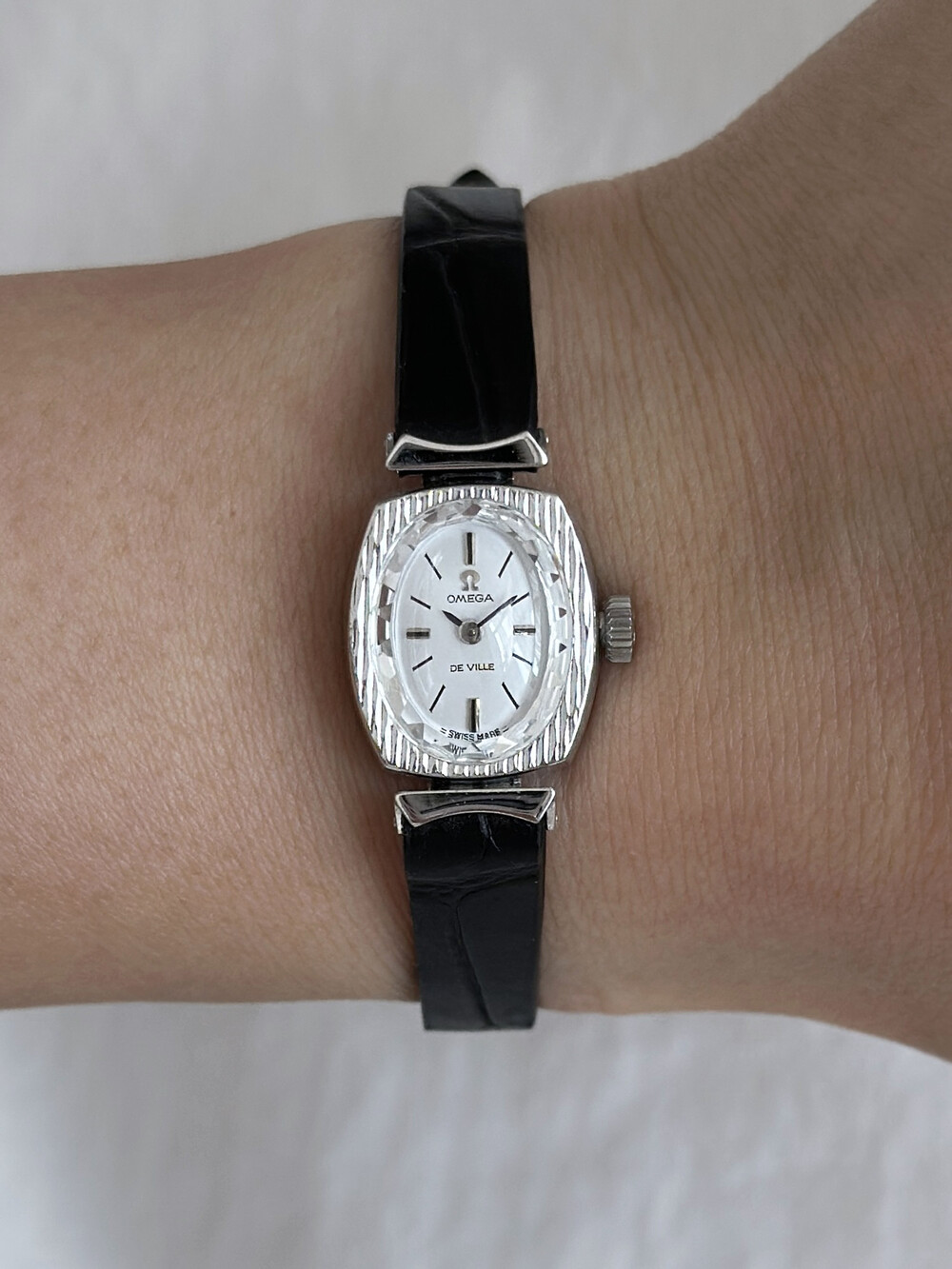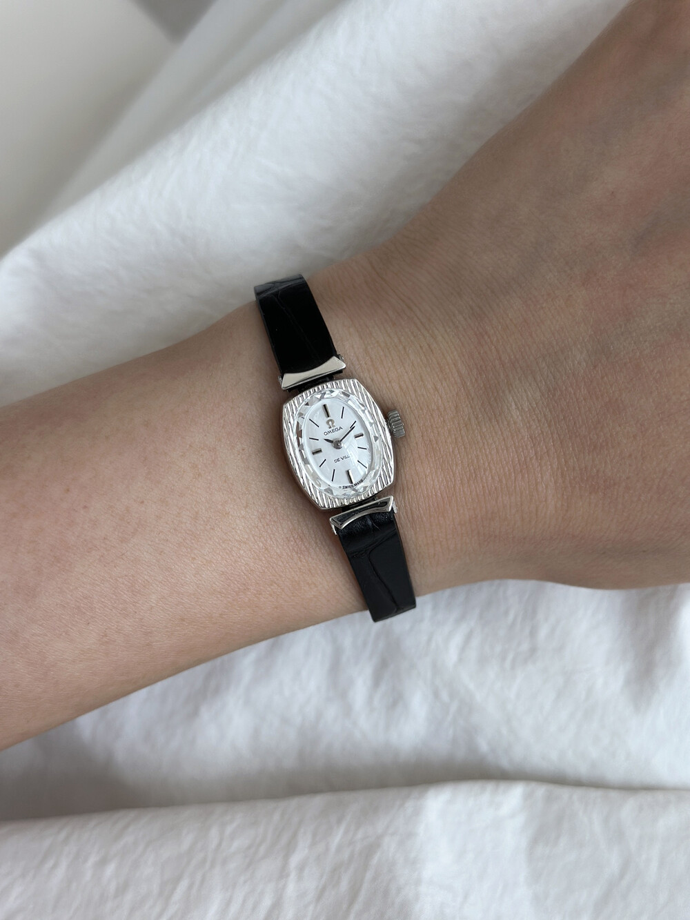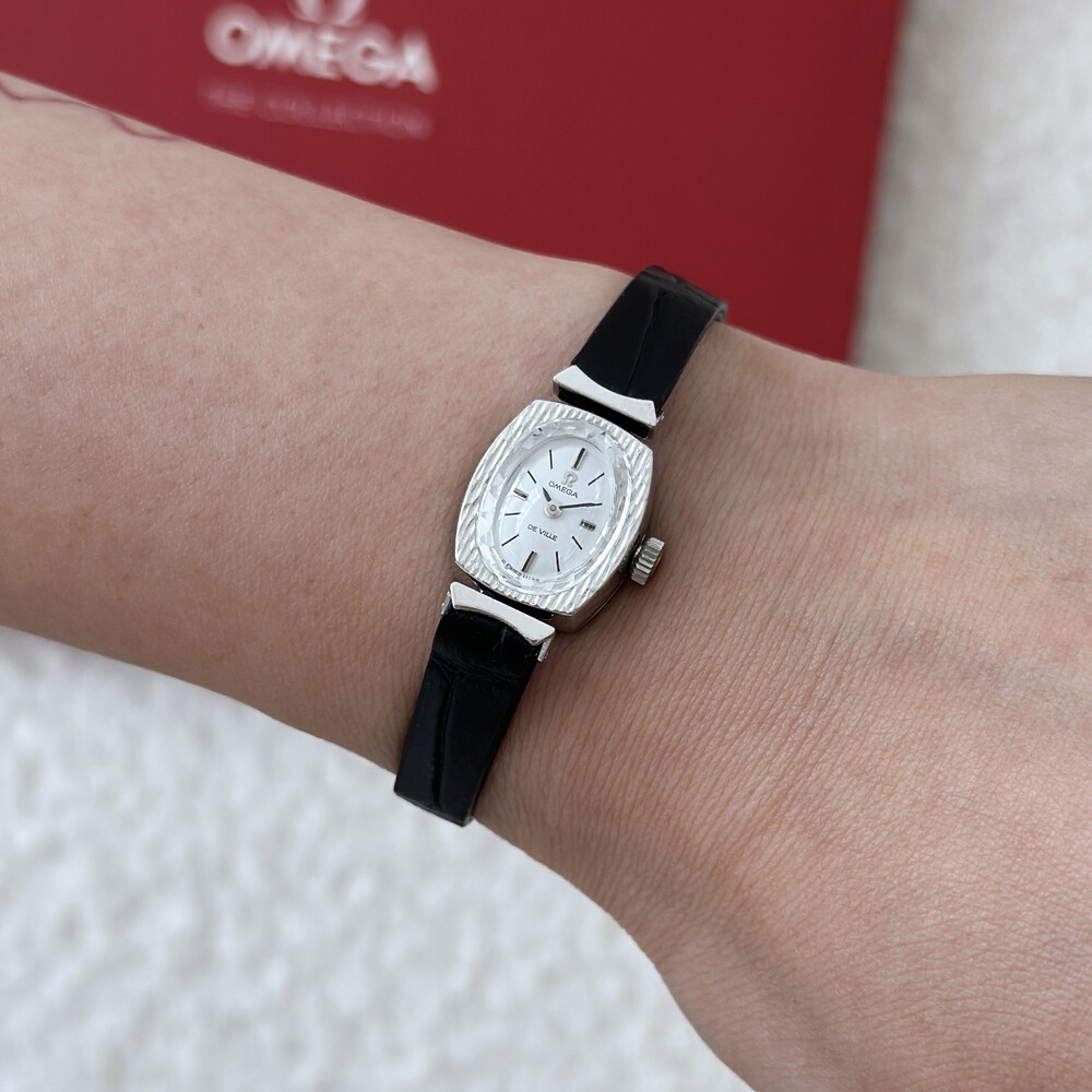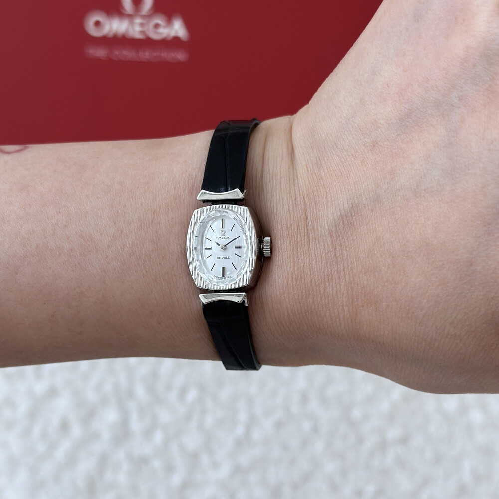 1969년도에 제작된 오메가 드빌 모델로 깔끔한 화이트 다이얼 위를 장식하는