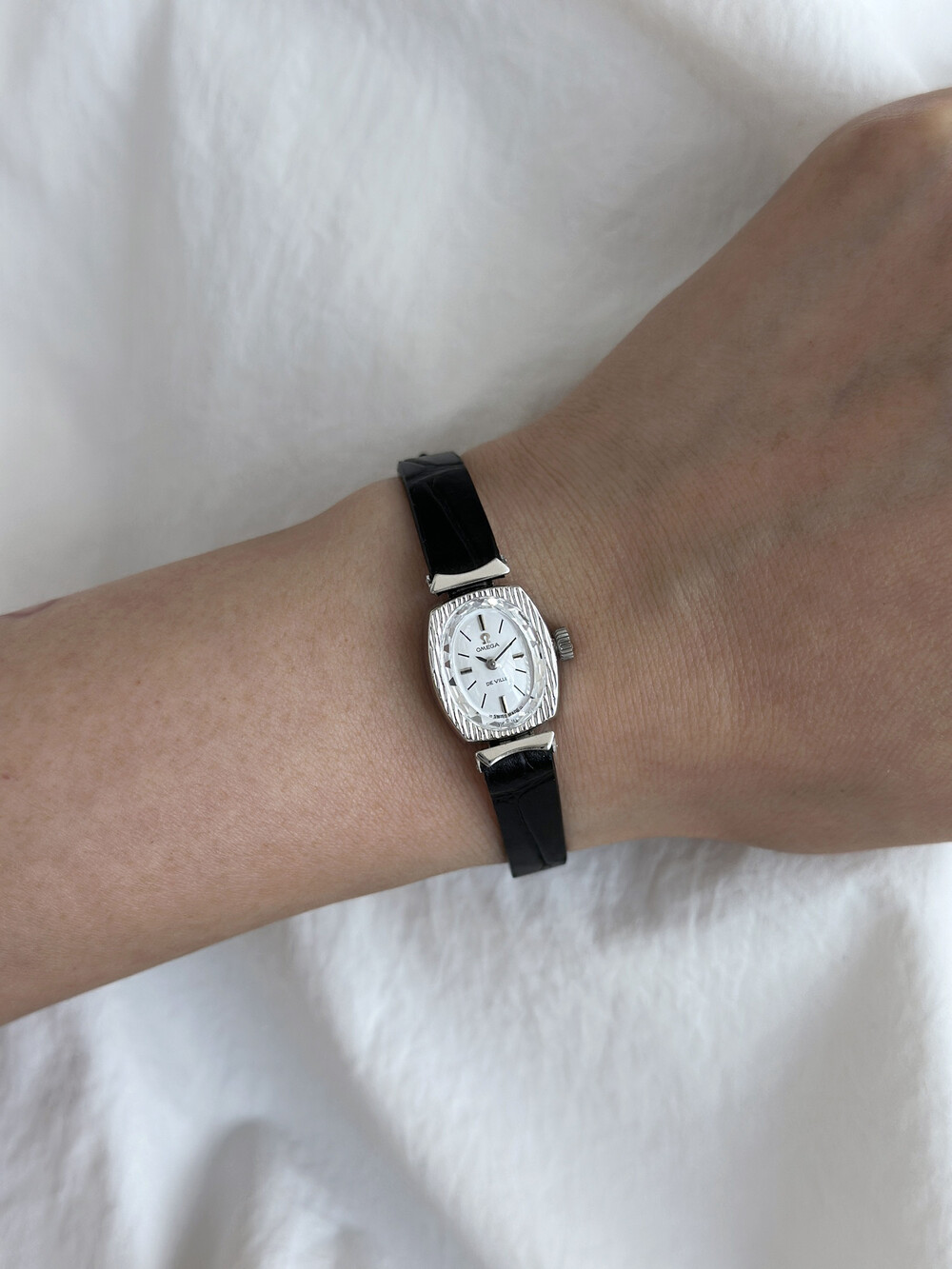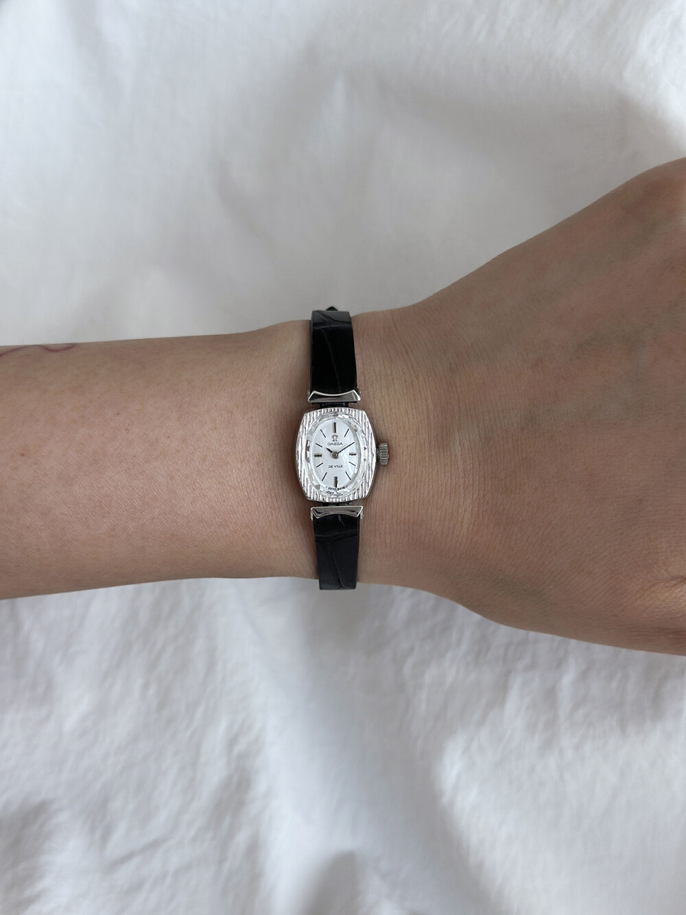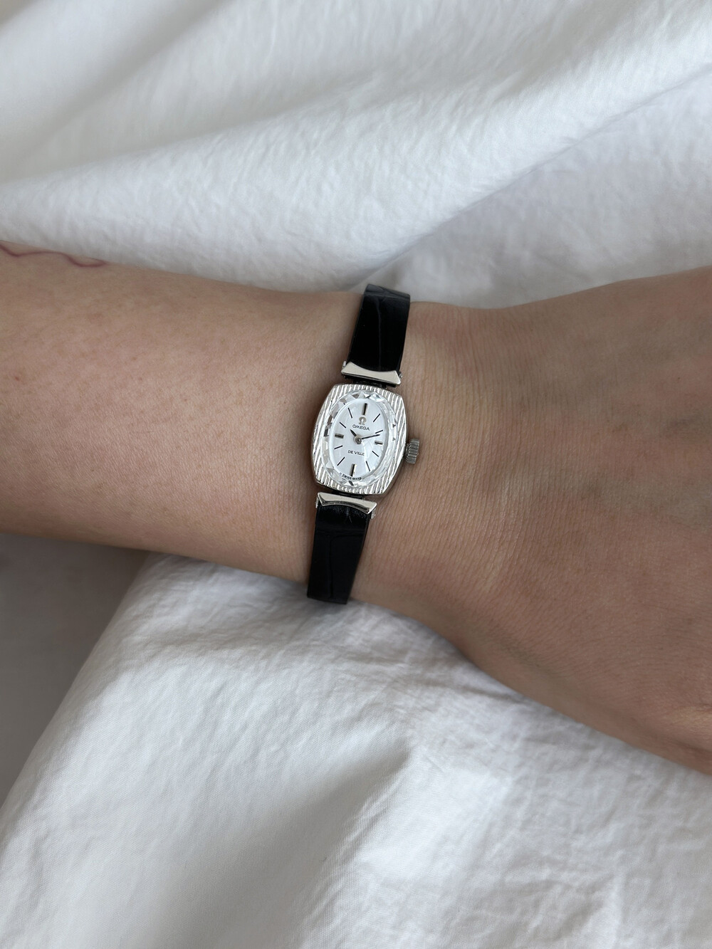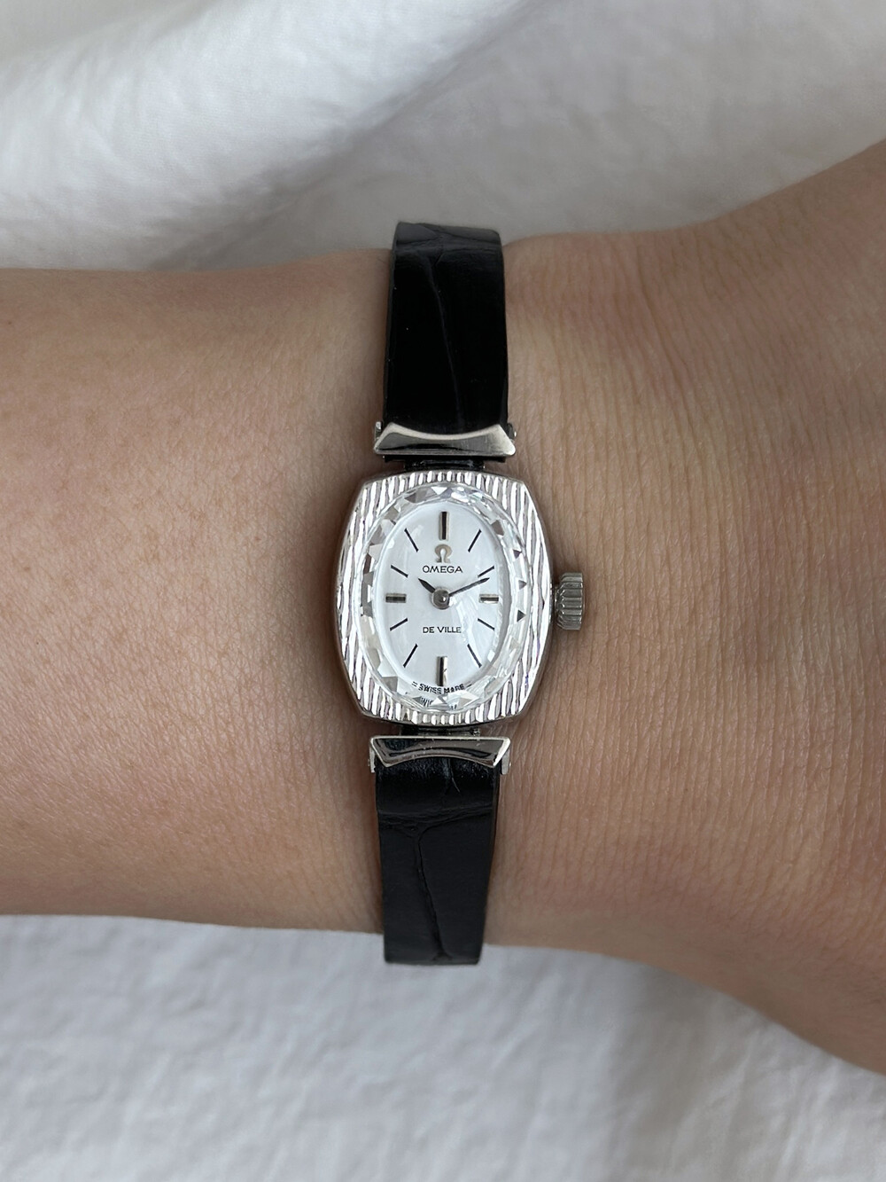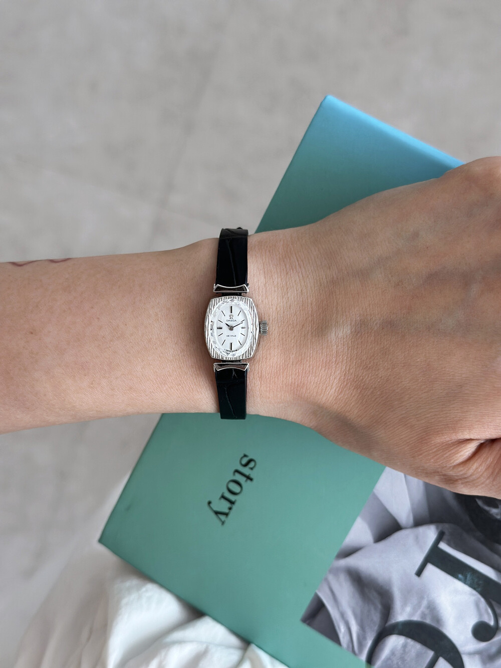 1969년도에 제작된 오메가 드빌 모델로 깔끔한 화이트 다이얼 위를 장식하는
