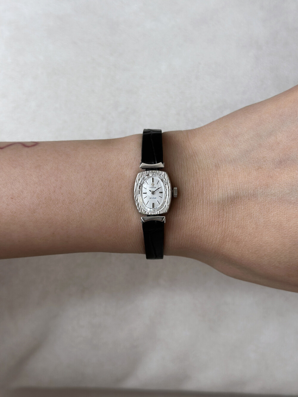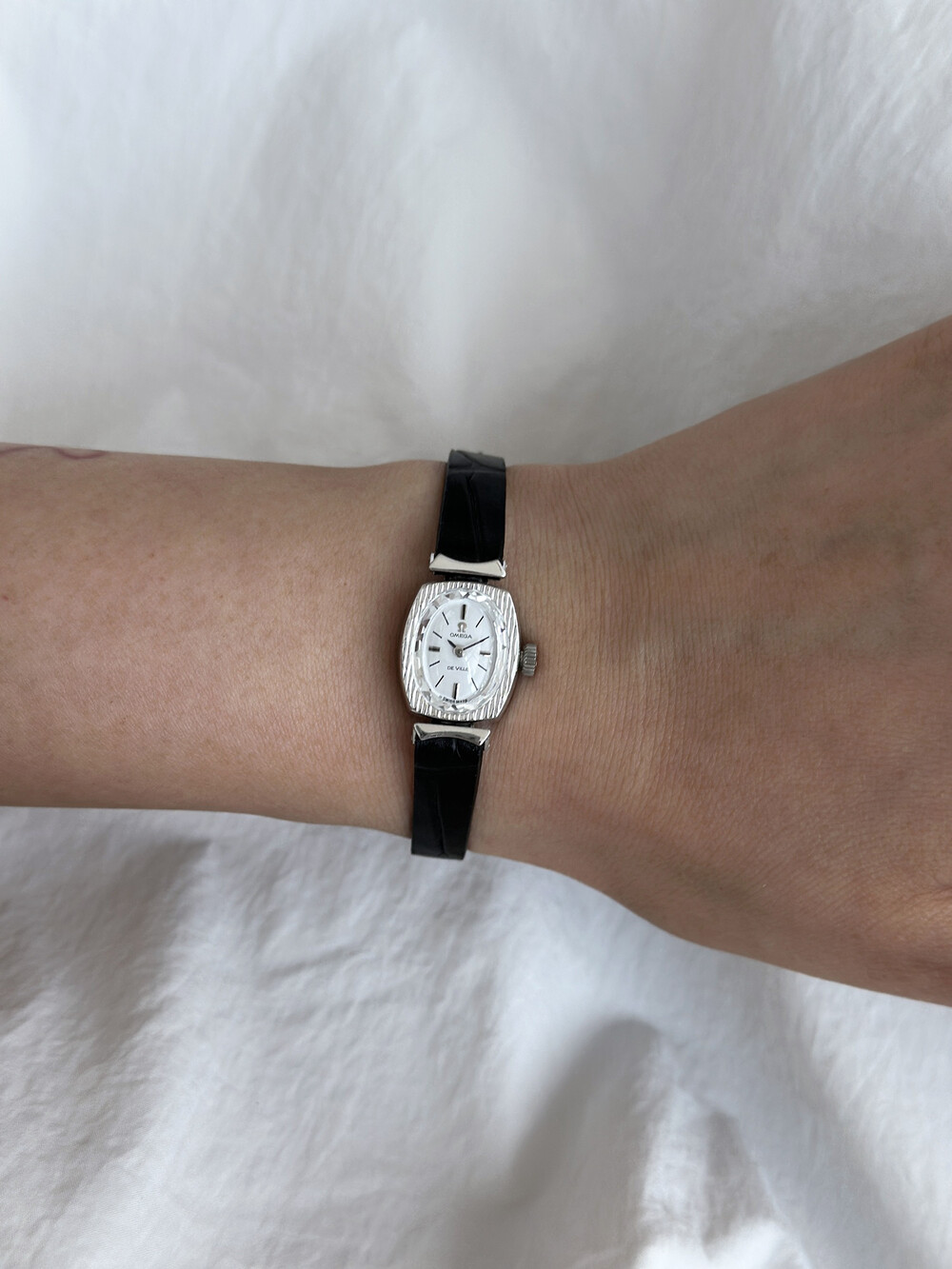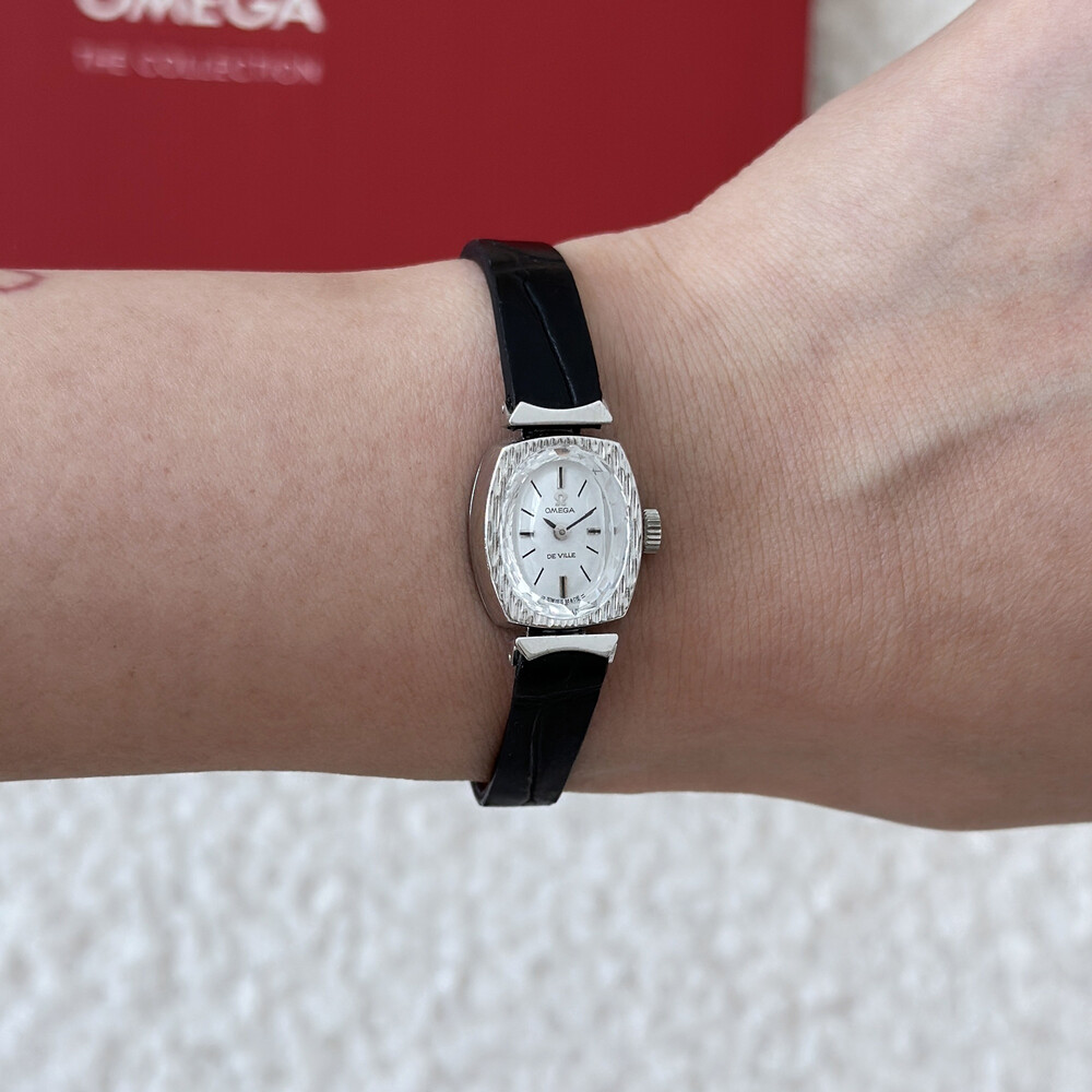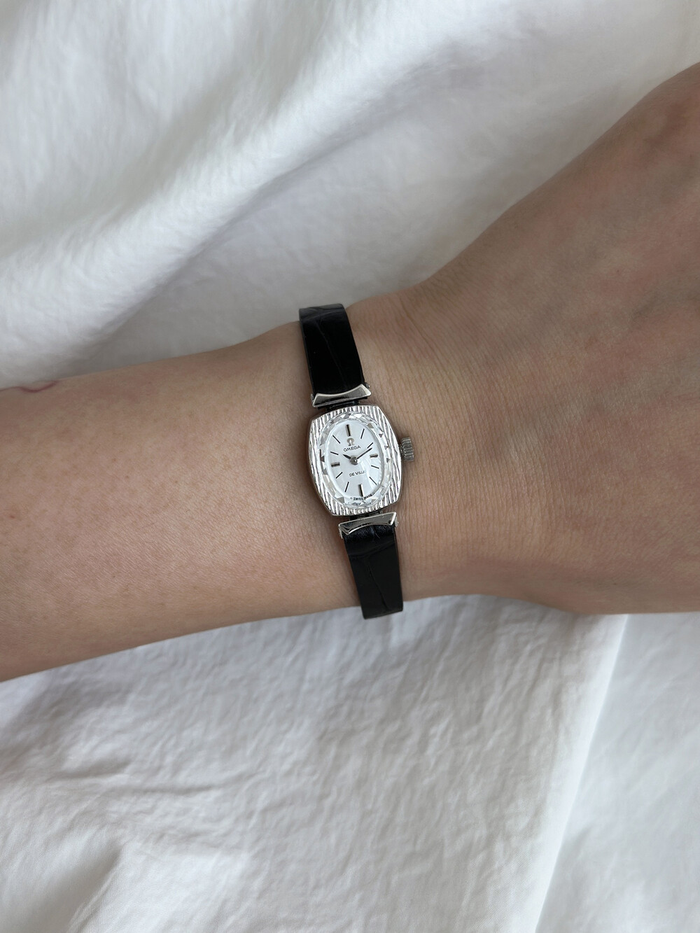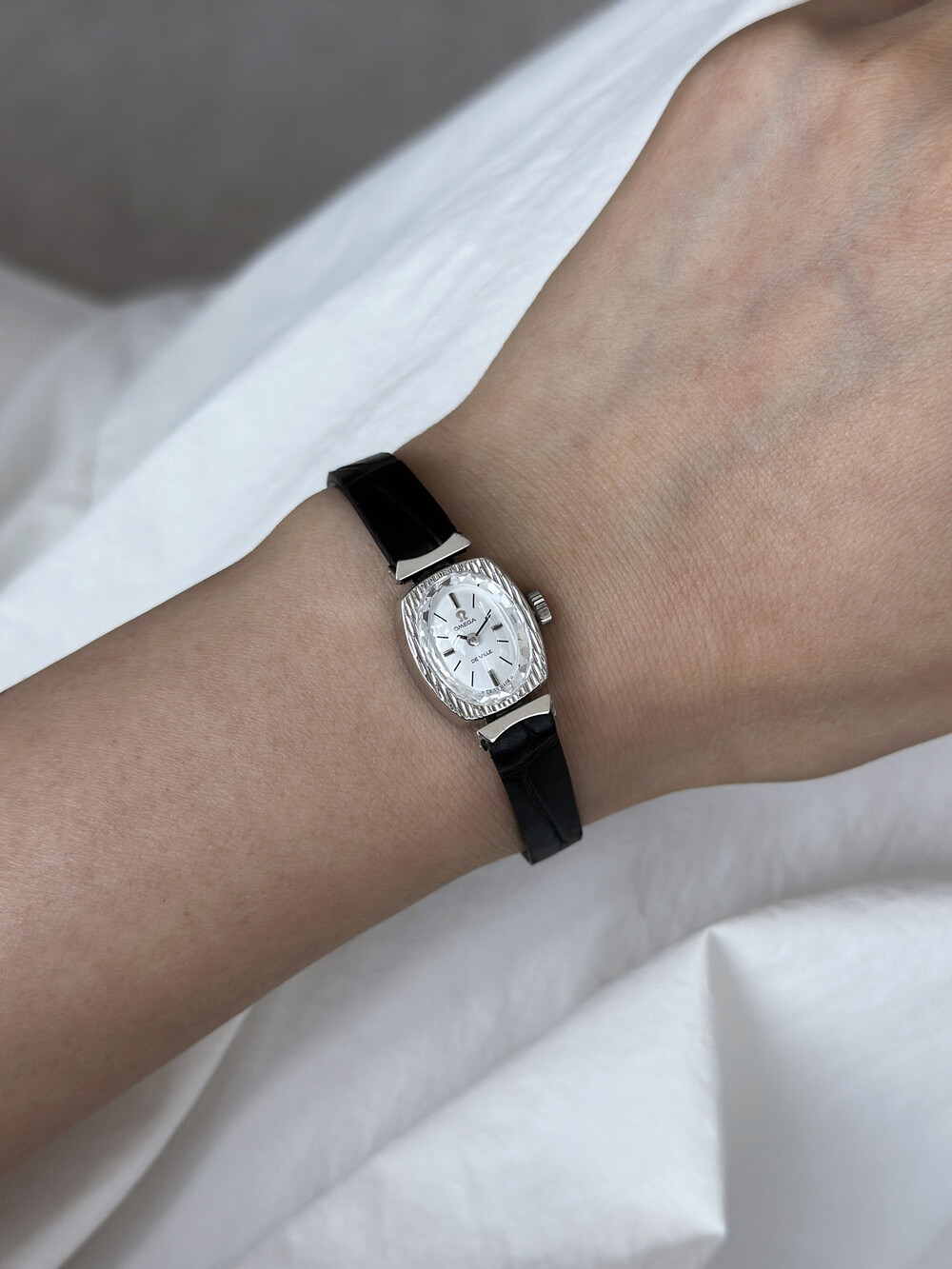 1969년도에 제작된 오메가 드빌 모델로 깔끔한 화이트 다이얼 위를 장식하는