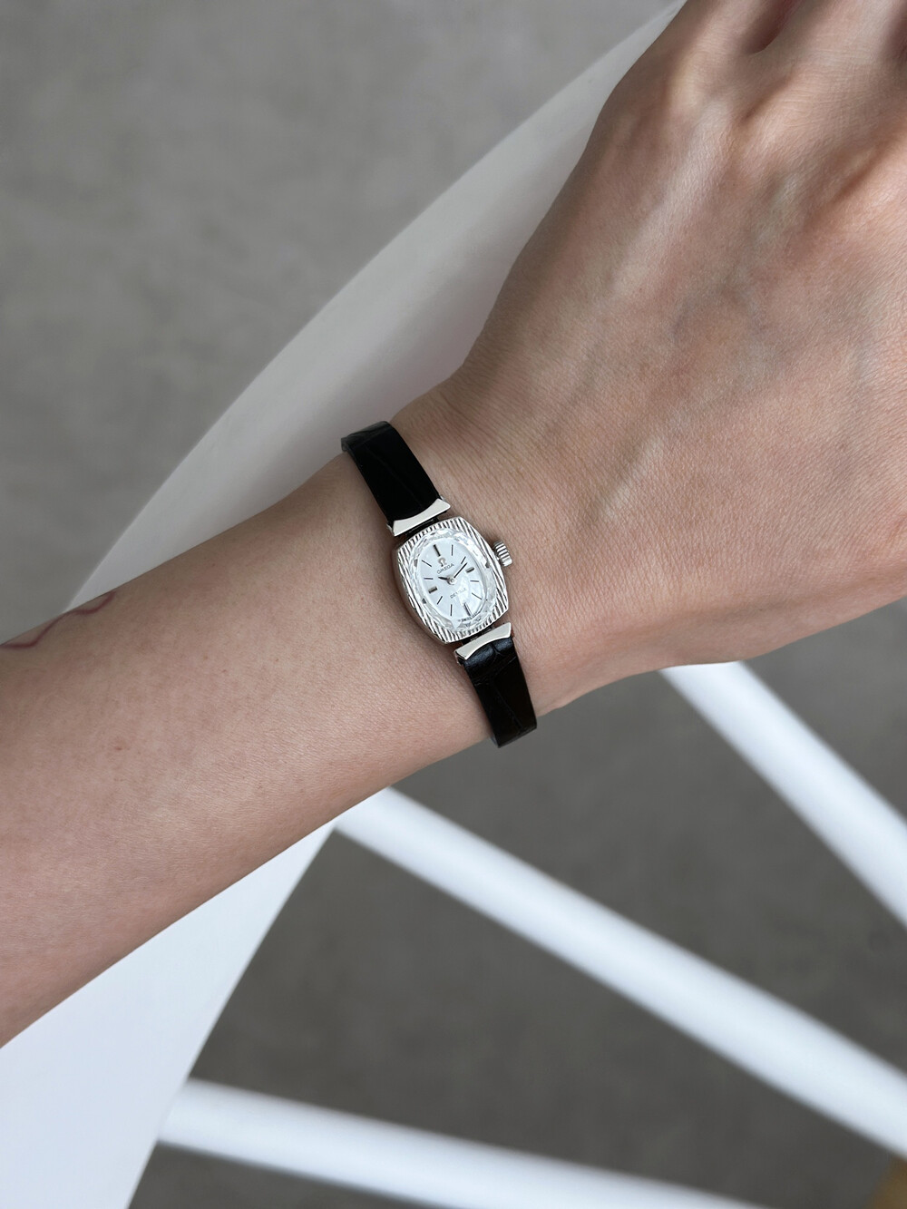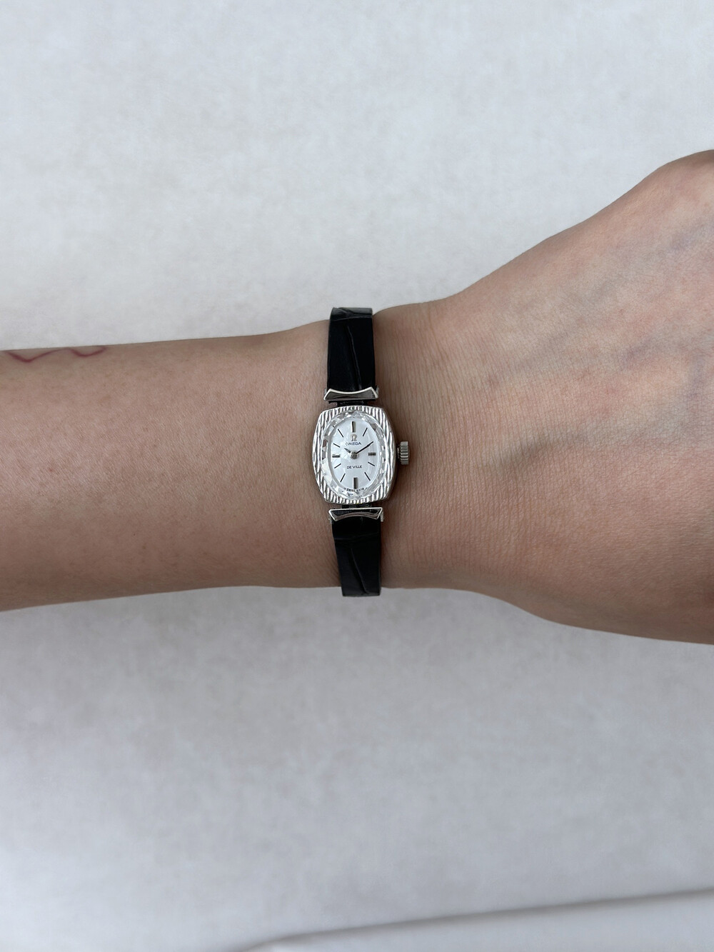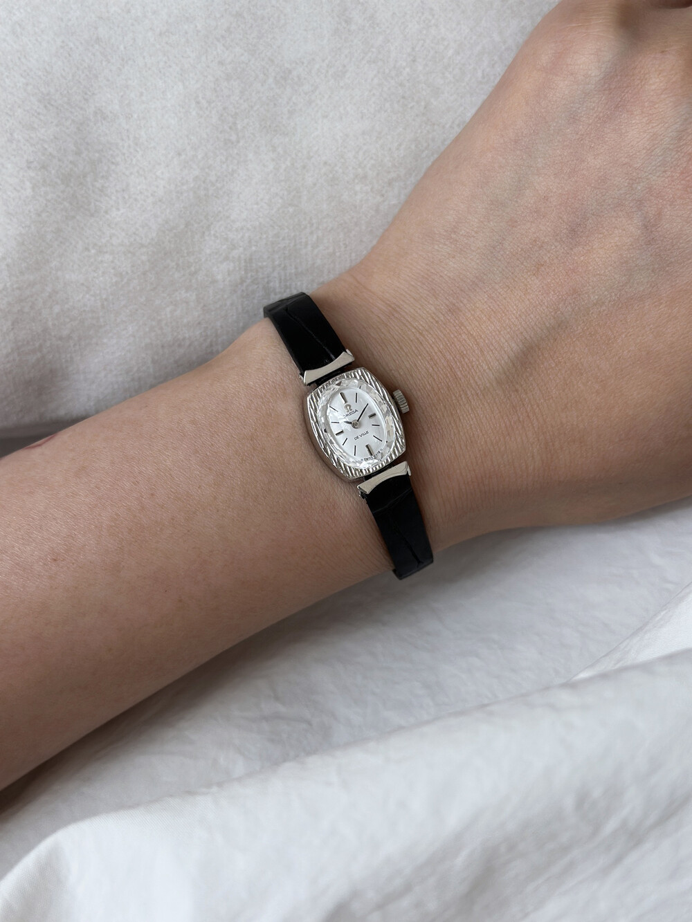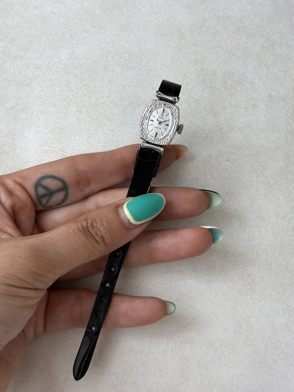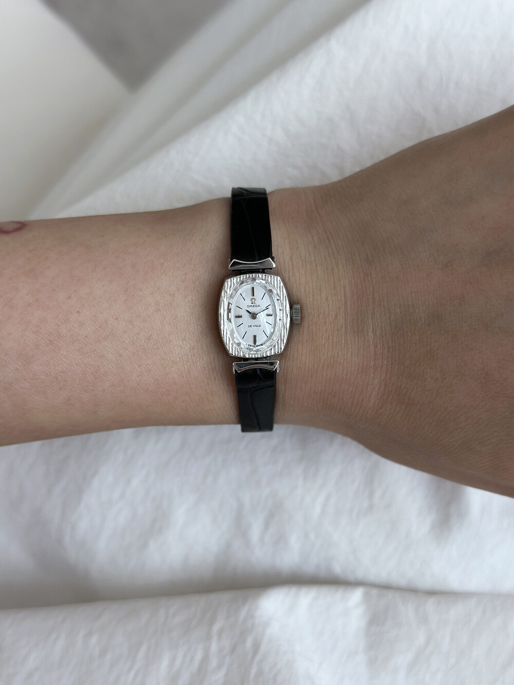 1969년도에 제작된 오메가 드빌 모델로 깔끔한 화이트 다이얼 위를 장식하는