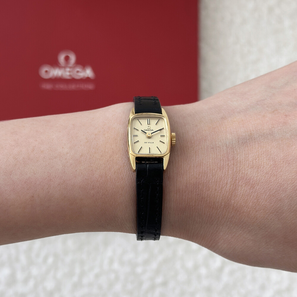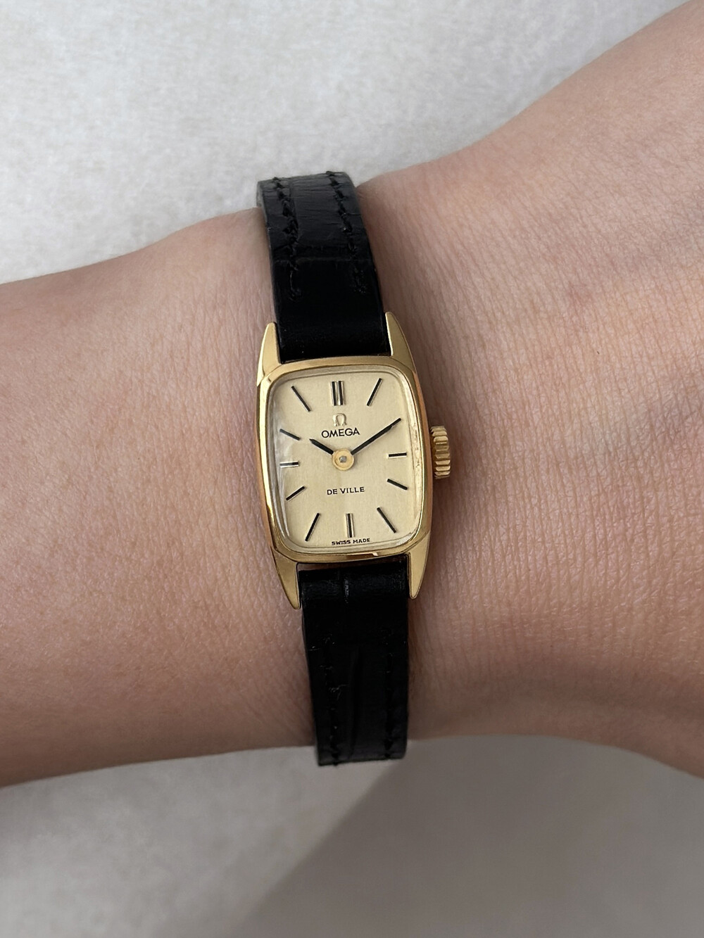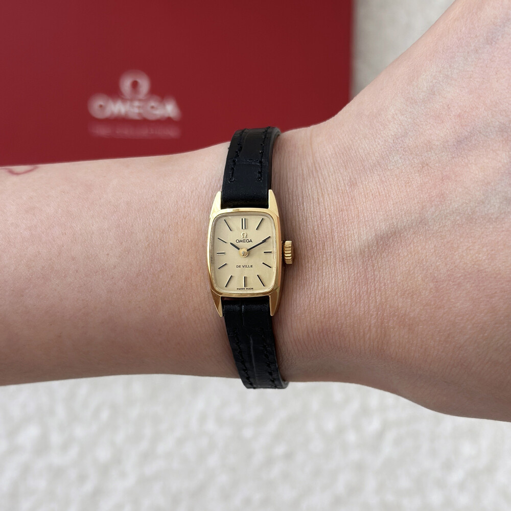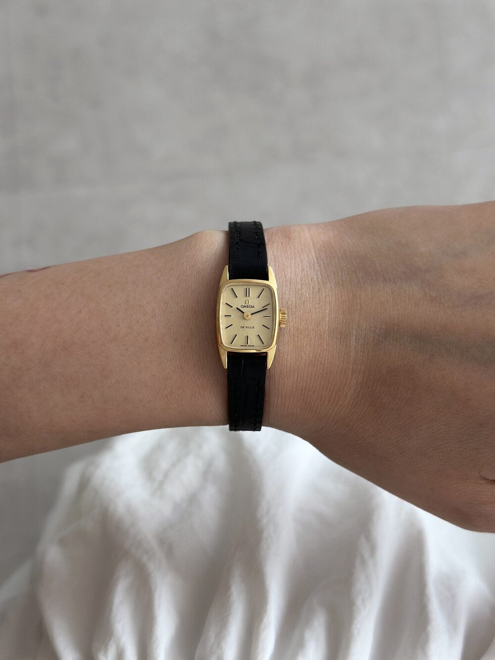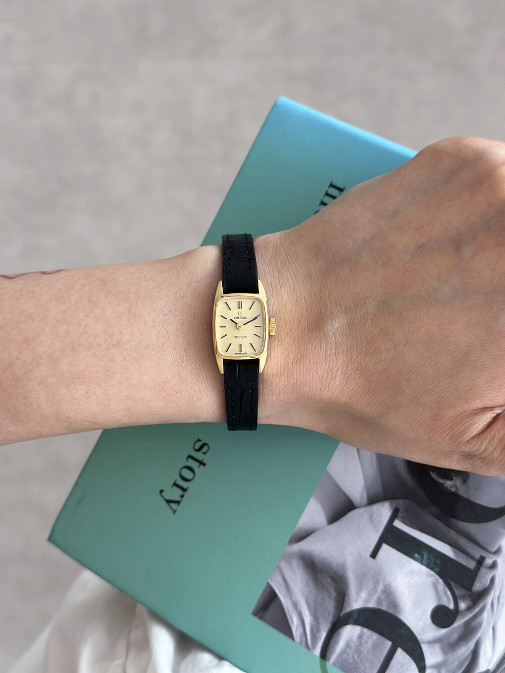 1972년도에 제작된 오메가 드빌 모델로 골드톤 다이얼 위를 장식하는