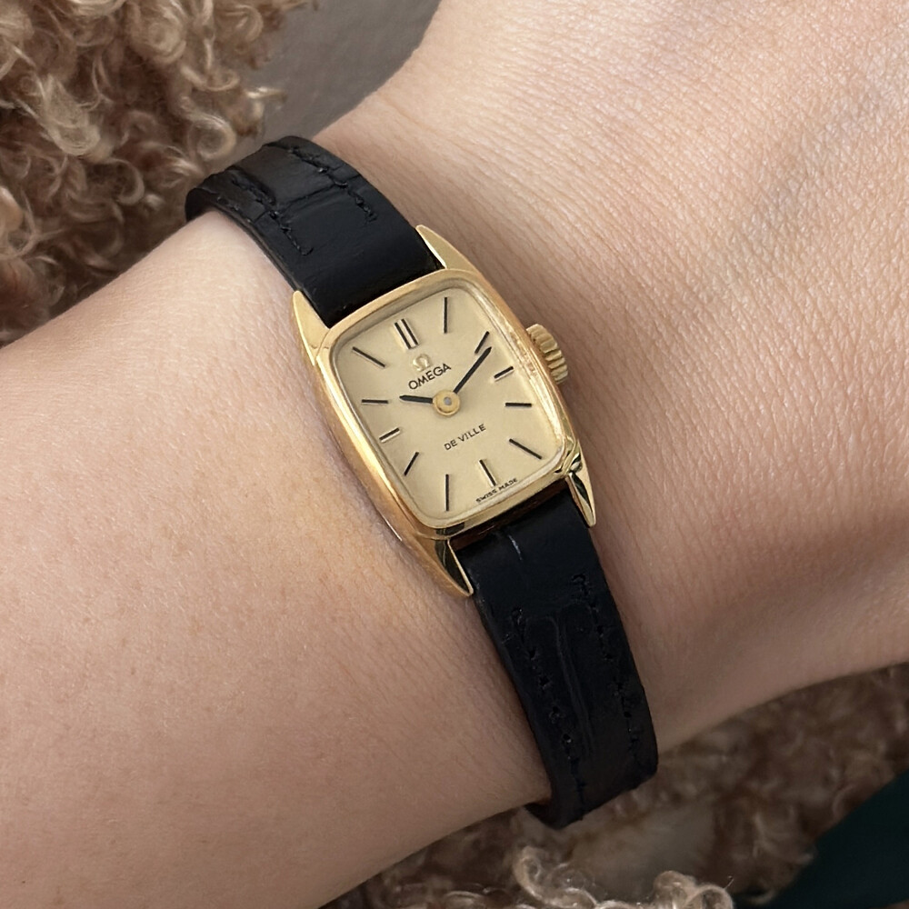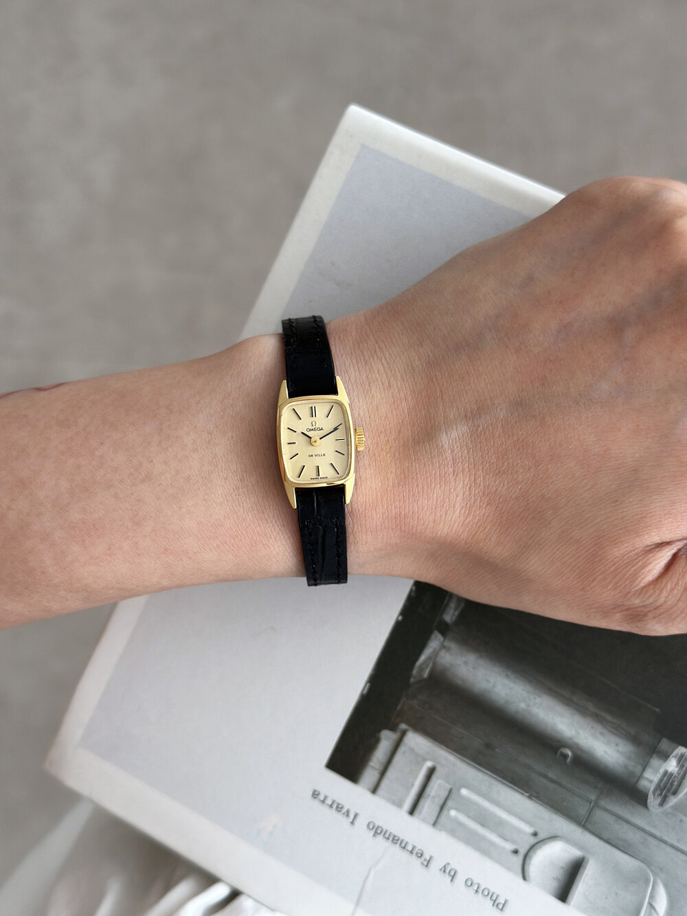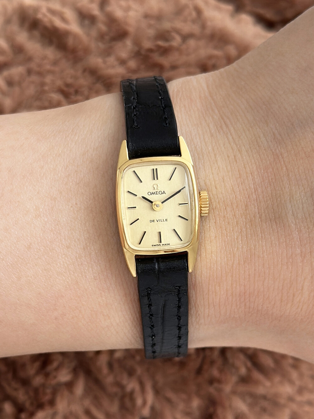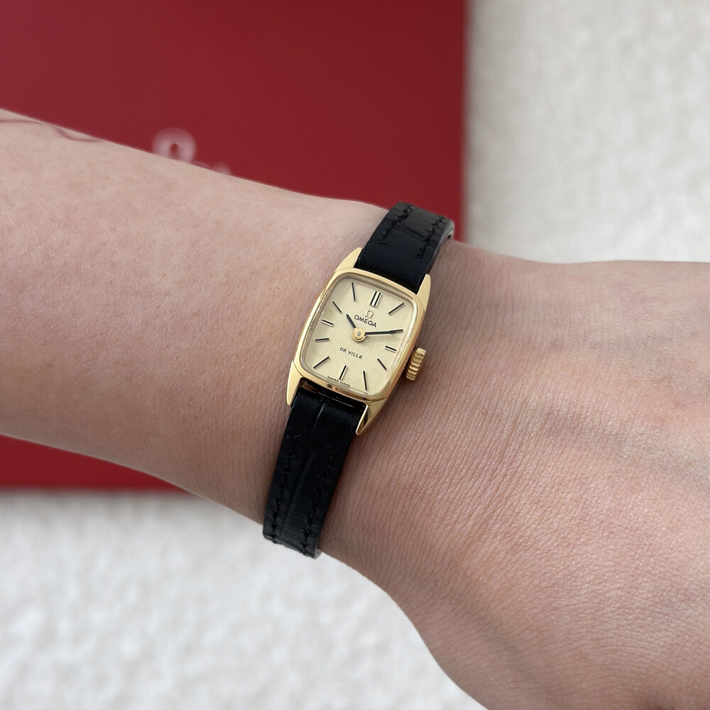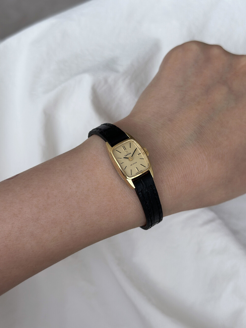 1972년도에 제작된 오메가 드빌 모델로 골드톤 다이얼 위를 장식하는