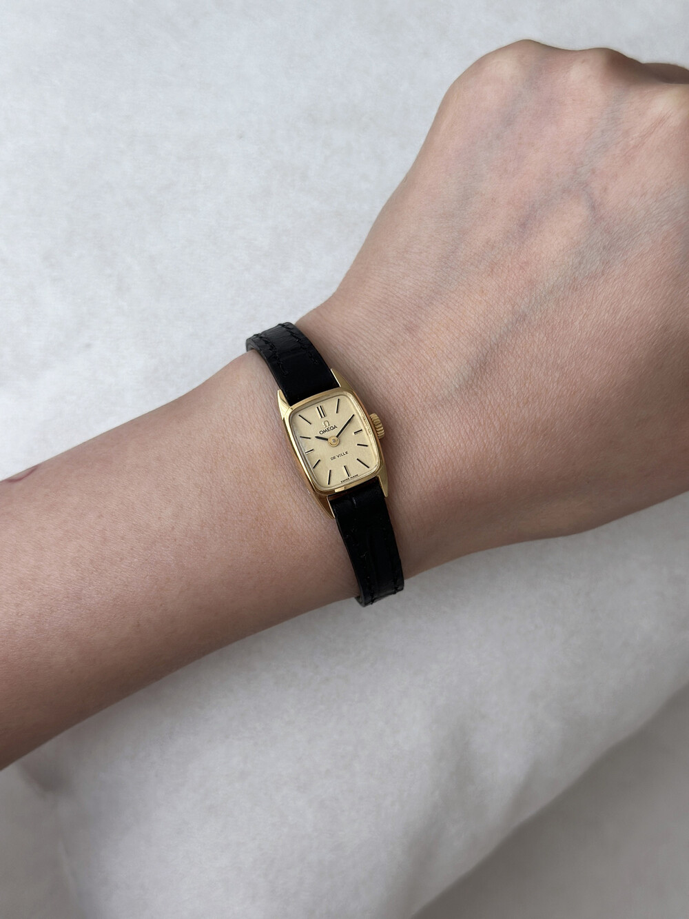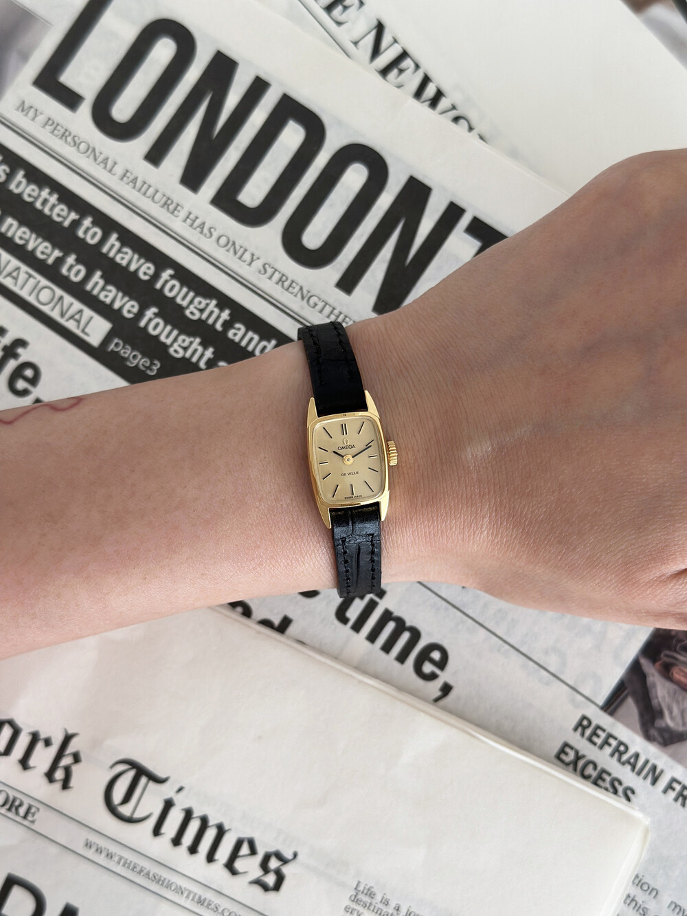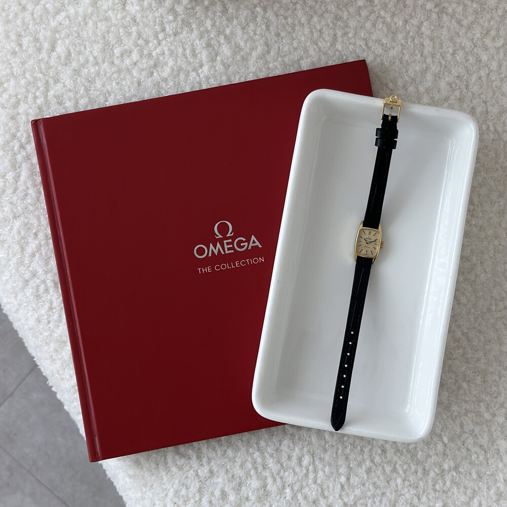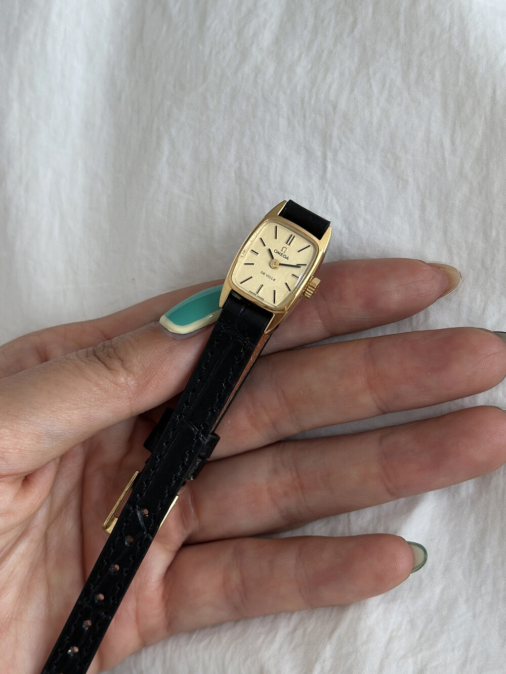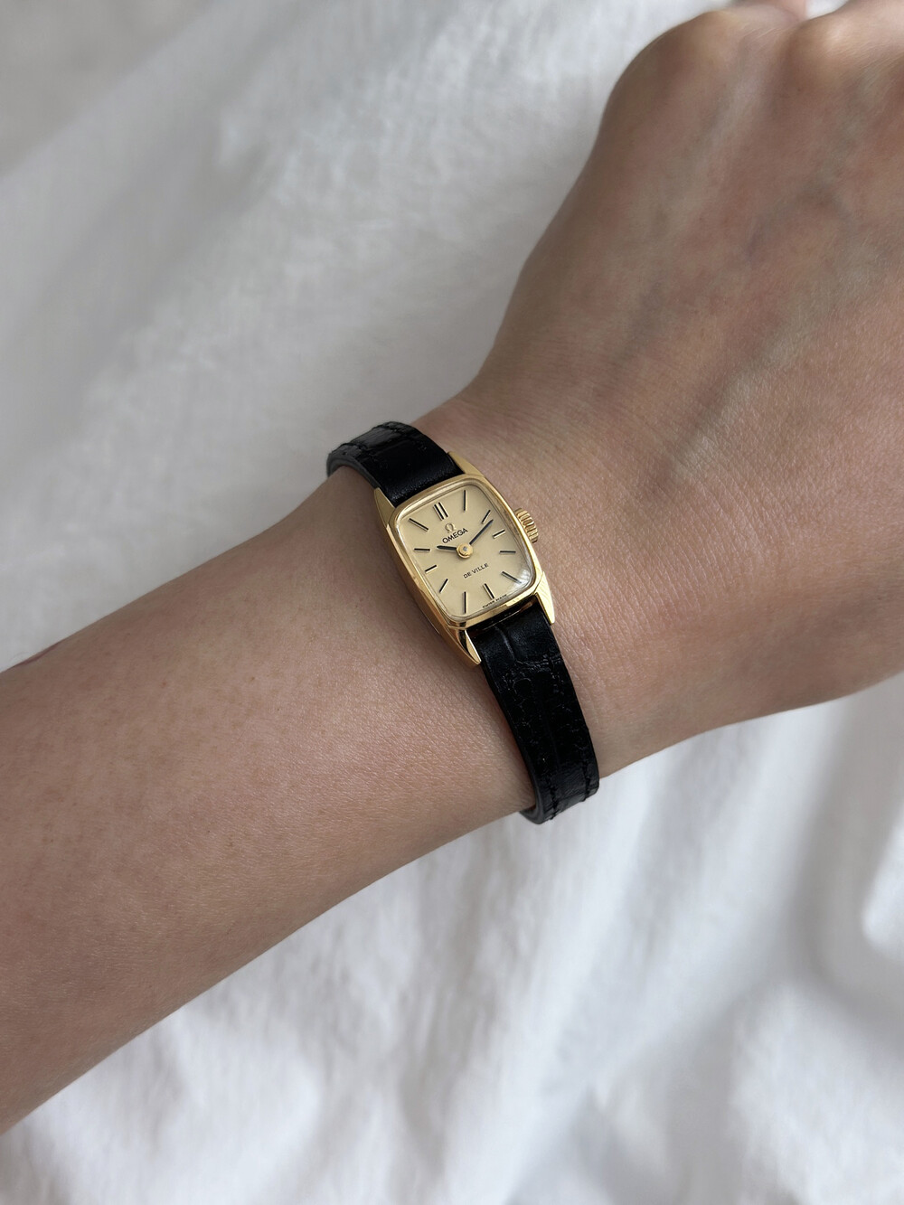 1972년도에 제작된 오메가 드빌 모델로 골드톤 다이얼 위를 장식하는