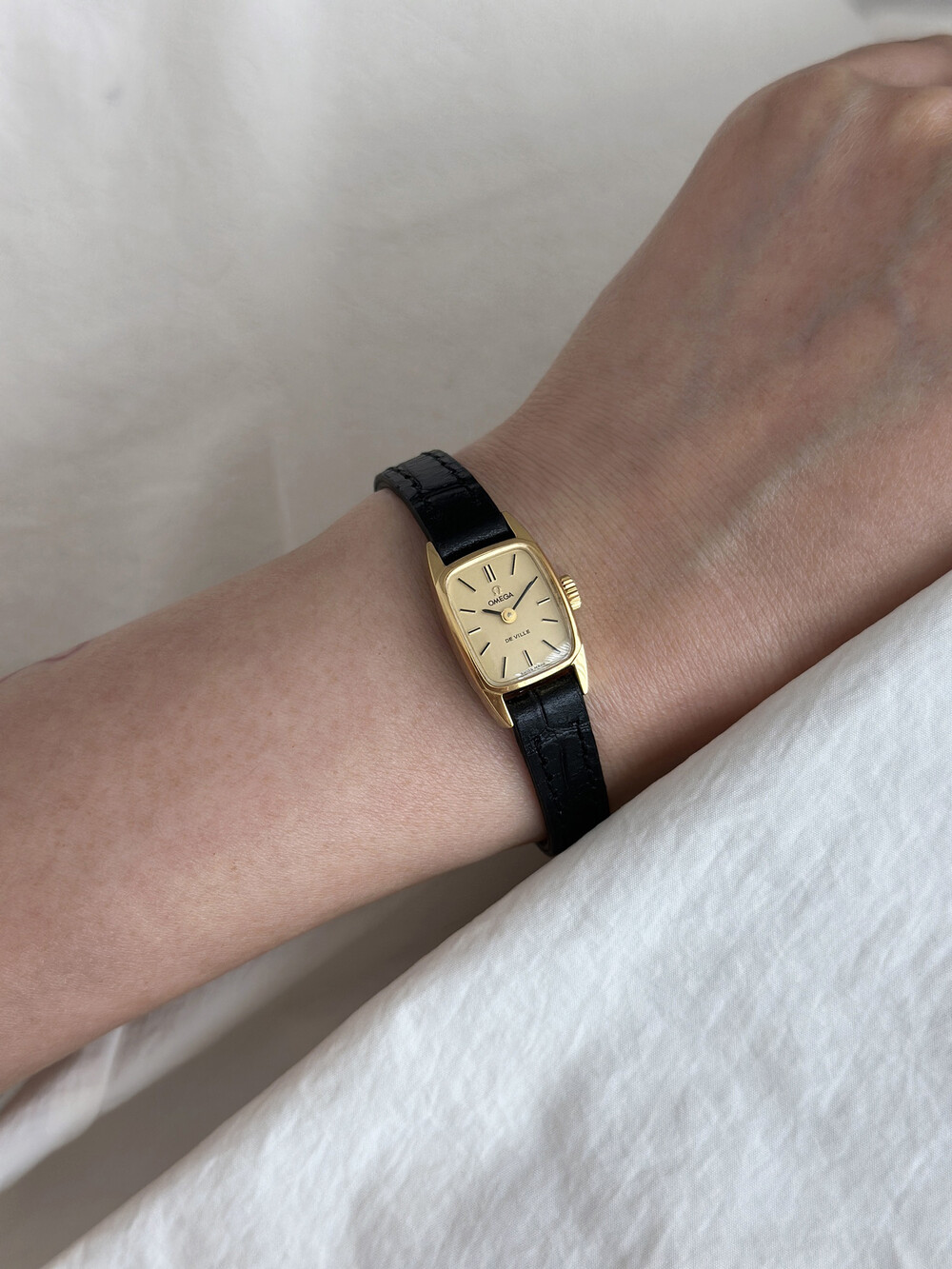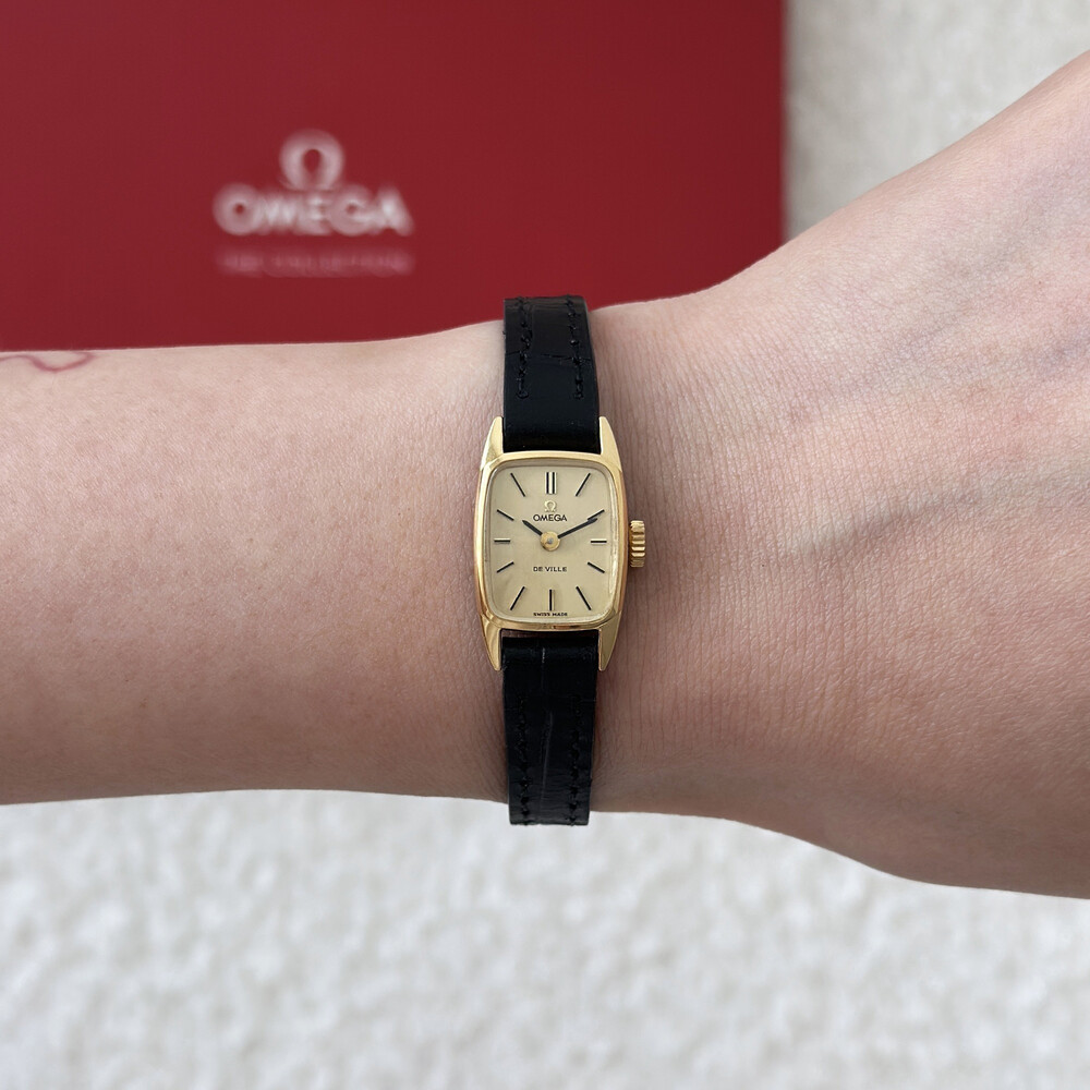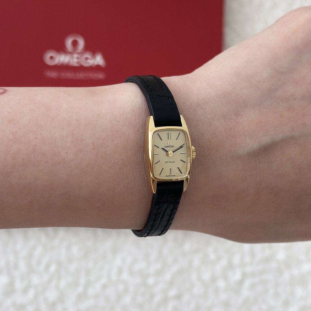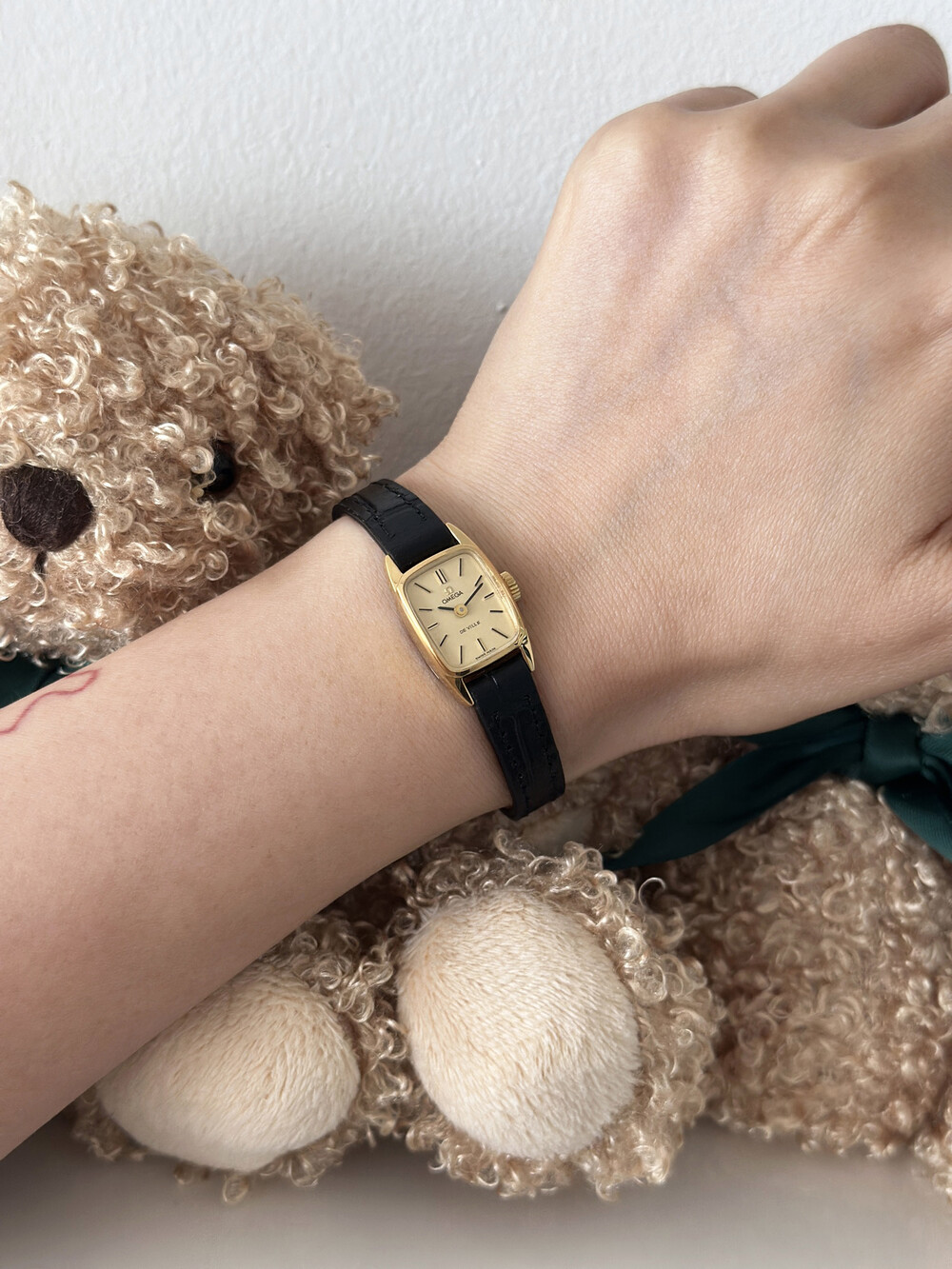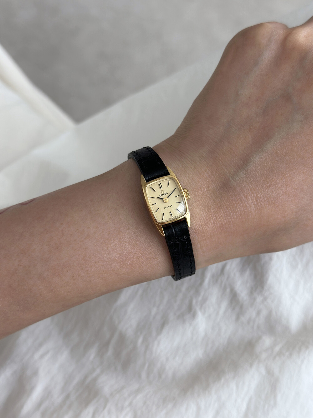 1972년도에 제작된 오메가 드빌 모델로 골드톤 다이얼 위를 장식하는