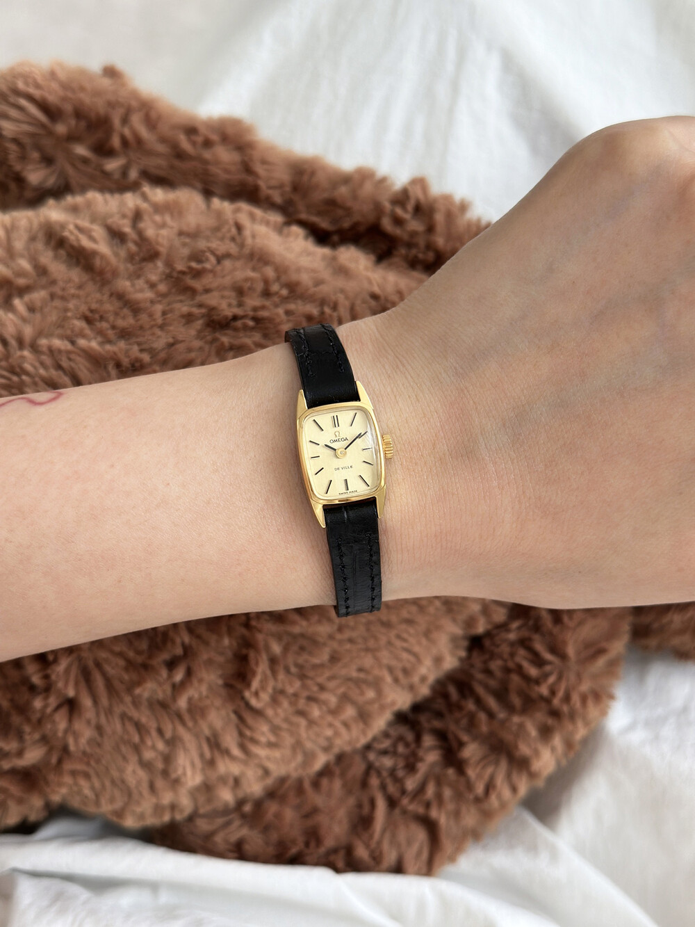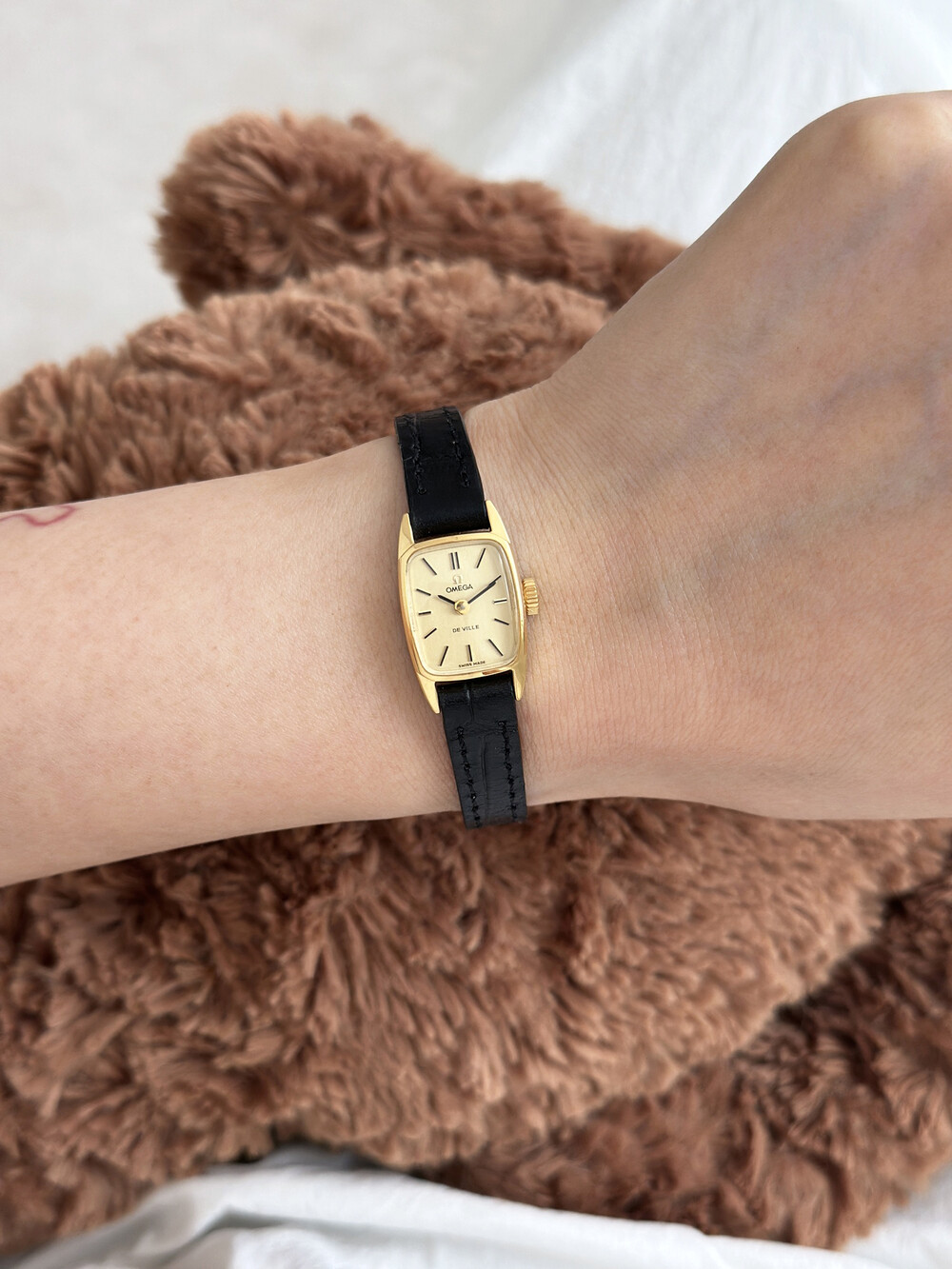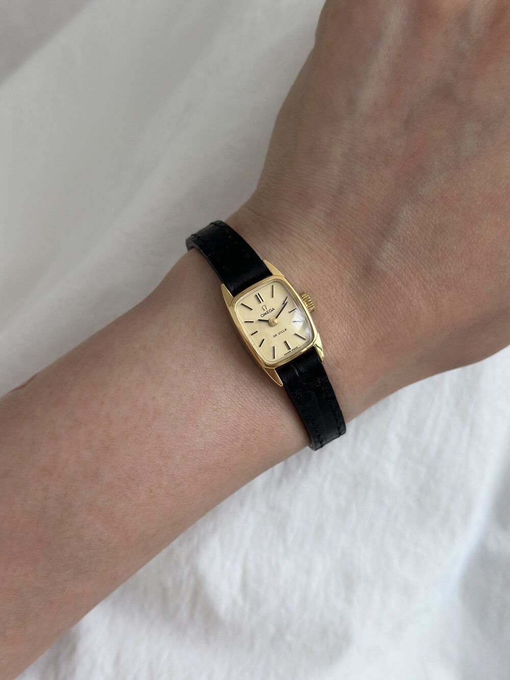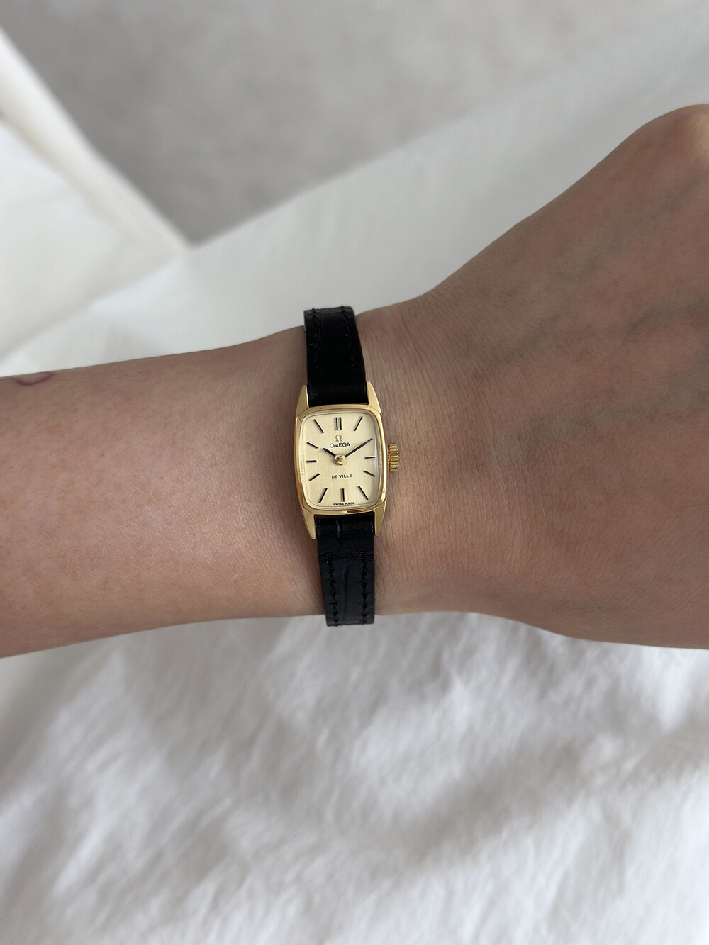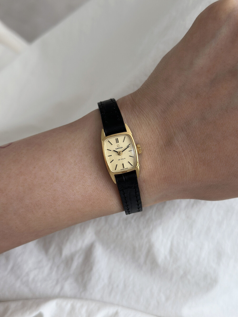 1972년도에 제작된 오메가 드빌 모델로 골드톤 다이얼 위를 장식하는