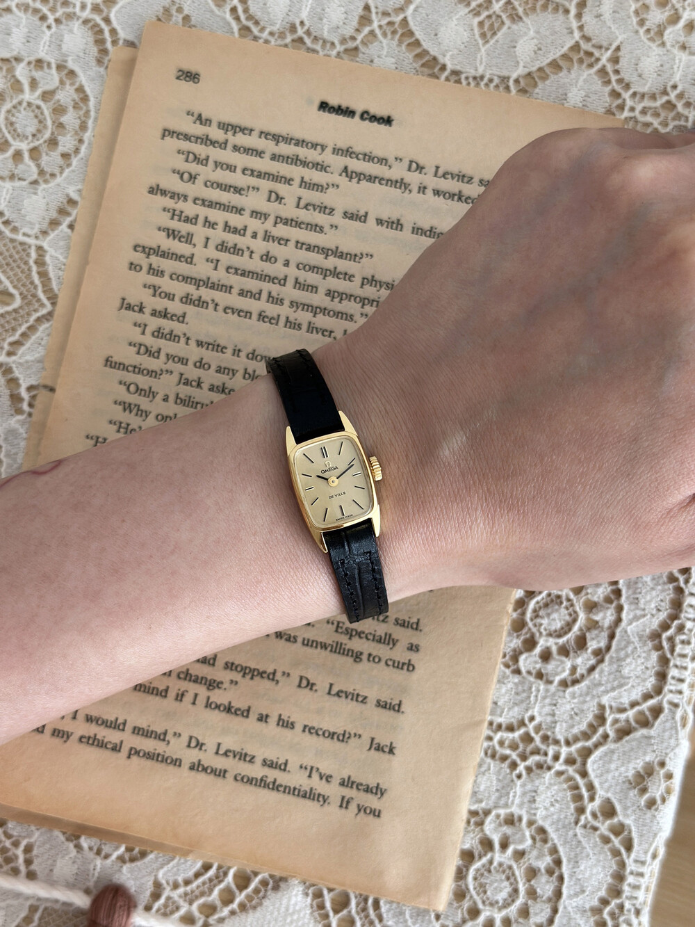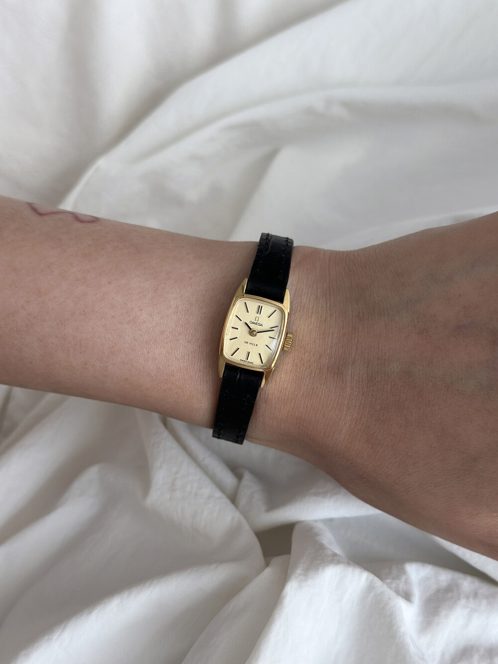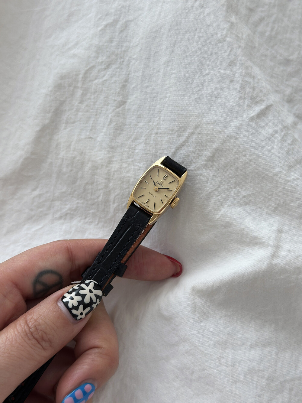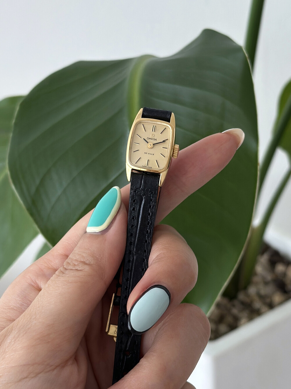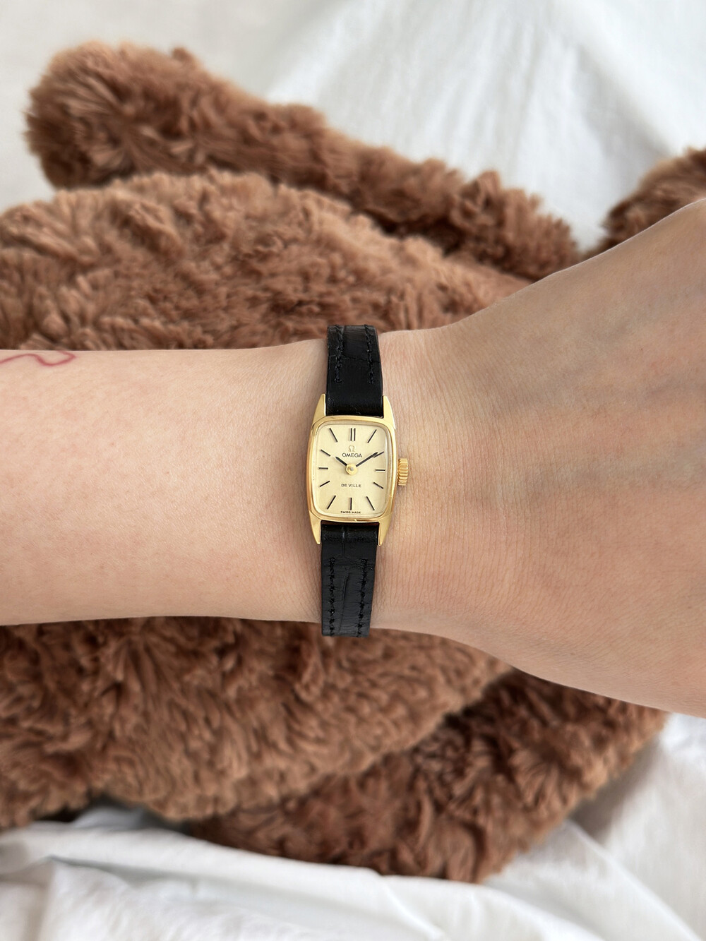 1972년도에 제작된 오메가 드빌 모델로 골드톤 다이얼 위를 장식하는