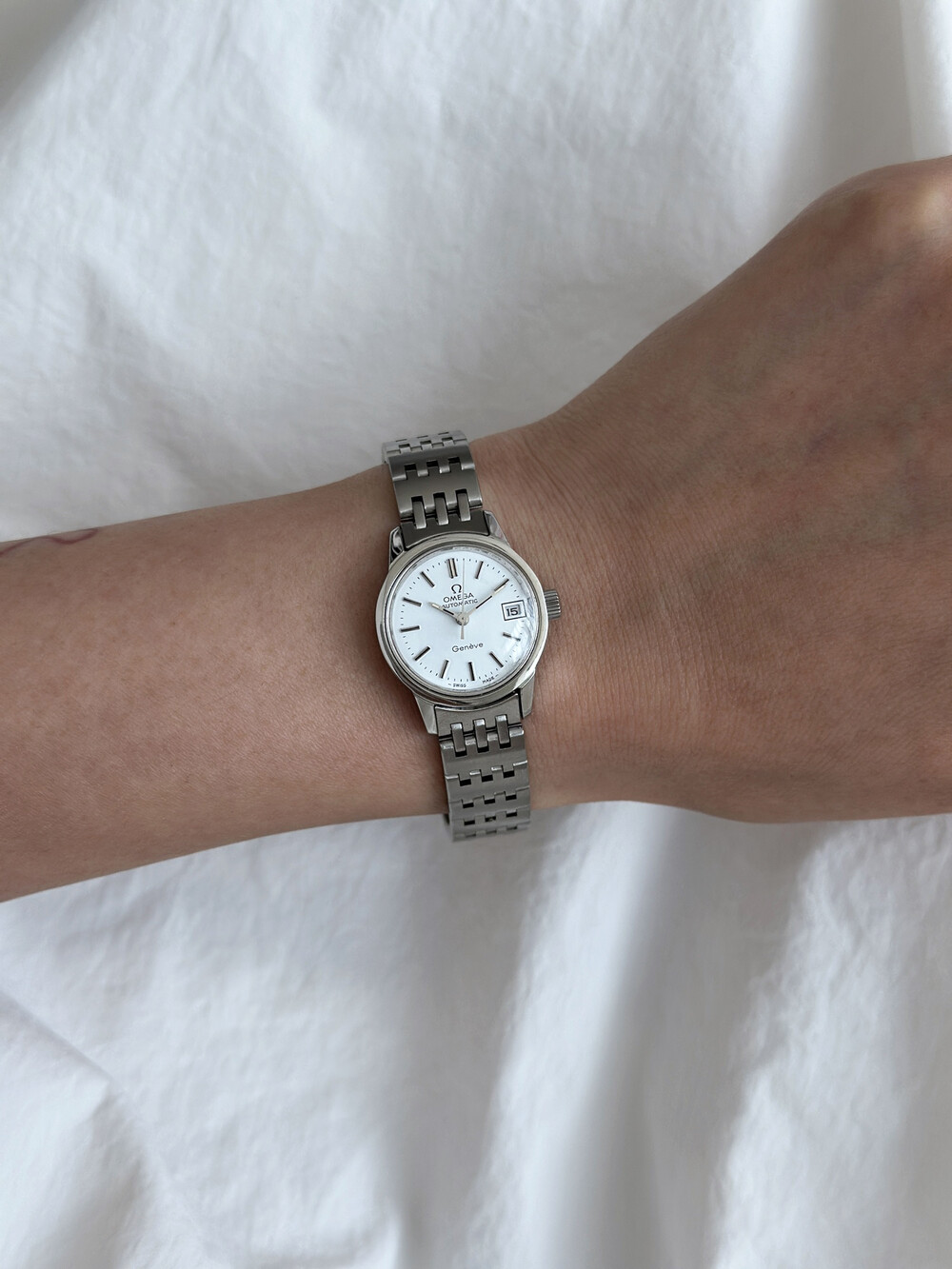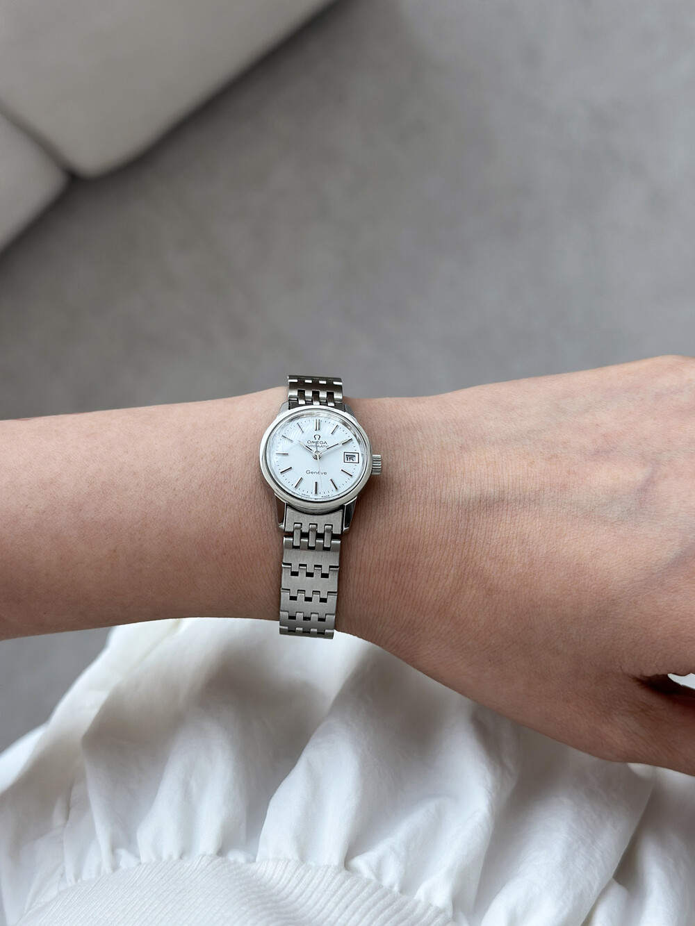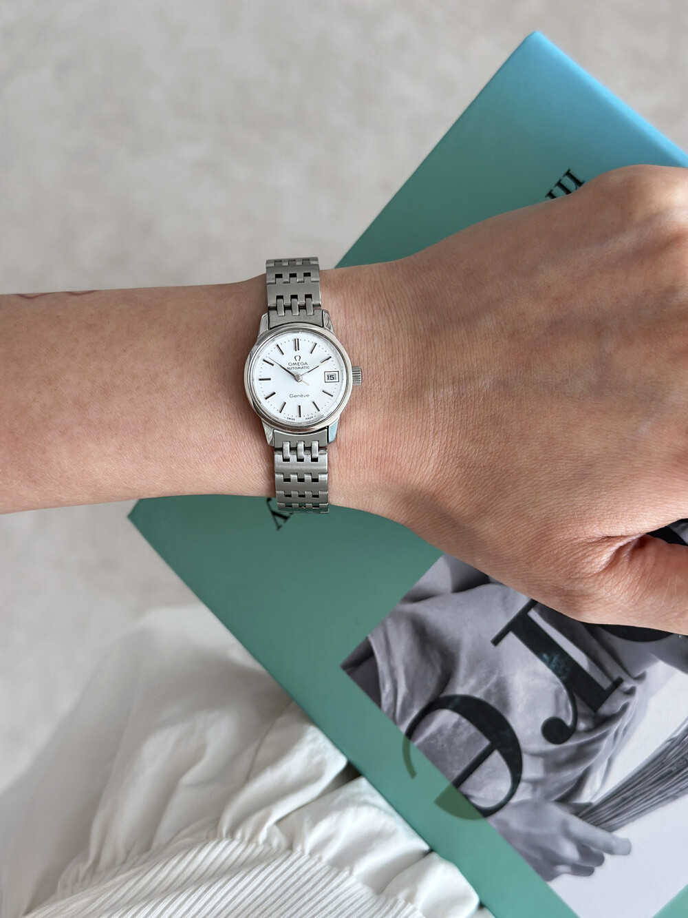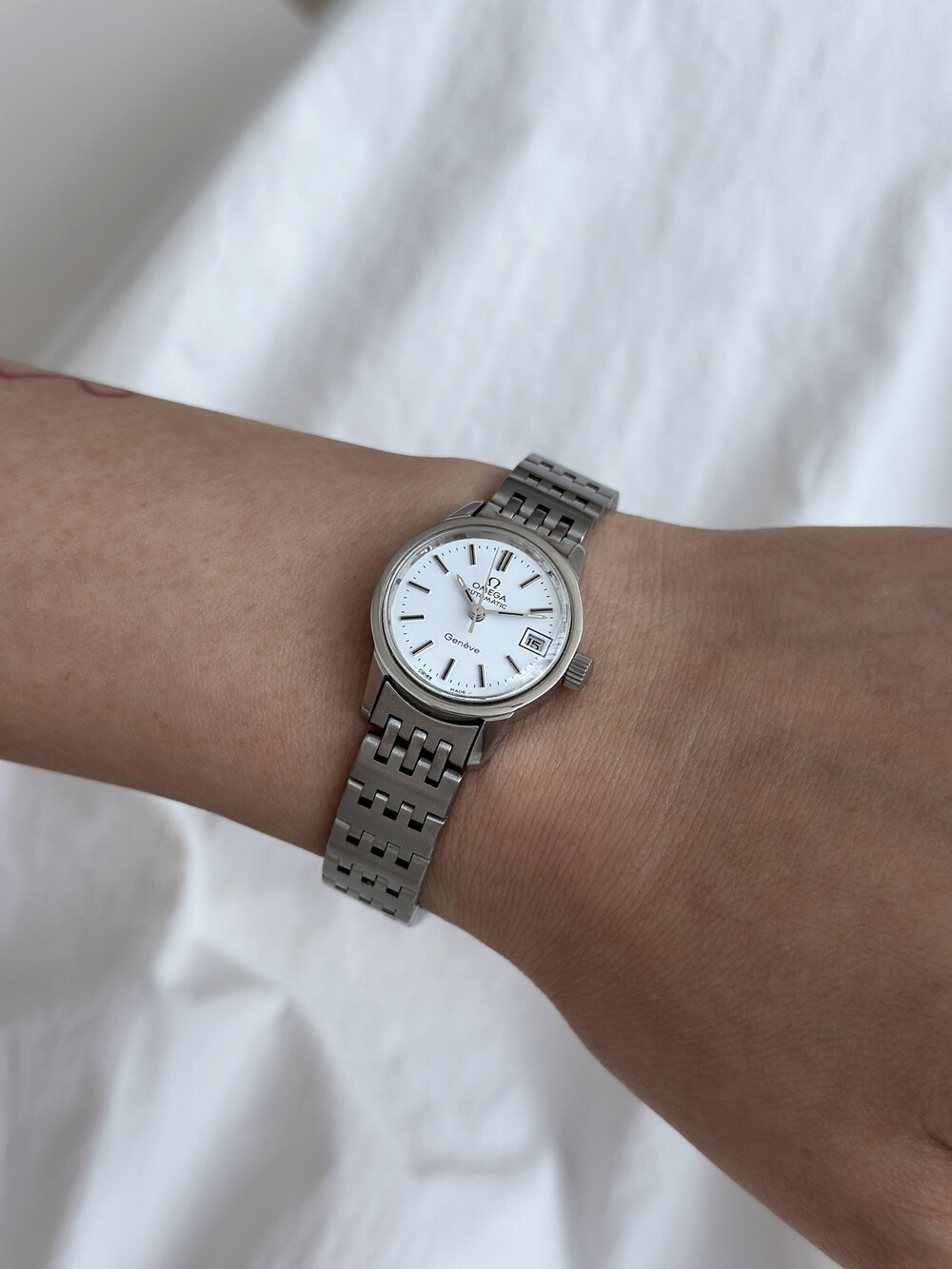 1974년도에 제작된 오메가 제네브 모델로 부드러운 실버톤 케이스와 클래식한 바 인덱스,