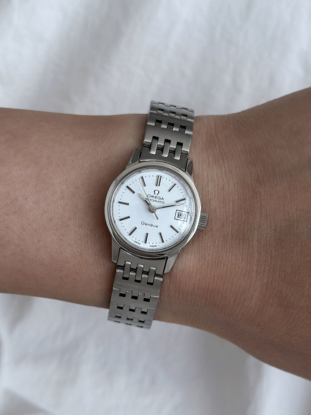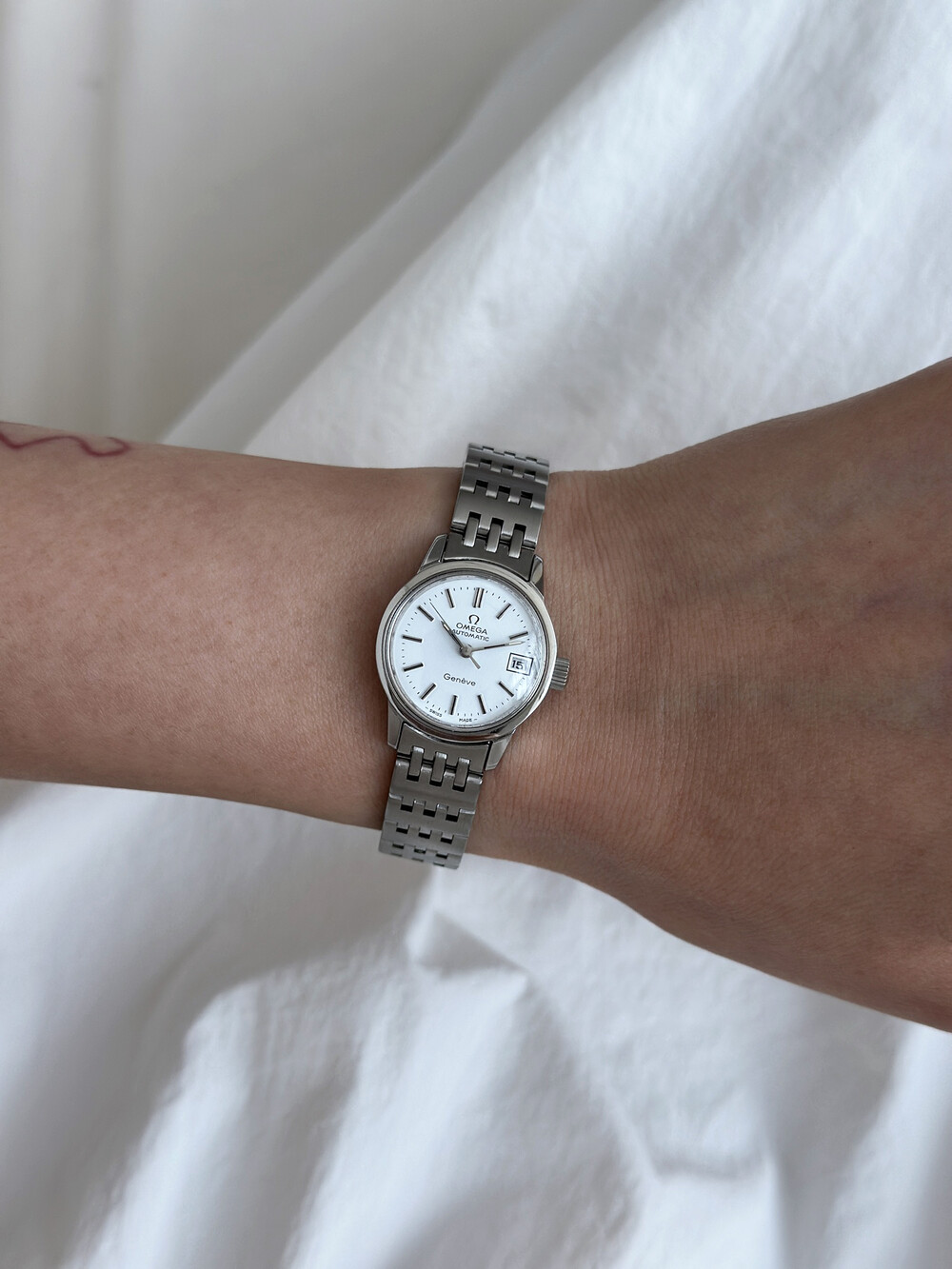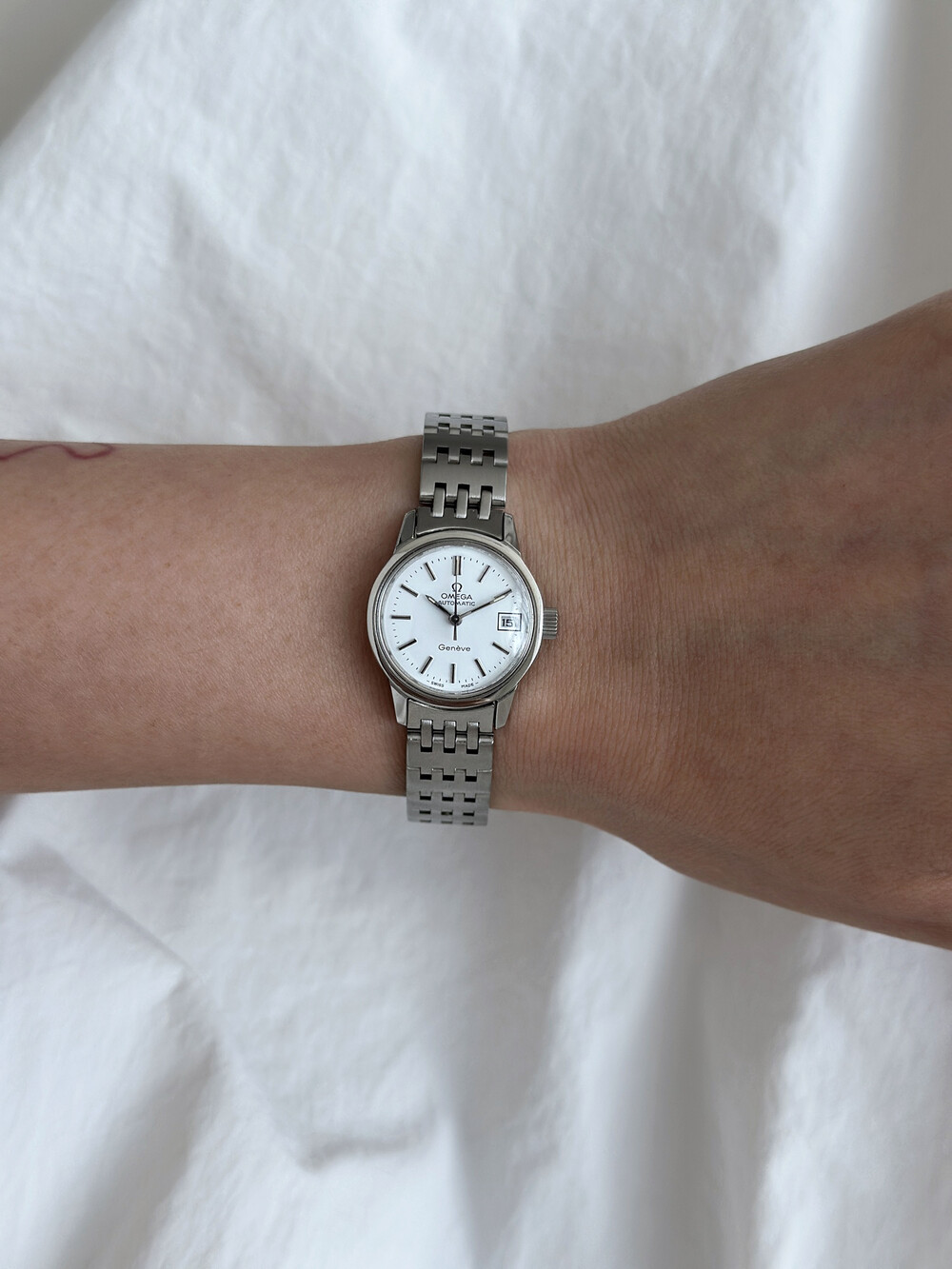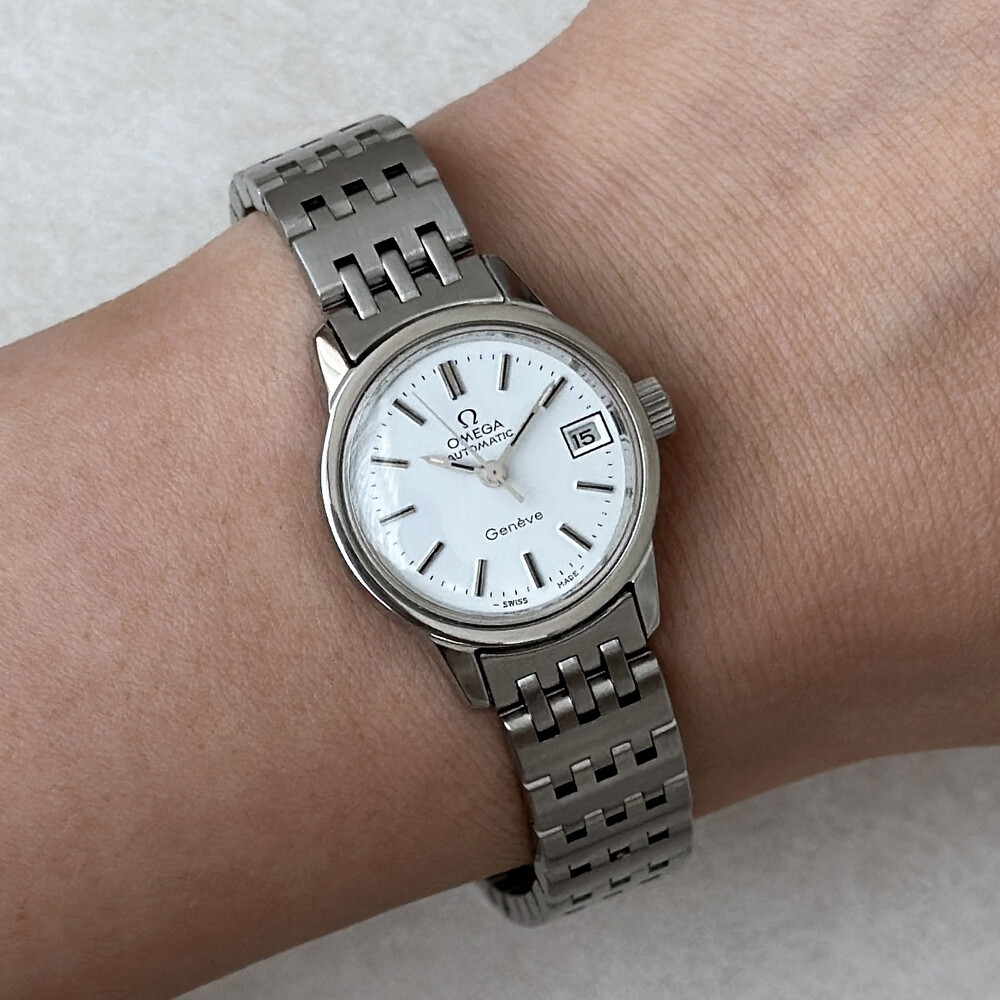 1974년도에 제작된 오메가 제네브 모델로 부드러운 실버톤 케이스와 클래식한 바 인덱스,