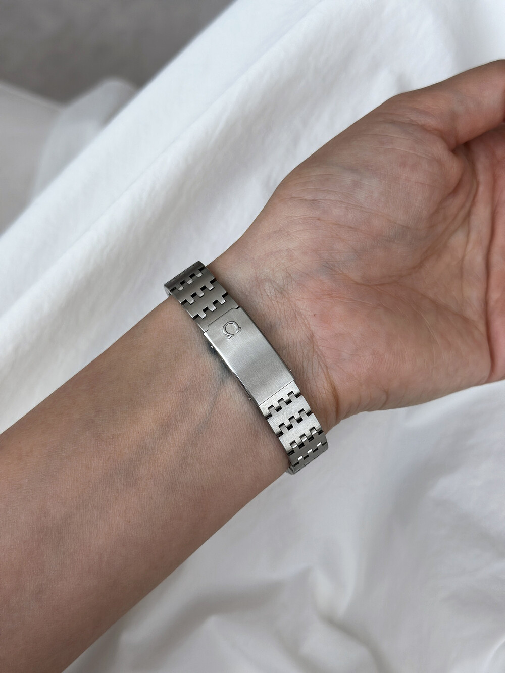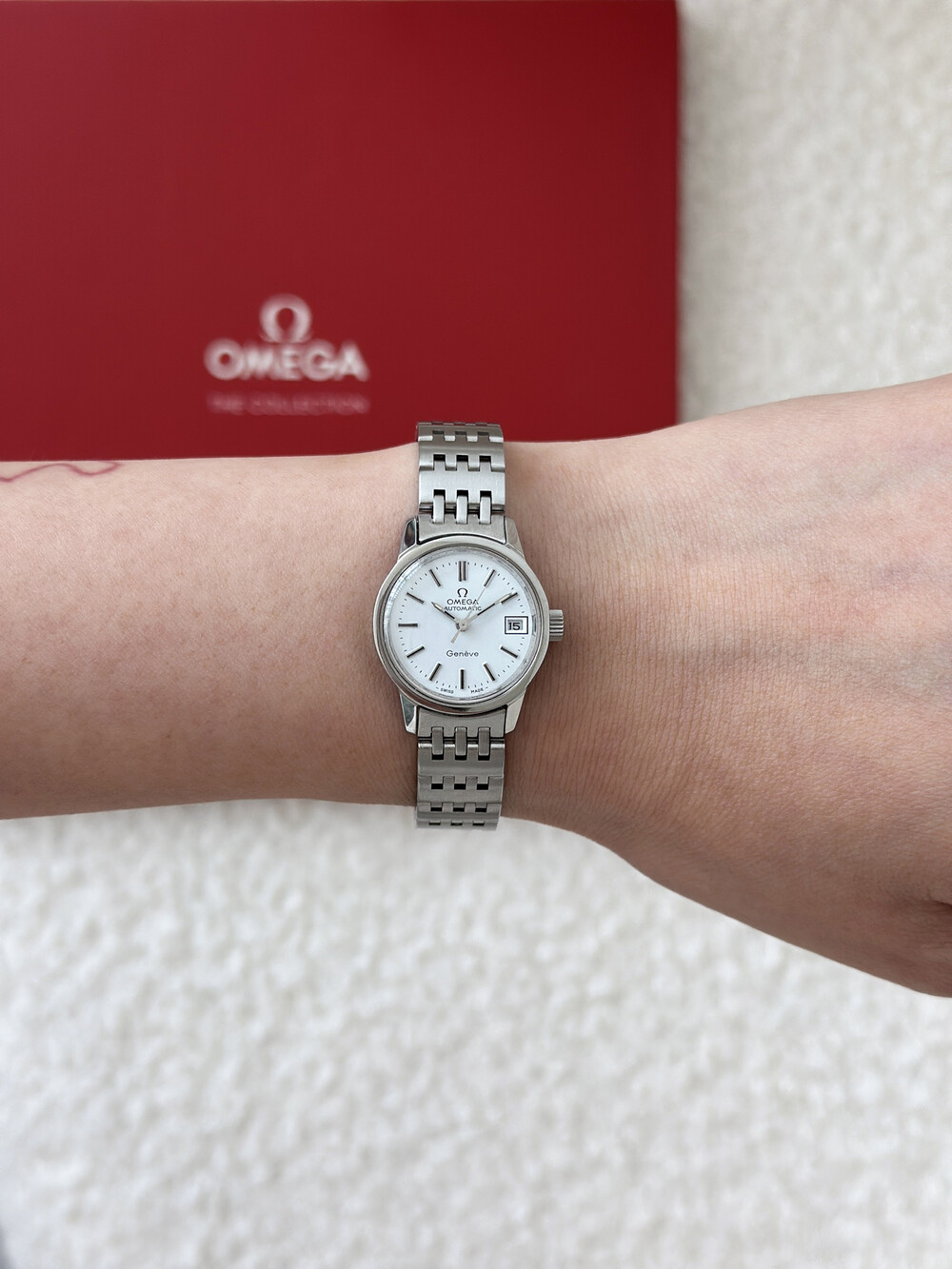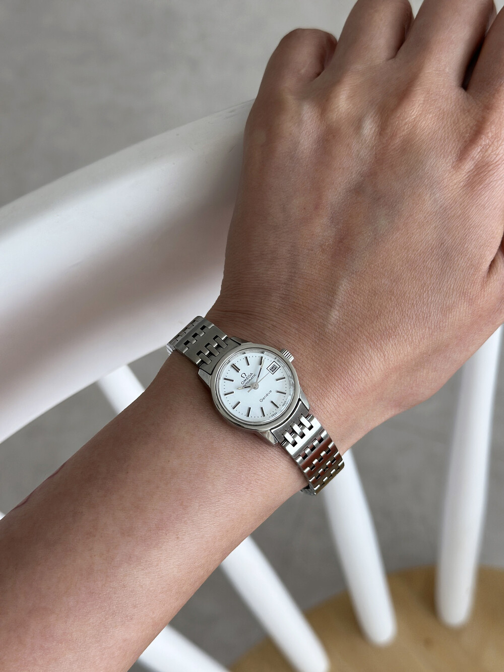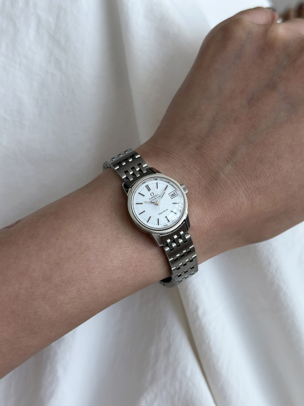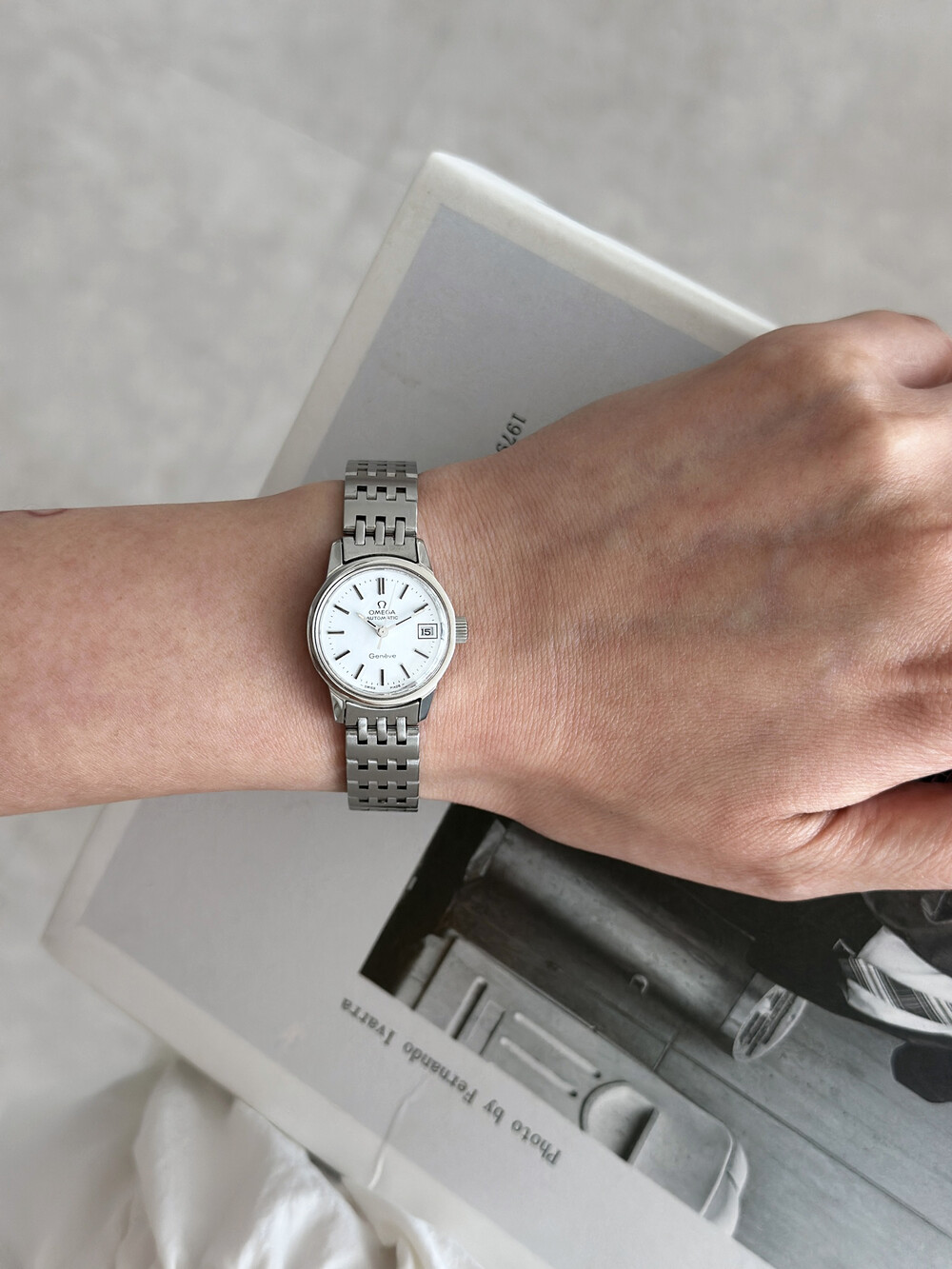 1974년도에 제작된 오메가 제네브 모델로 부드러운 실버톤 케이스와 클래식한 바 인덱스,