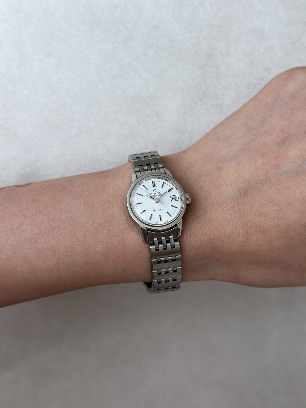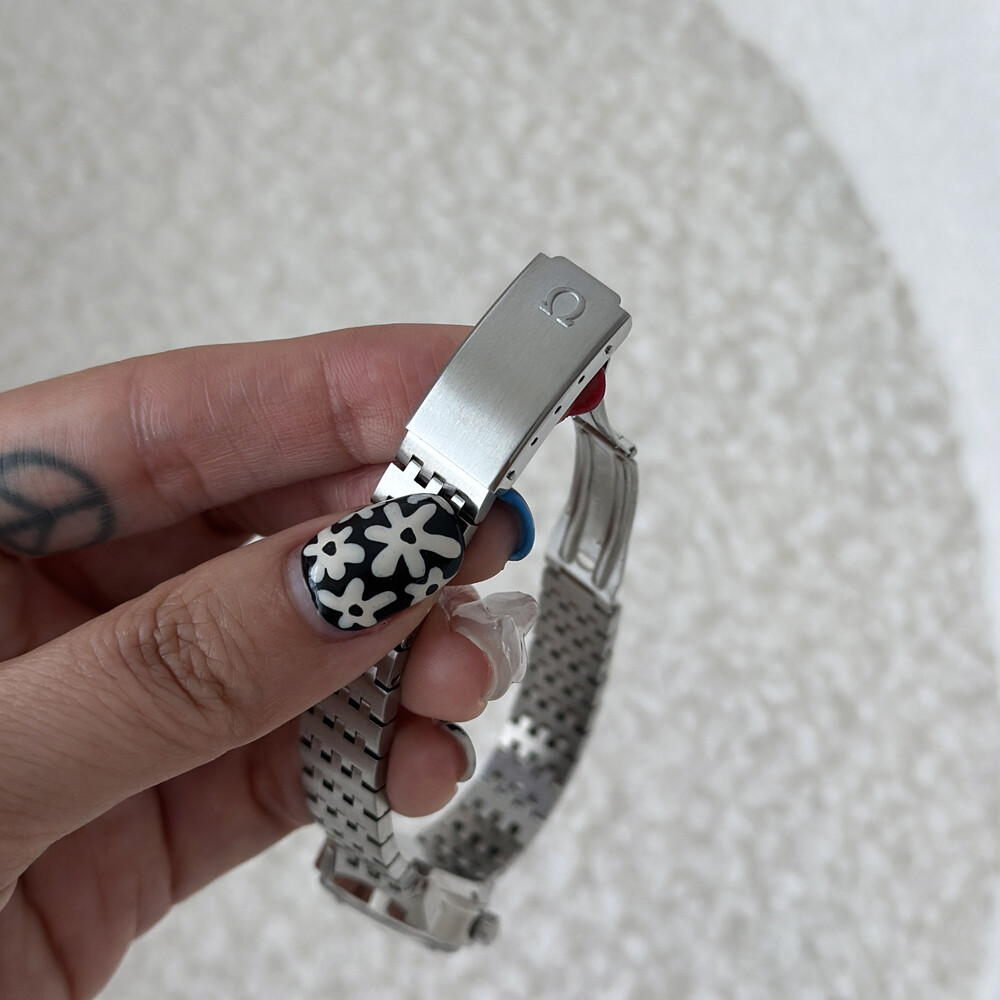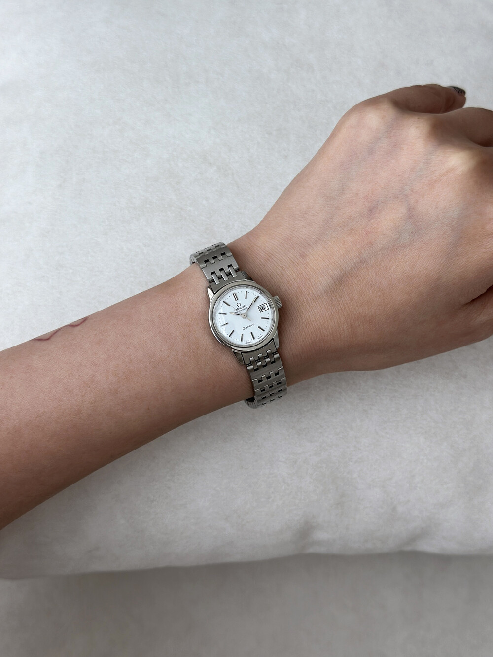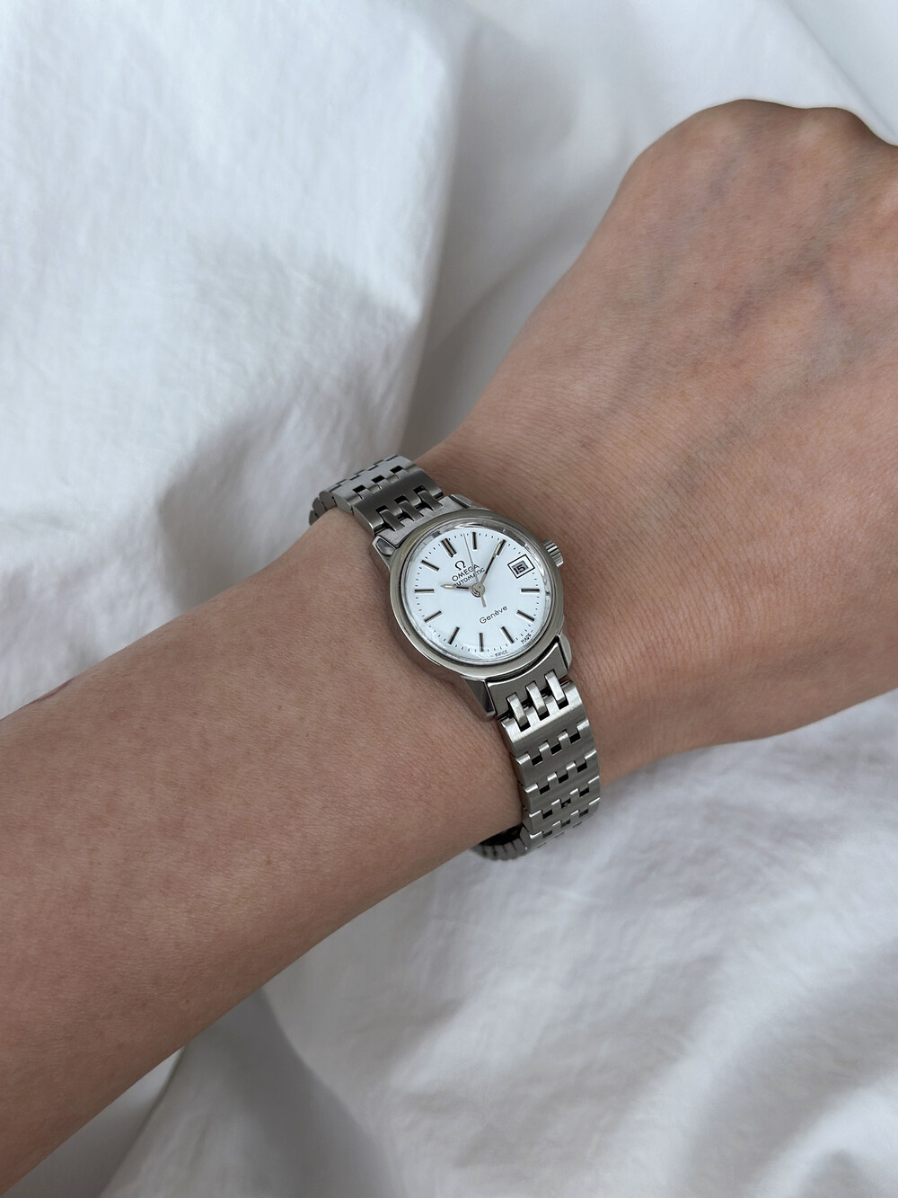 1974년도에 제작된 오메가 제네브 모델로 부드러운 실버톤 케이스와 클래식한 바 인덱스,