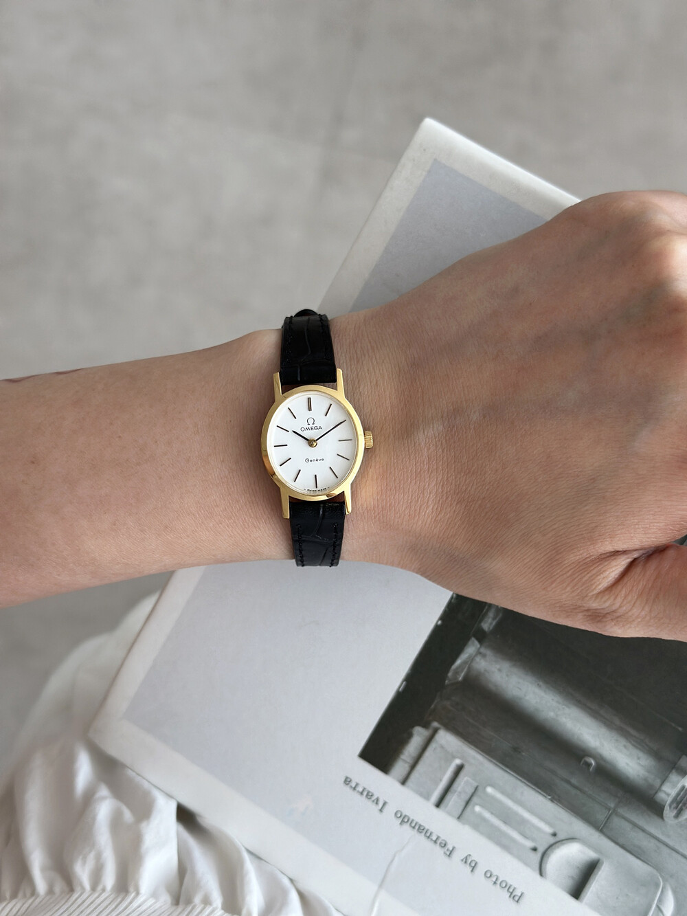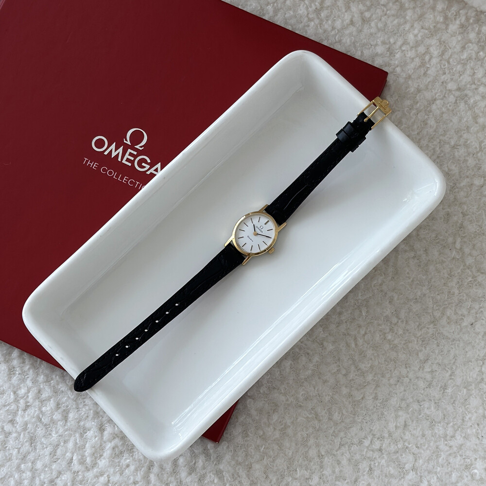 1977년도에 제작된 오메가 제네브 모델로 깔끔한 화이트 다이얼 위를 장식하는