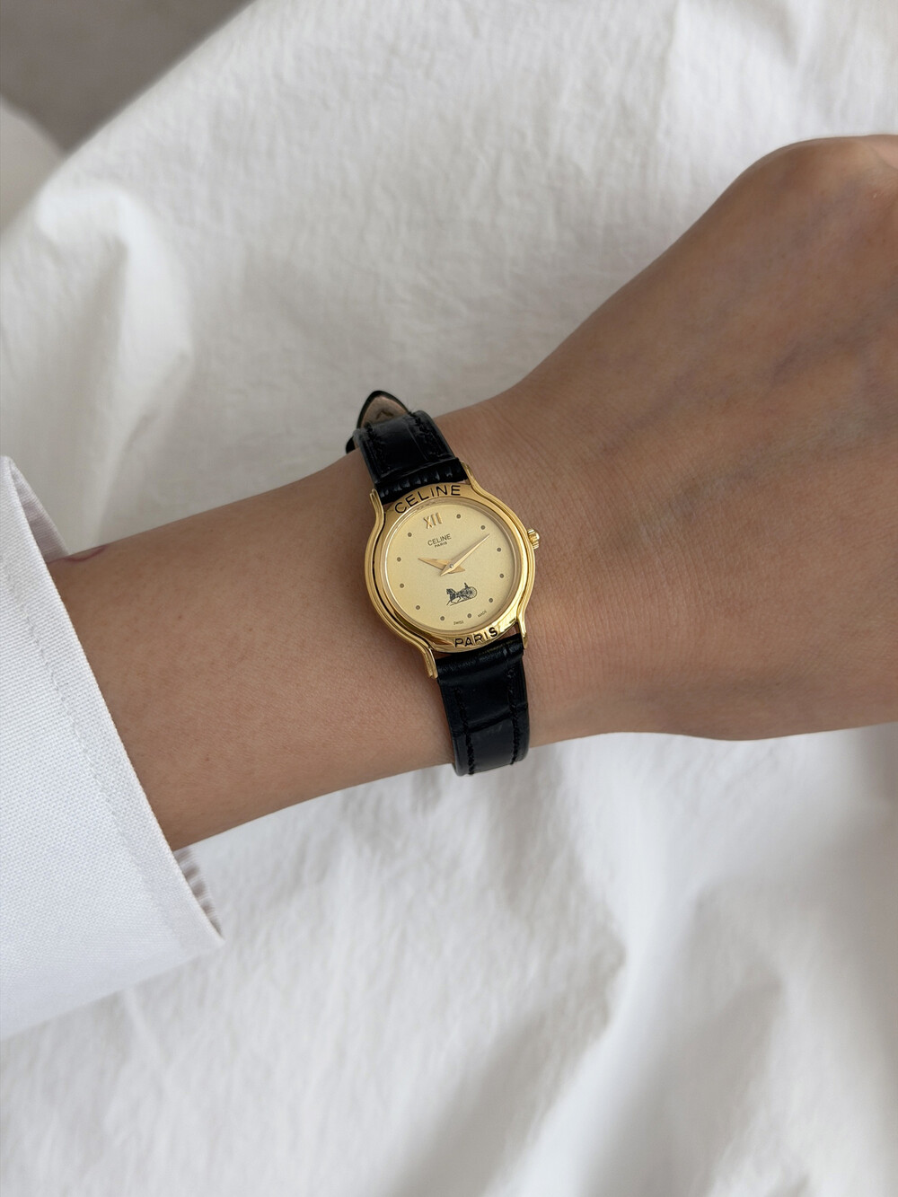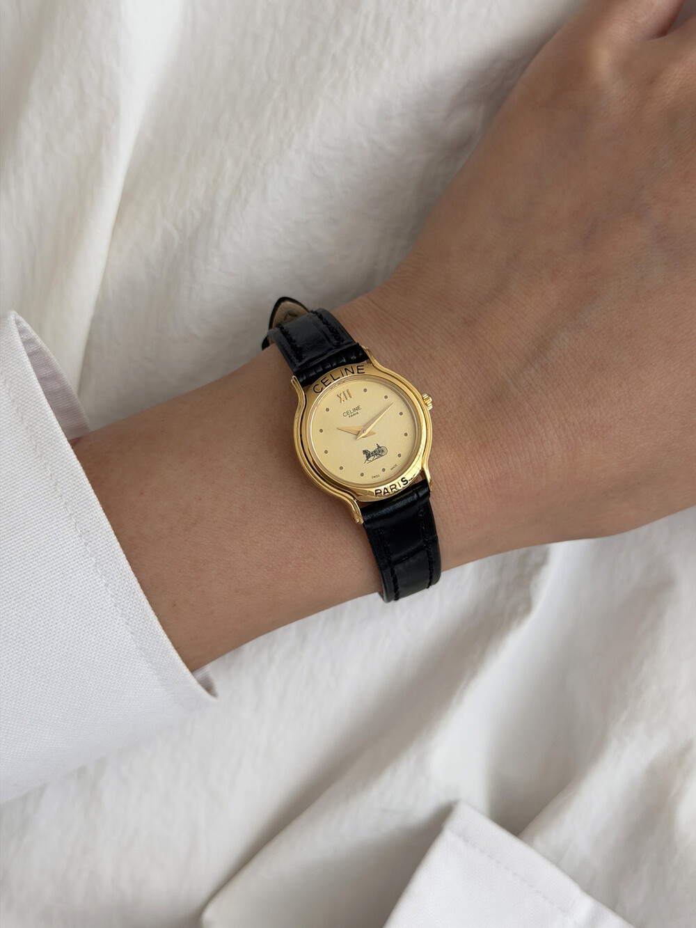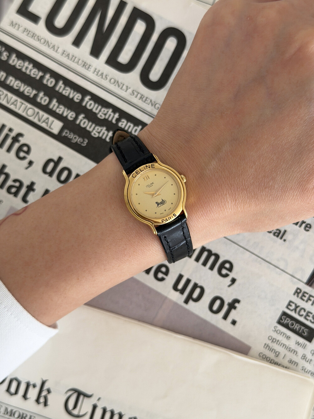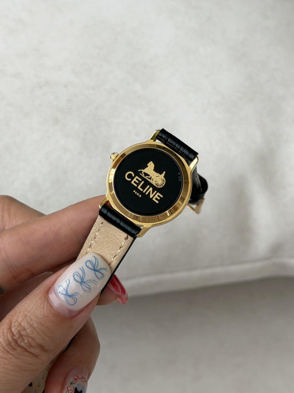 부드러운 골드 톤 케이스와 다이얼 위를 장식하는 셀린느 시그니처 마차 심볼이 매력적인 모델입니다.