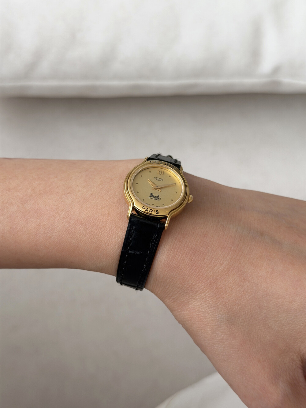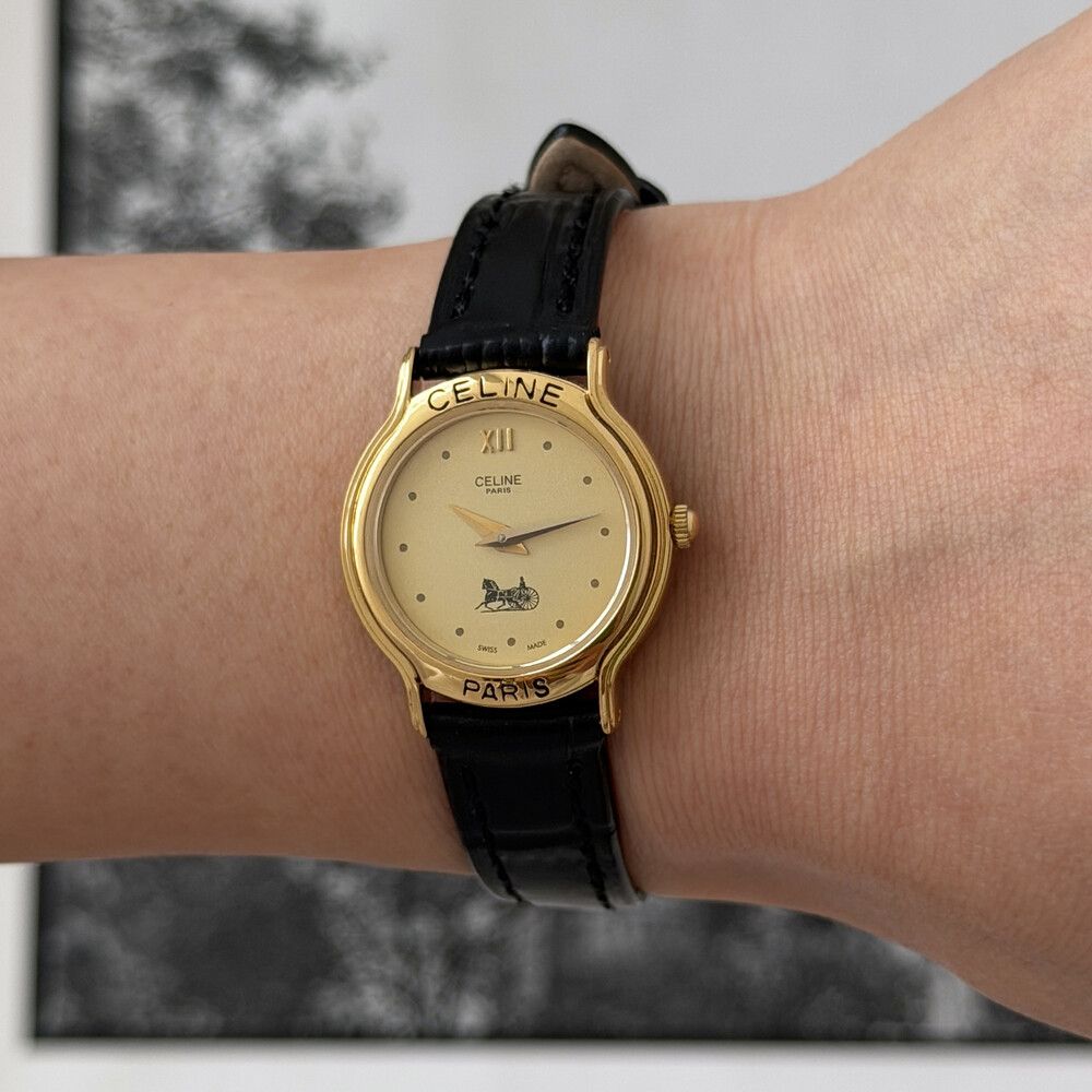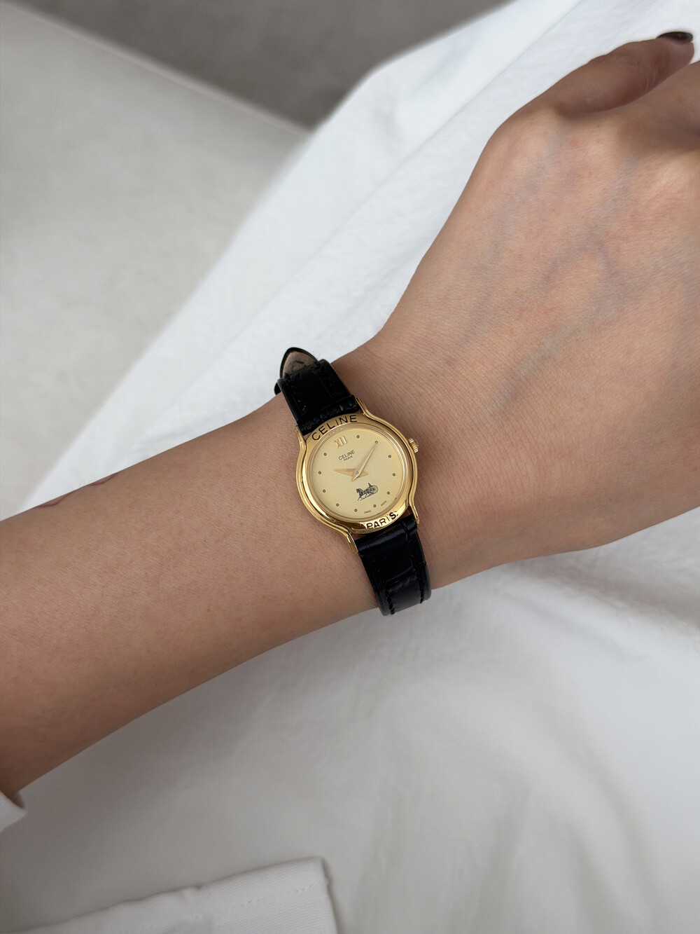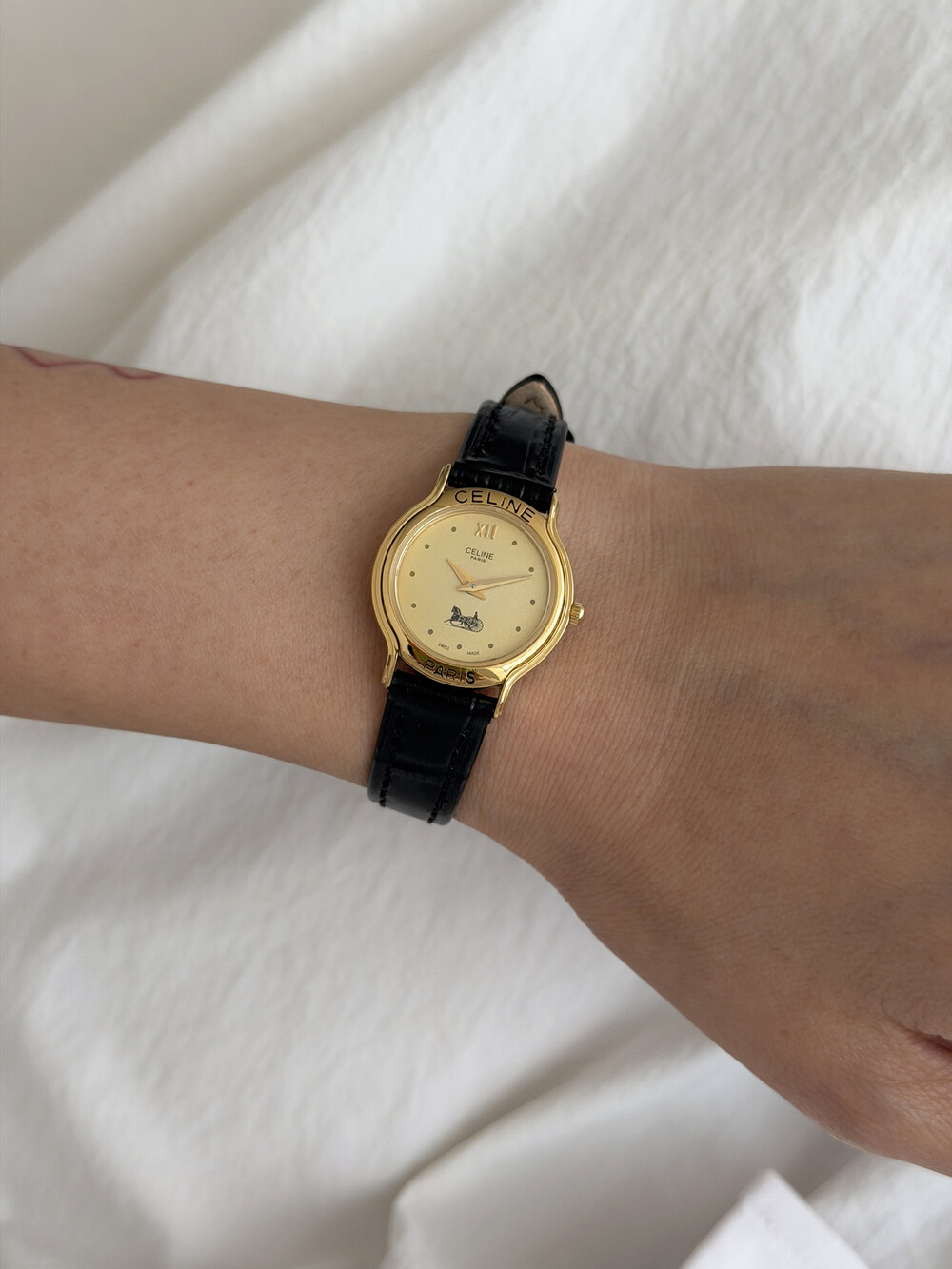 부드러운 골드 톤 케이스와 다이얼 위를 장식하는 셀린느 시그니처 마차 심볼이 매력적인 모델입니다.
