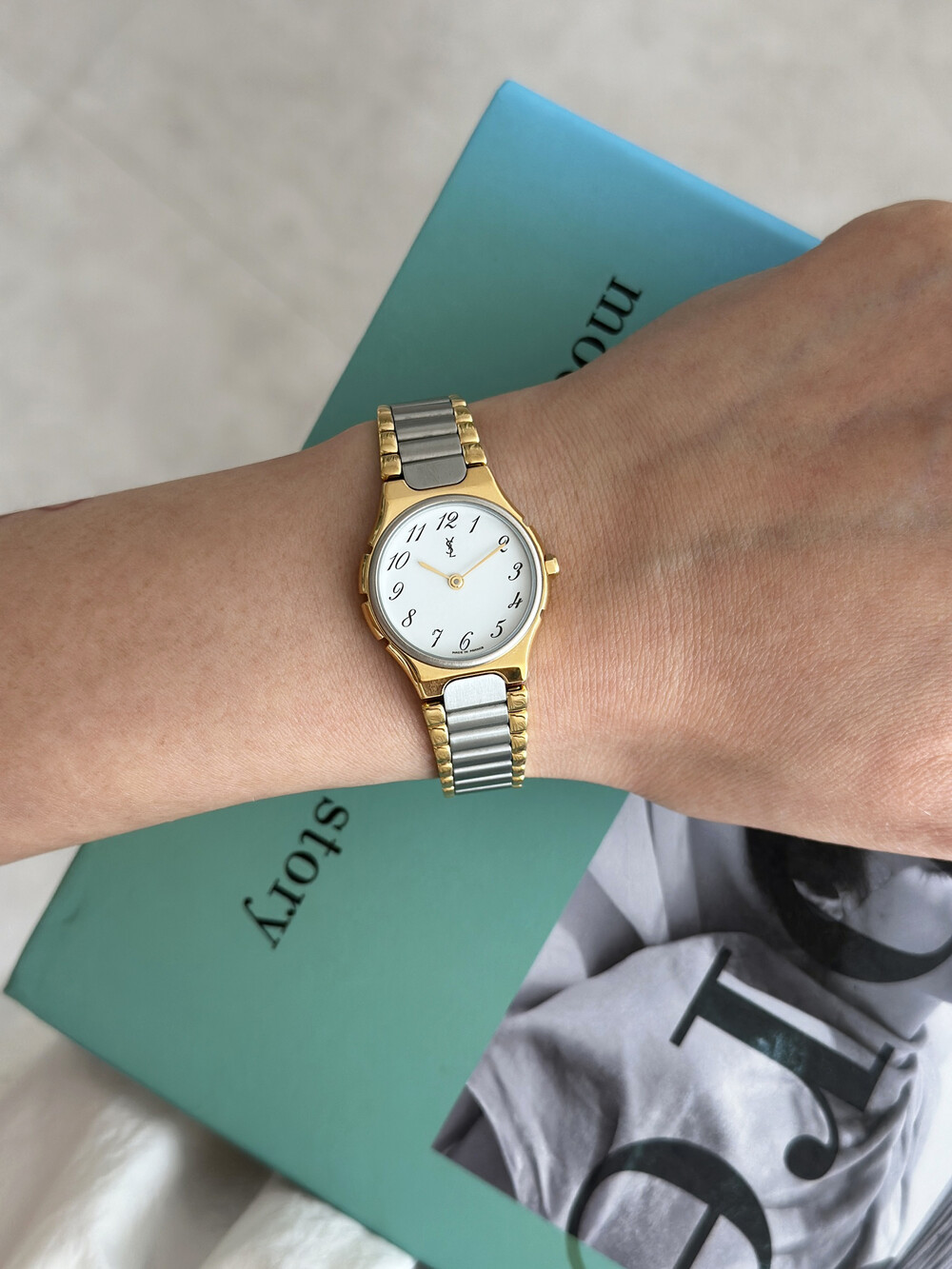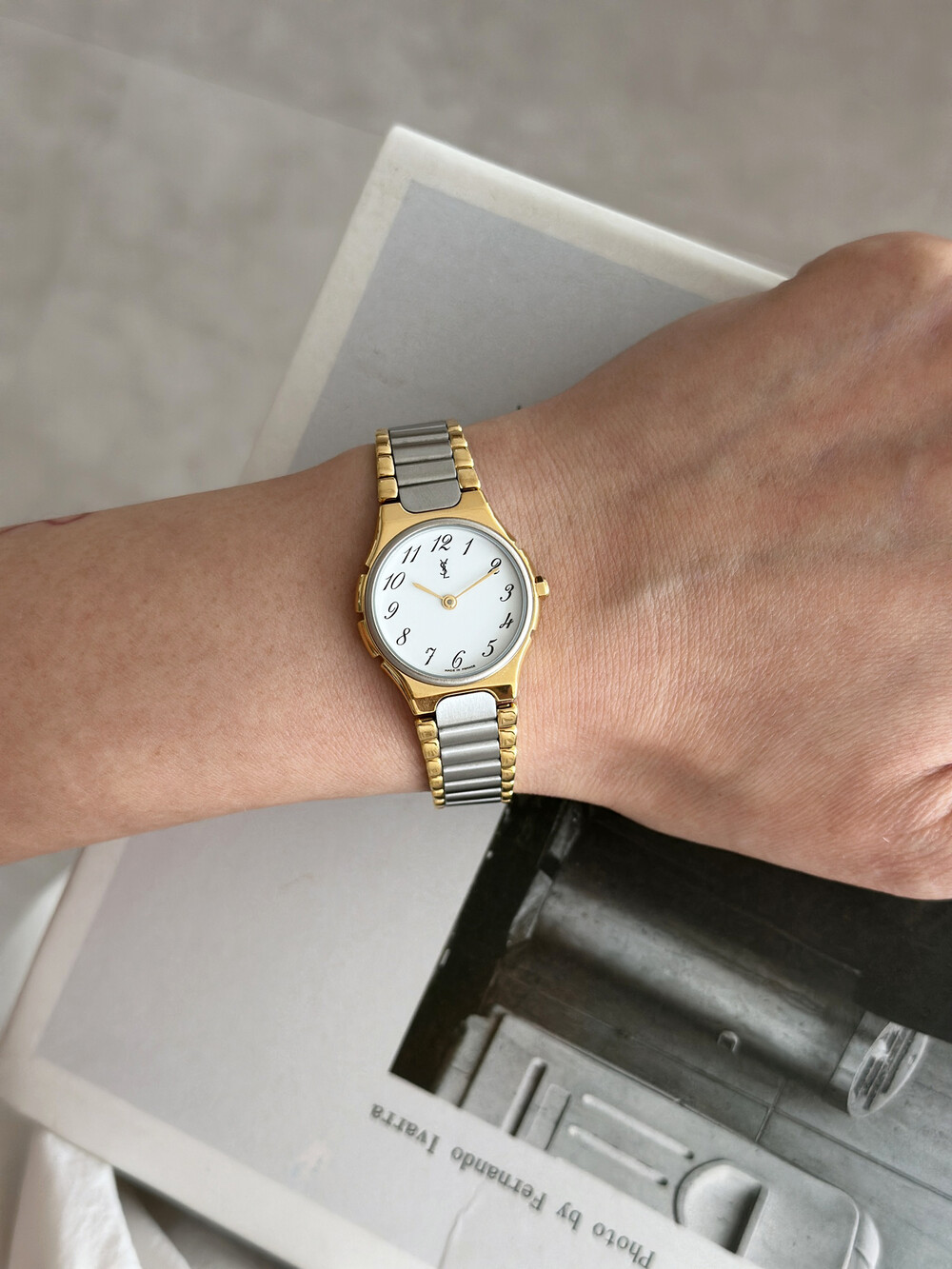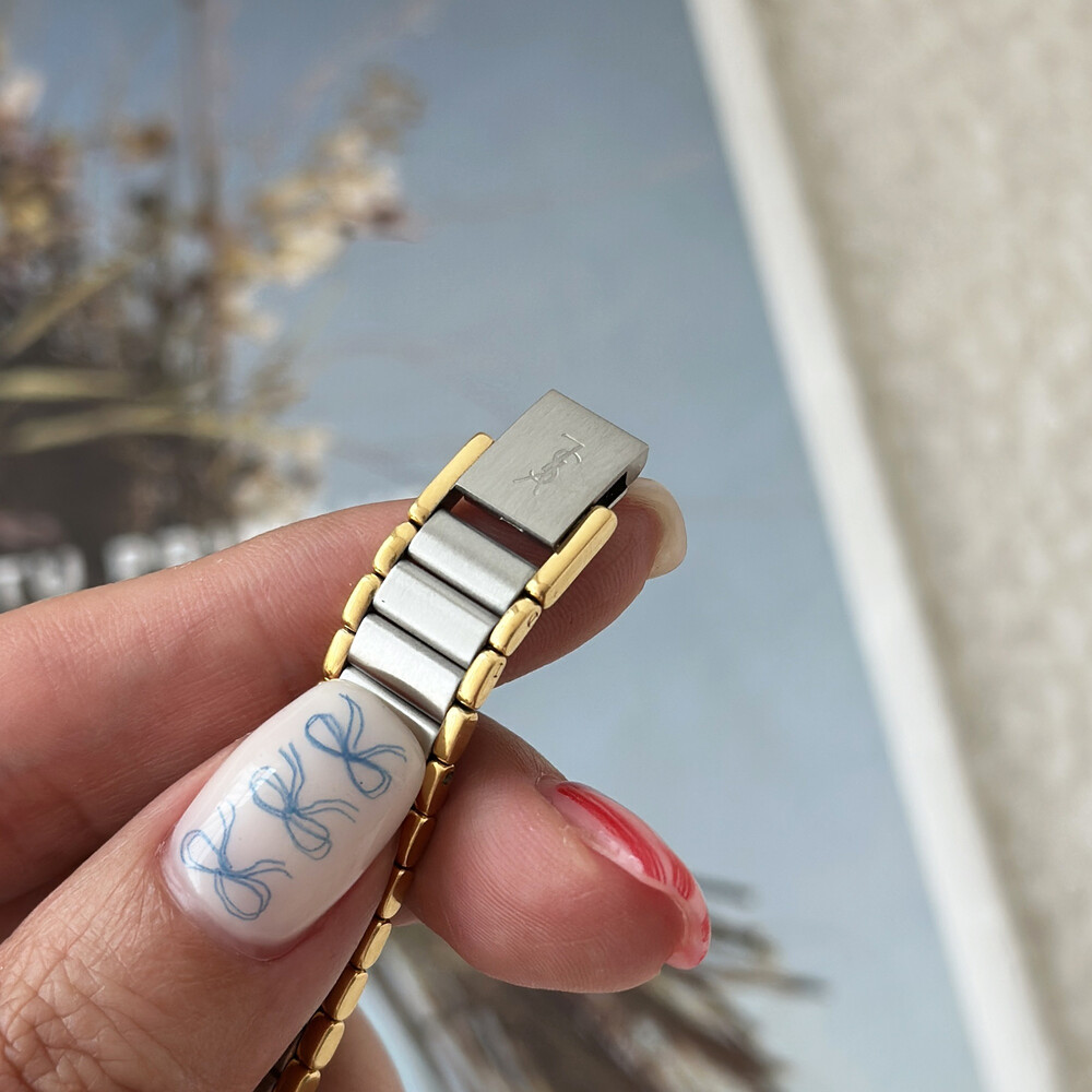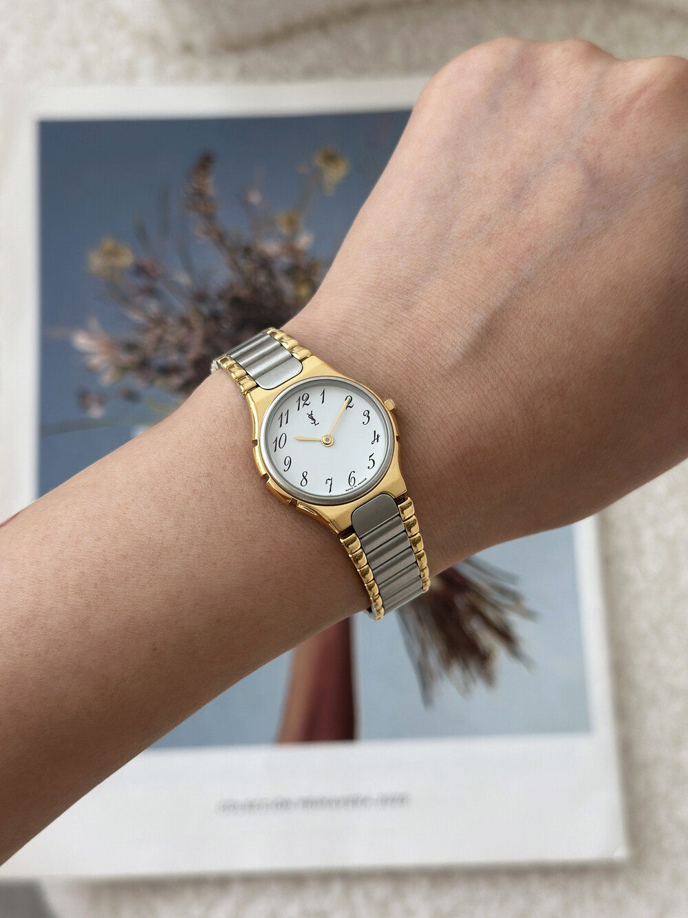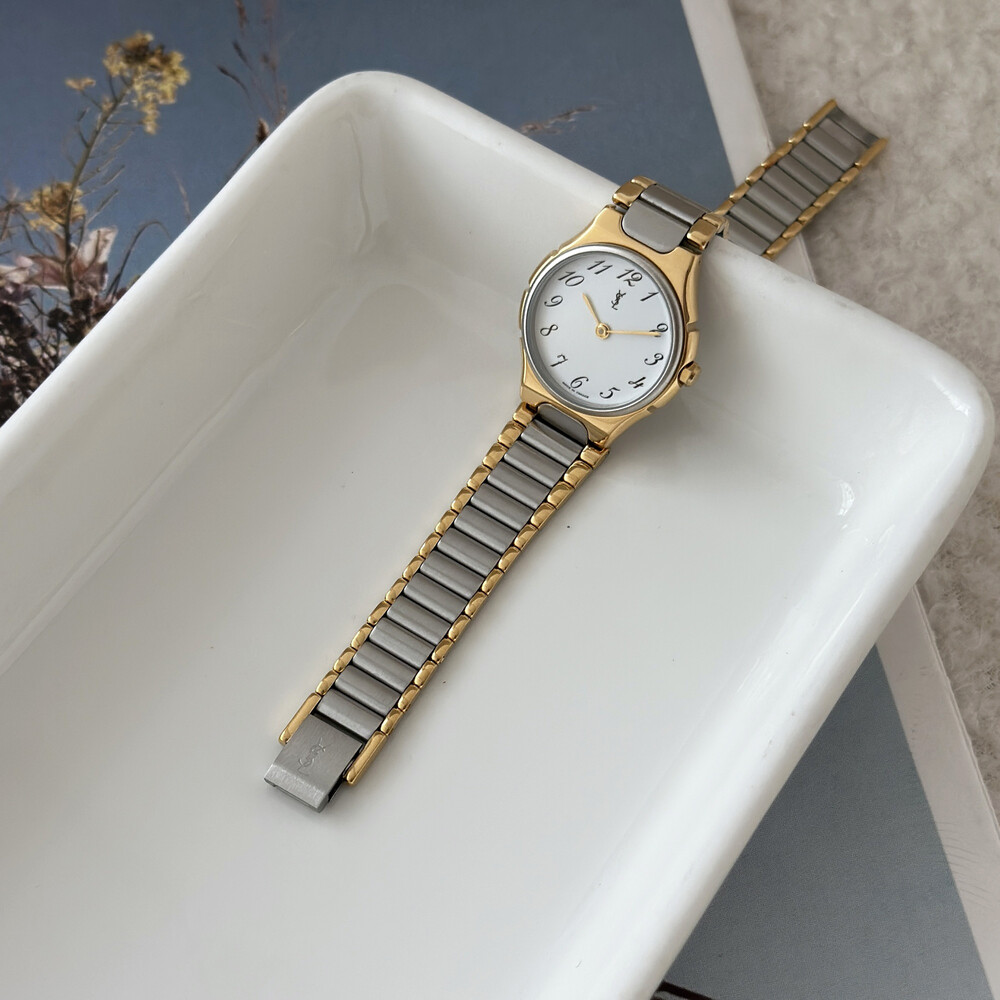 여성용으로 제작된 생로랑 시계이며 쿼츠 무브먼트로 제작되었습니다.