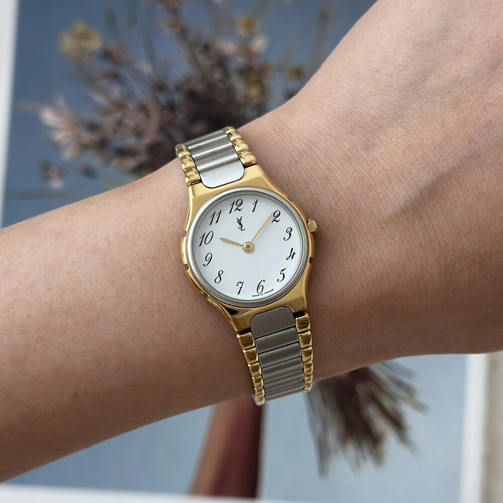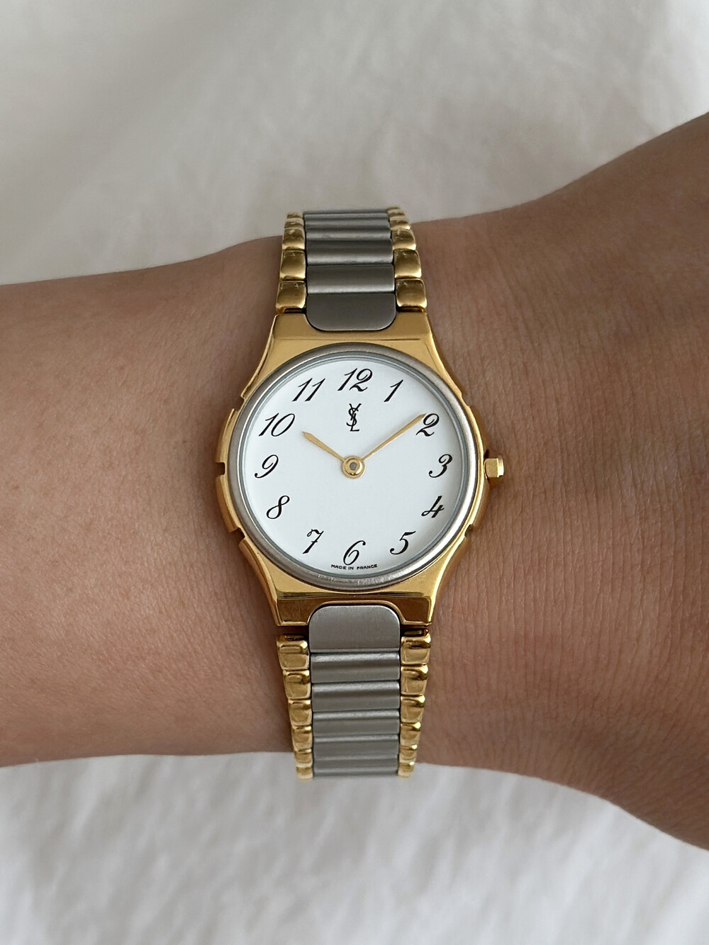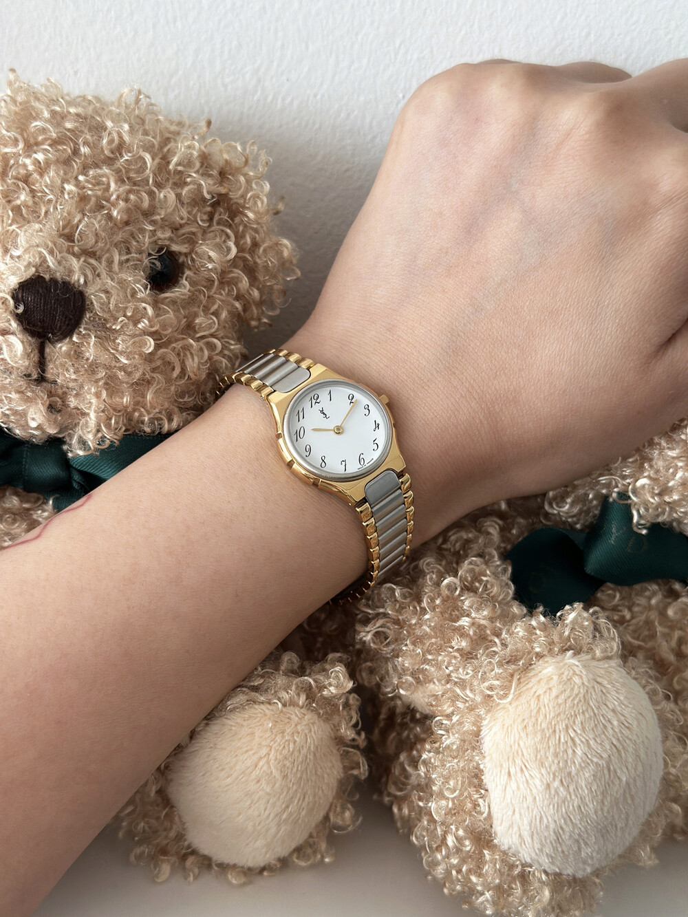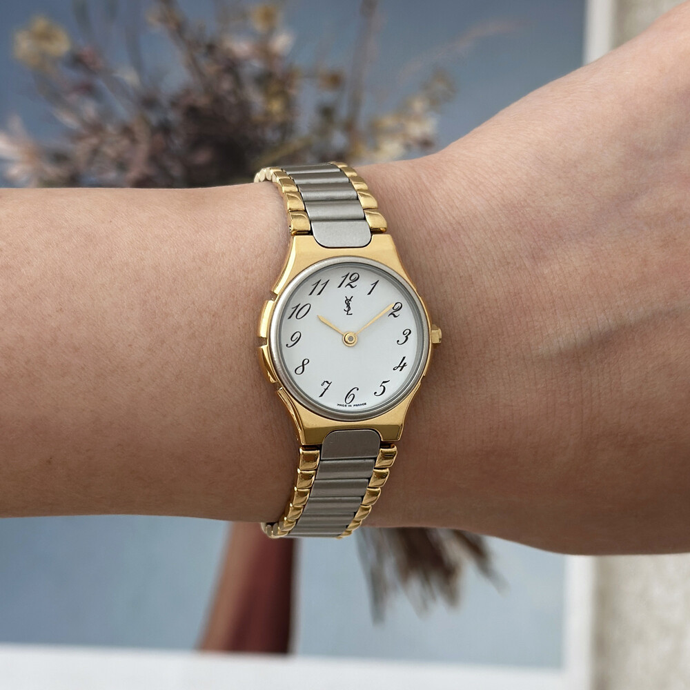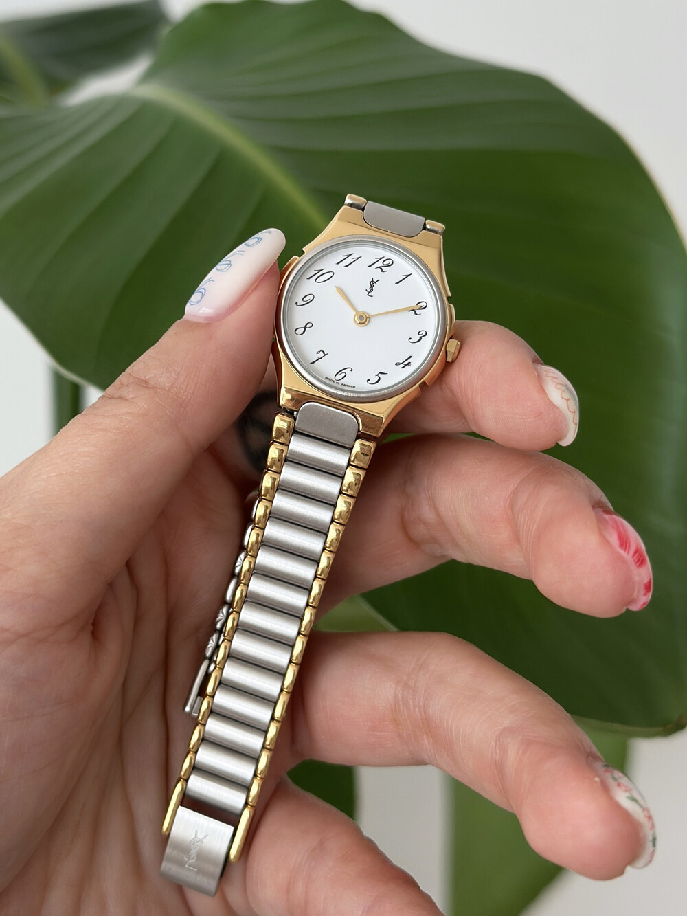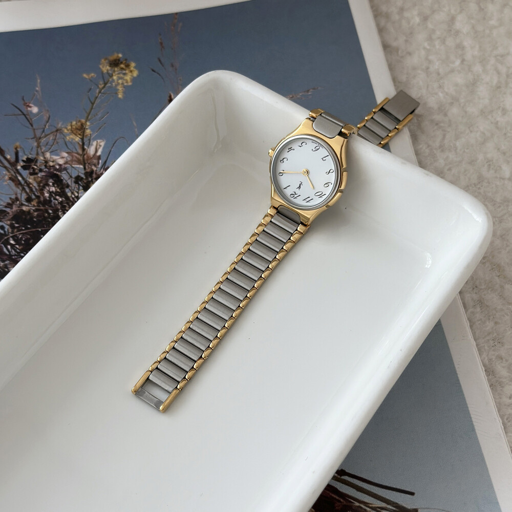 여성용으로 제작된 생로랑 시계이며 쿼츠 무브먼트로 제작되었습니다.
