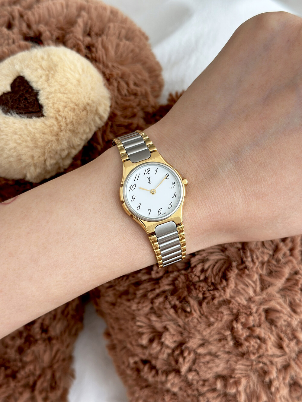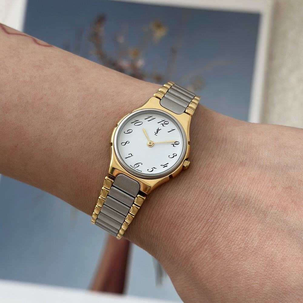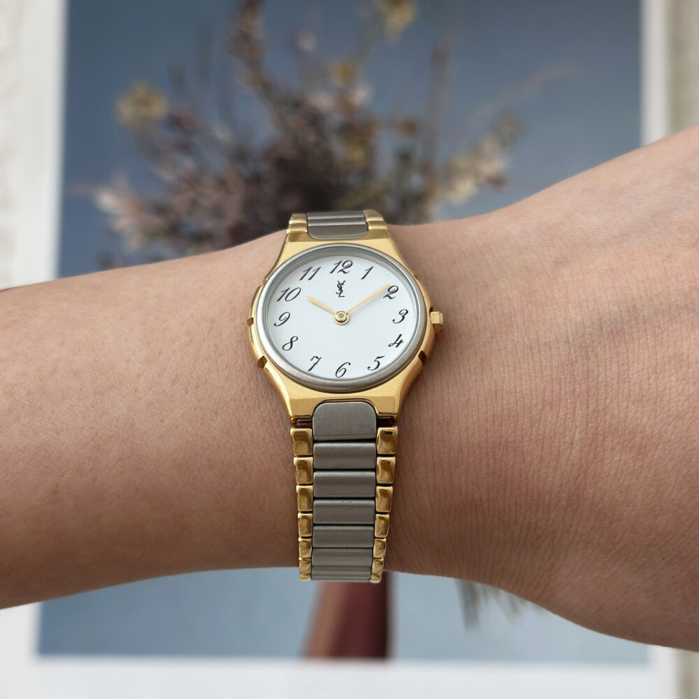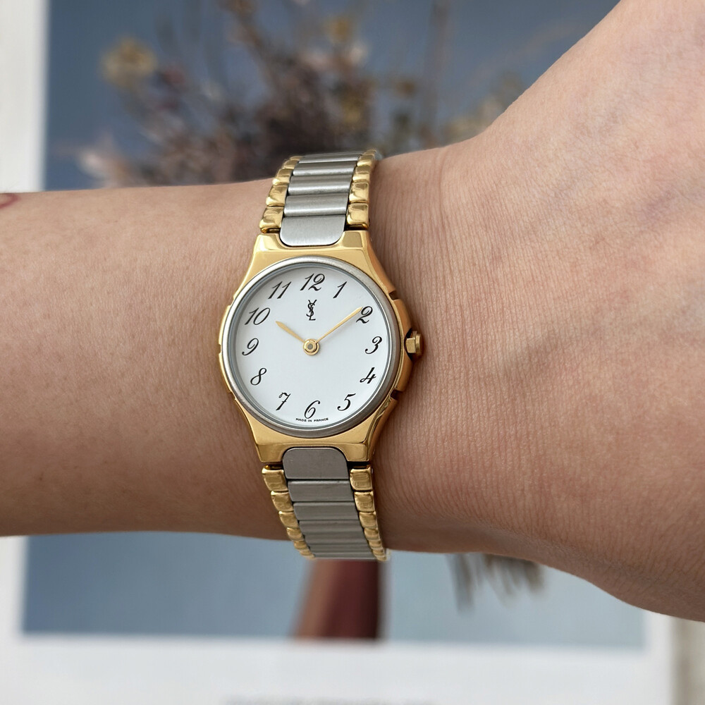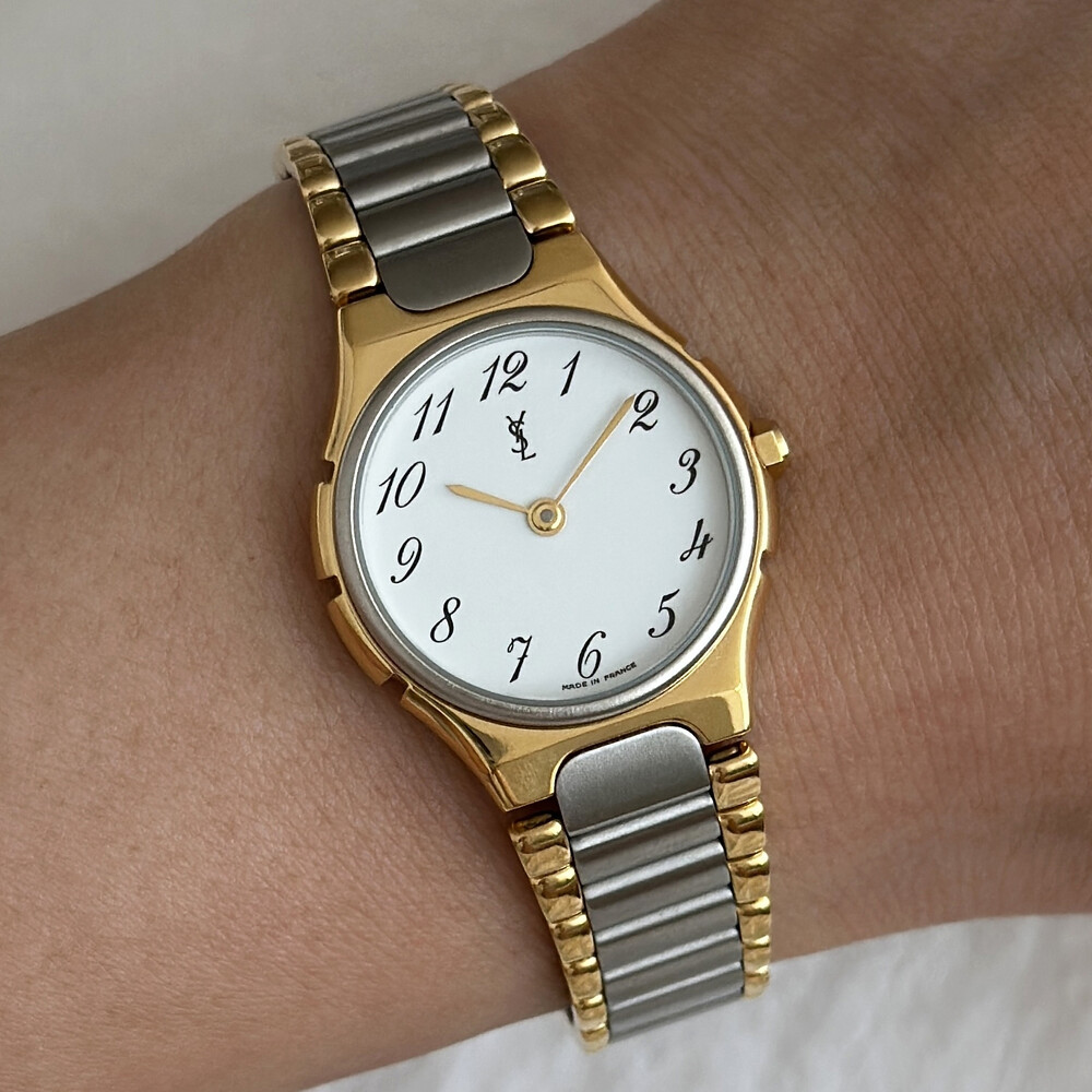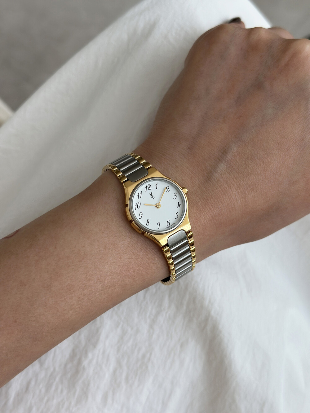 여성용으로 제작된 생로랑 시계이며 쿼츠 무브먼트로 제작되었습니다.