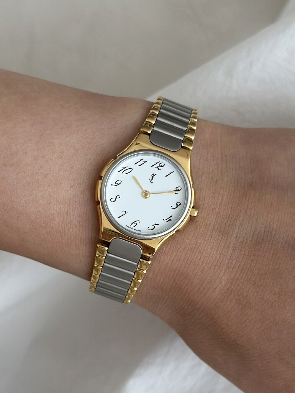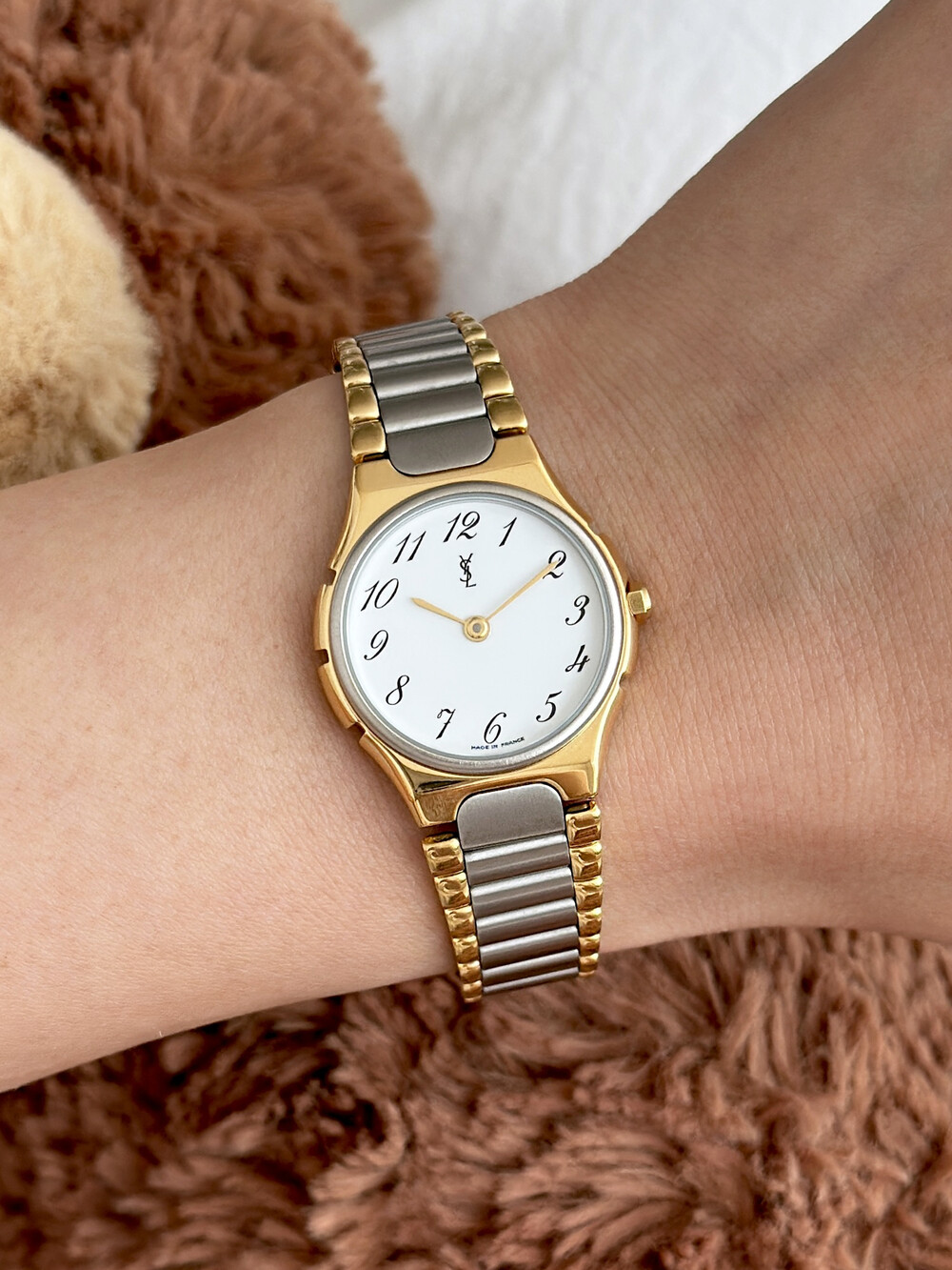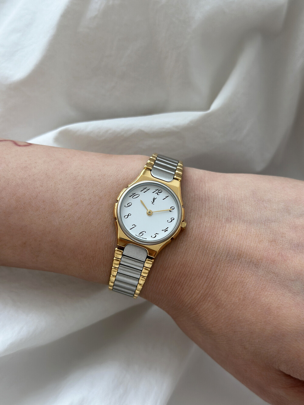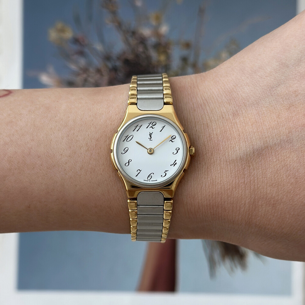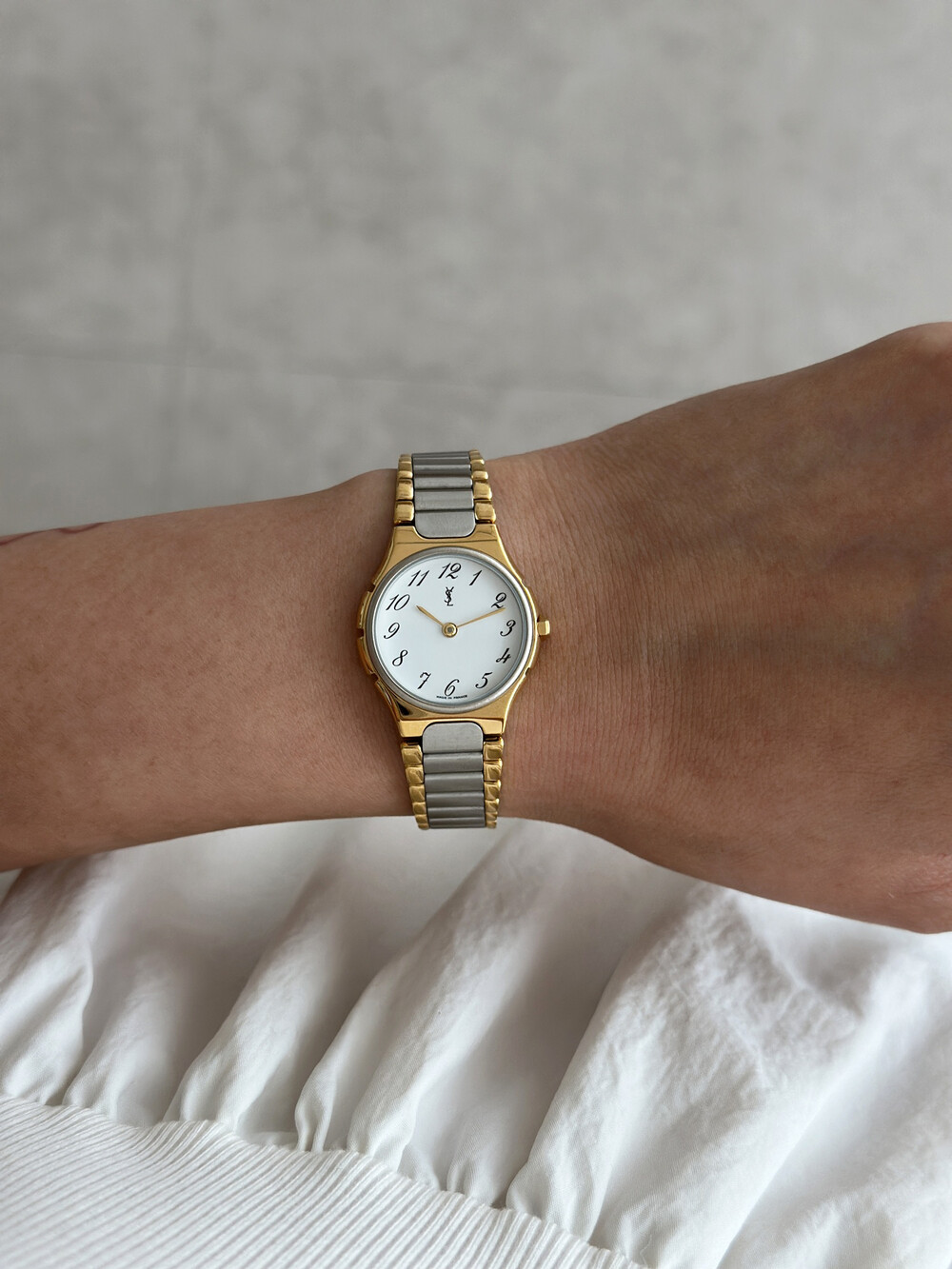 여성용으로 제작된 생로랑 시계이며 쿼츠 무브먼트로 제작되었습니다.