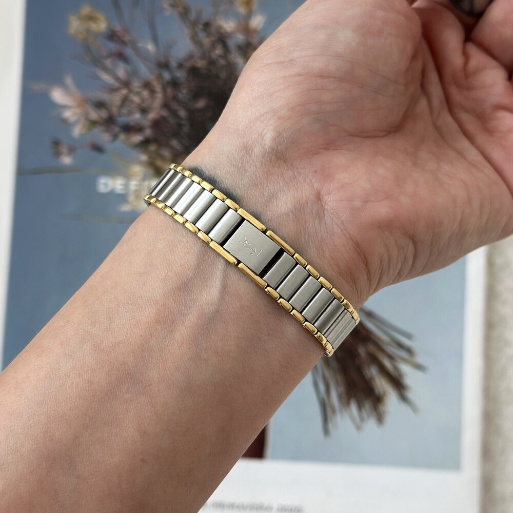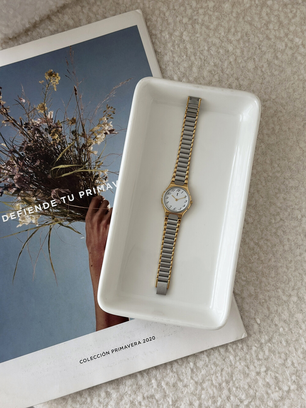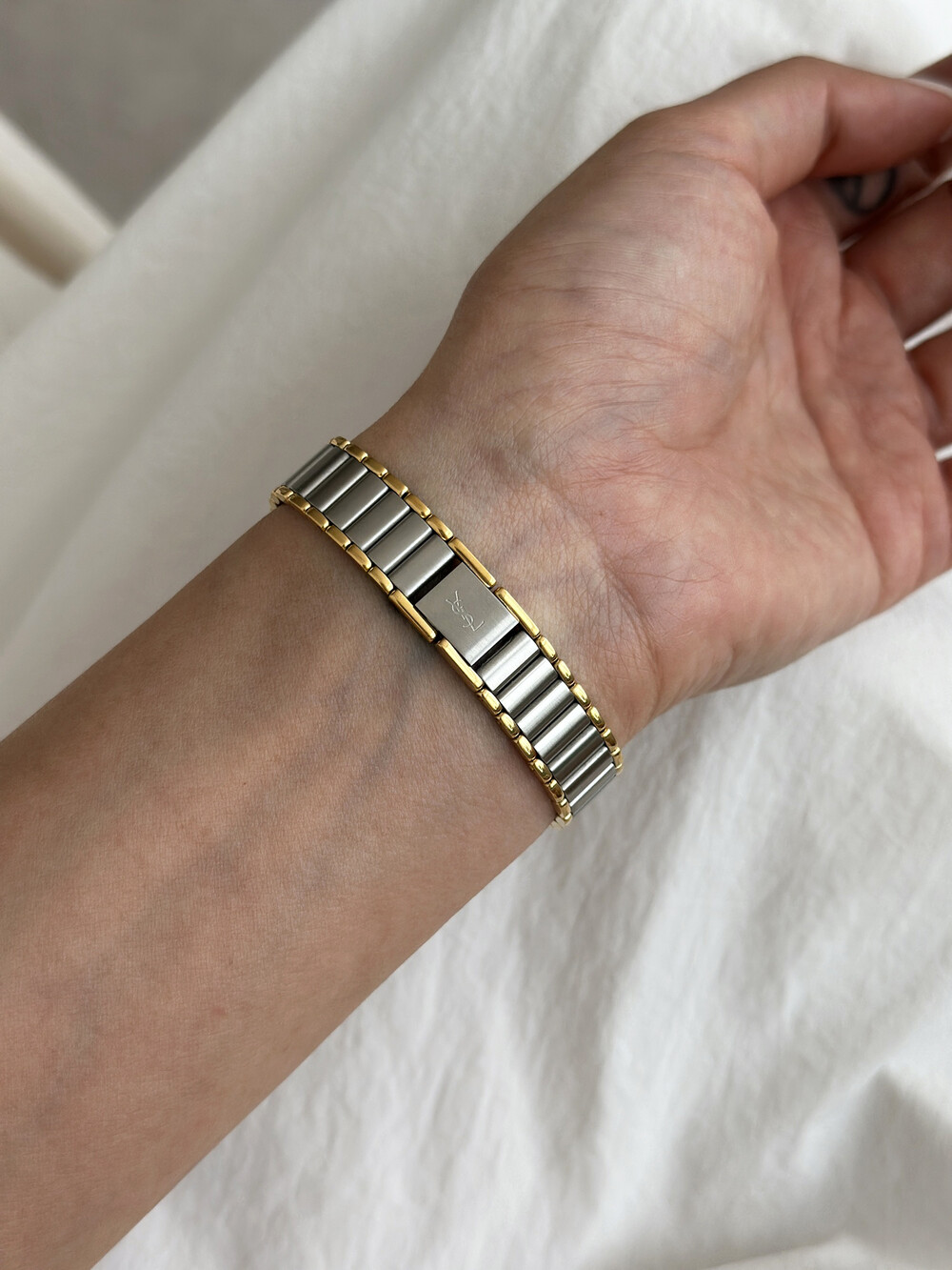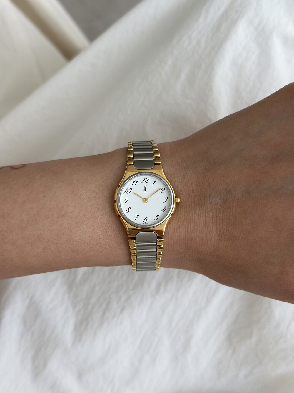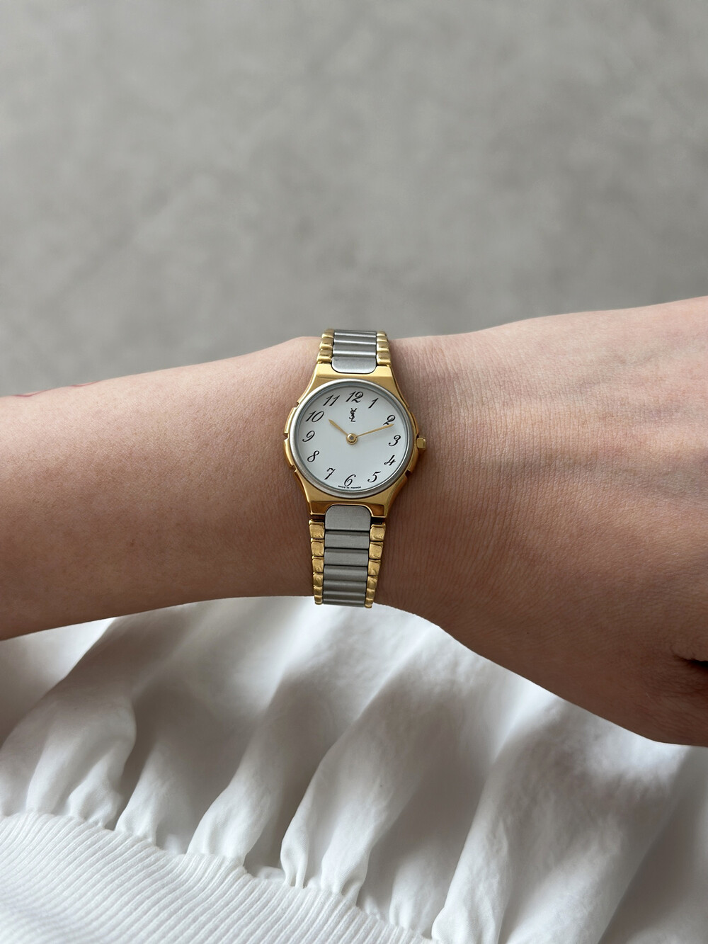 여성용으로 제작된 생로랑 시계이며 쿼츠 무브먼트로 제작되었습니다.
