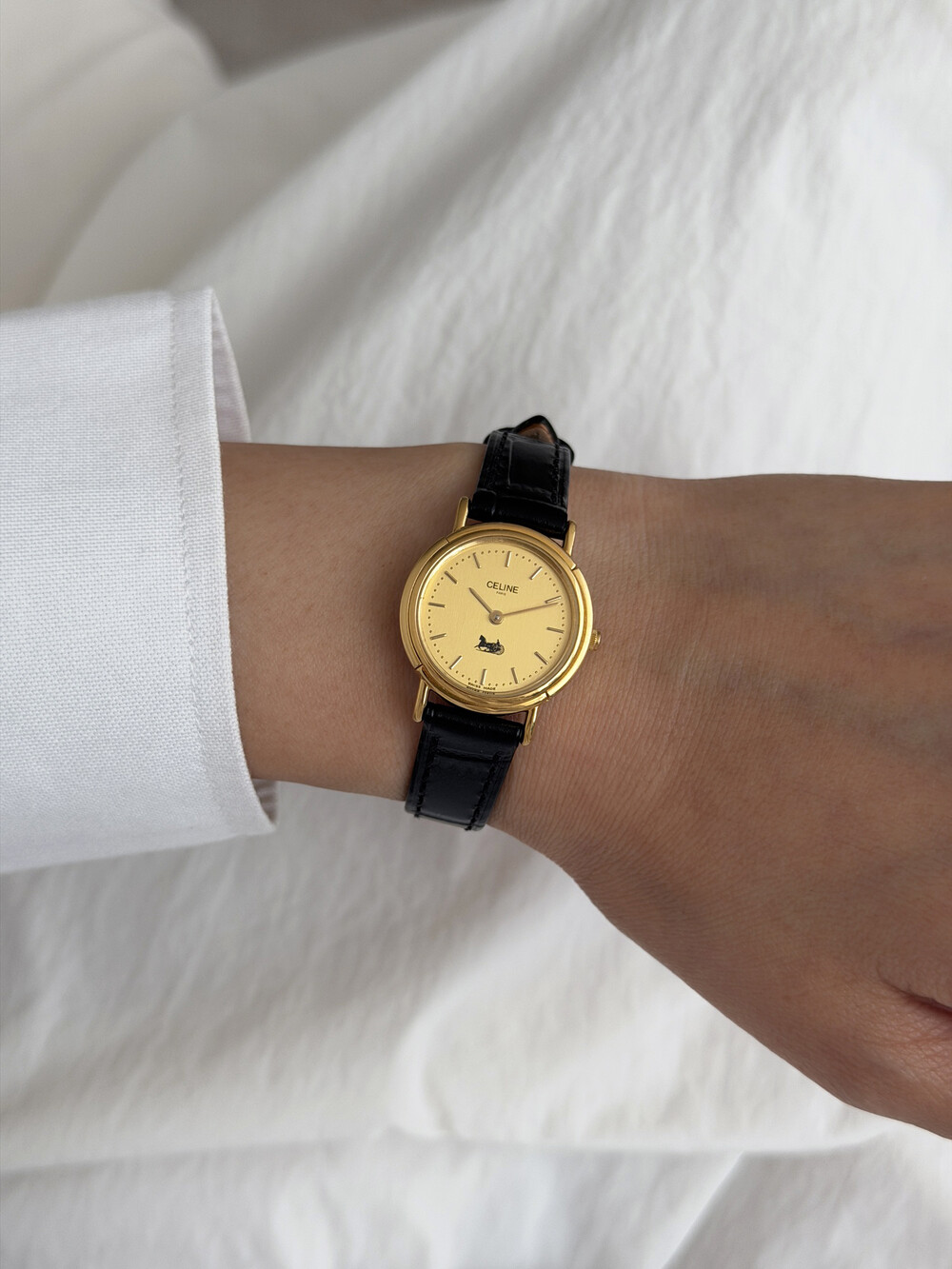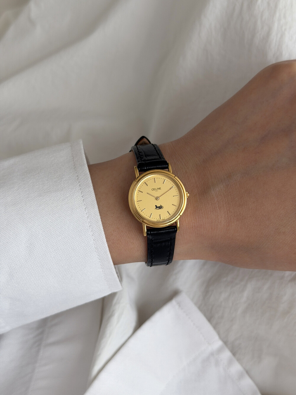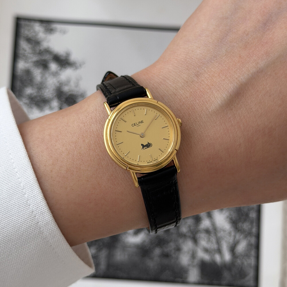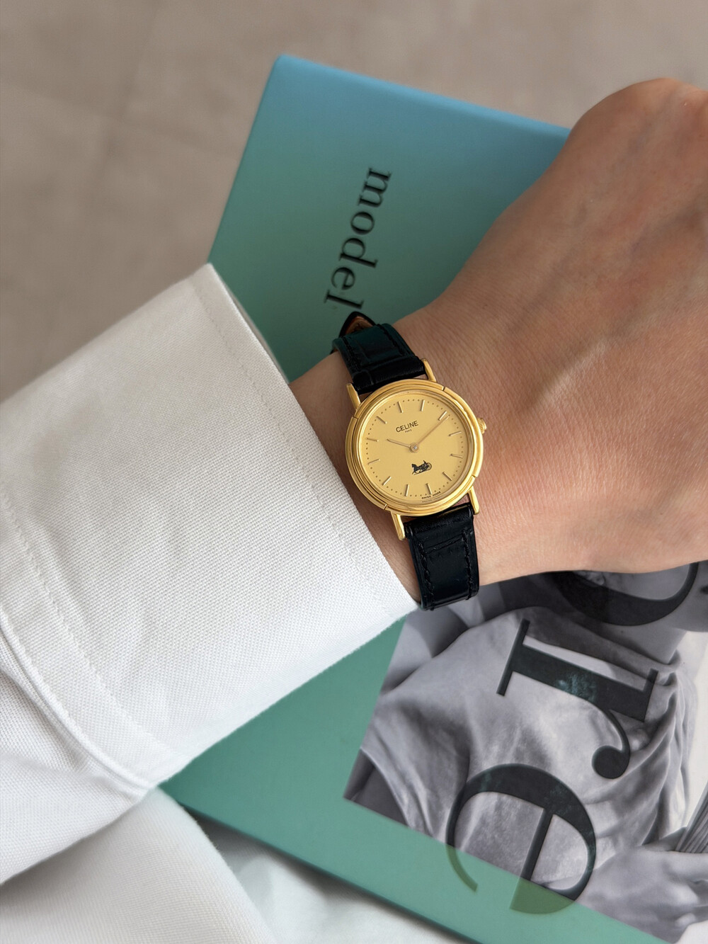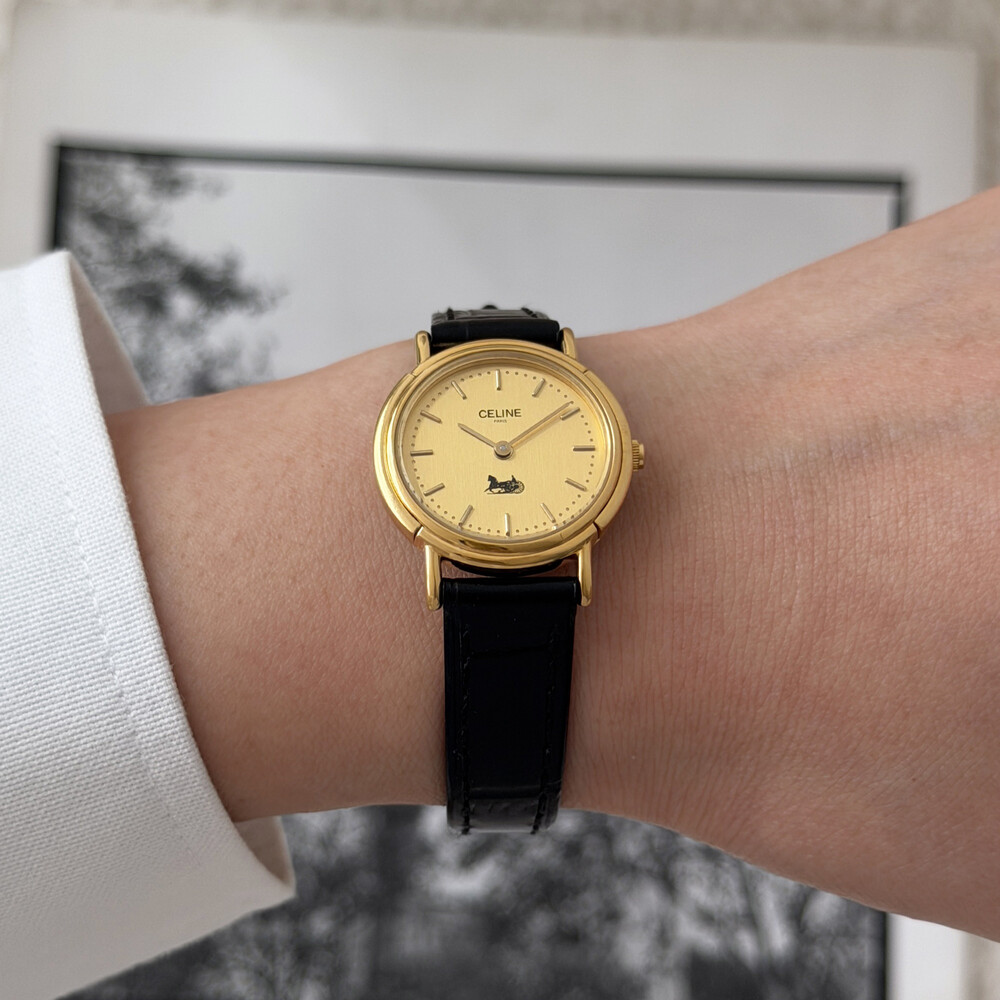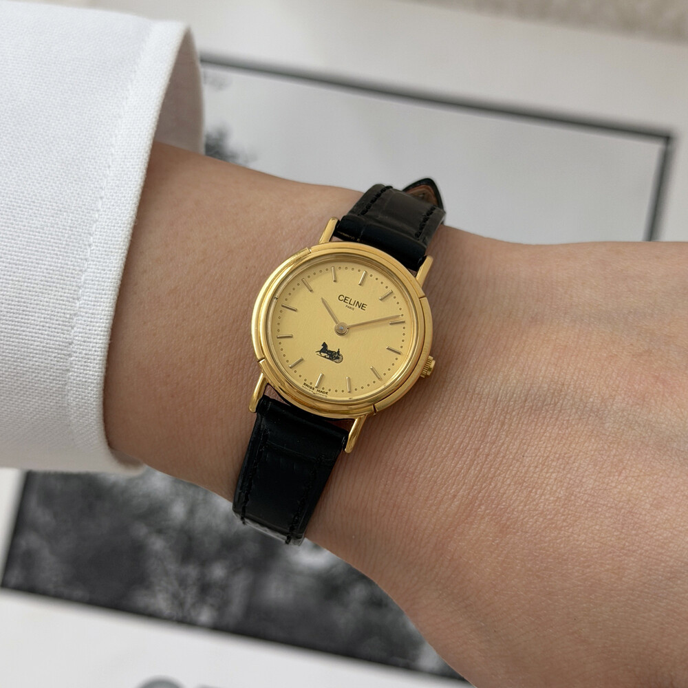 부드러운 골드 톤 케이스와 다이얼 위를 장식하는 셀린느 시그니처 마차 심볼이 매력적인 모델입니다.