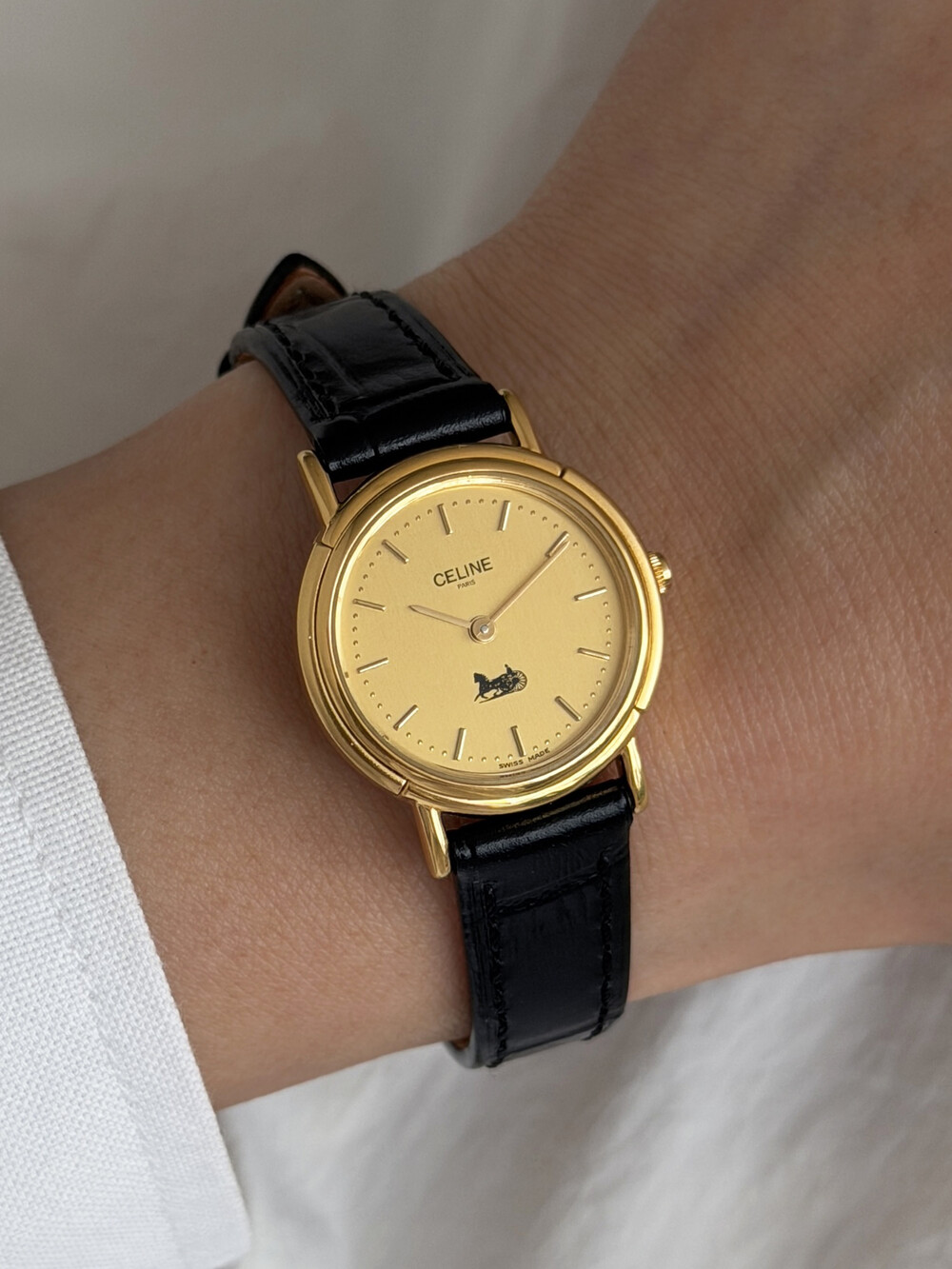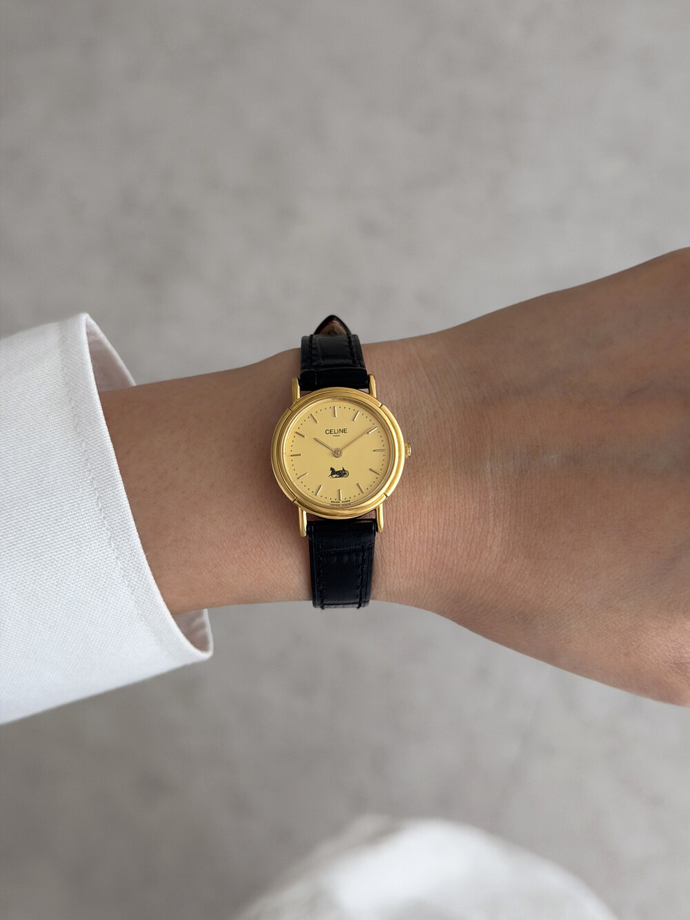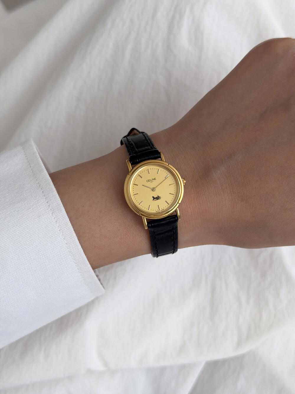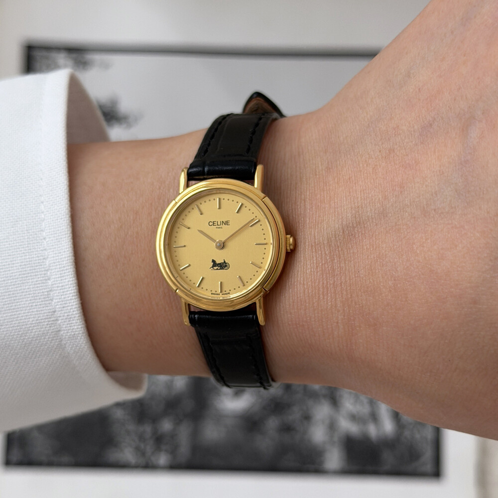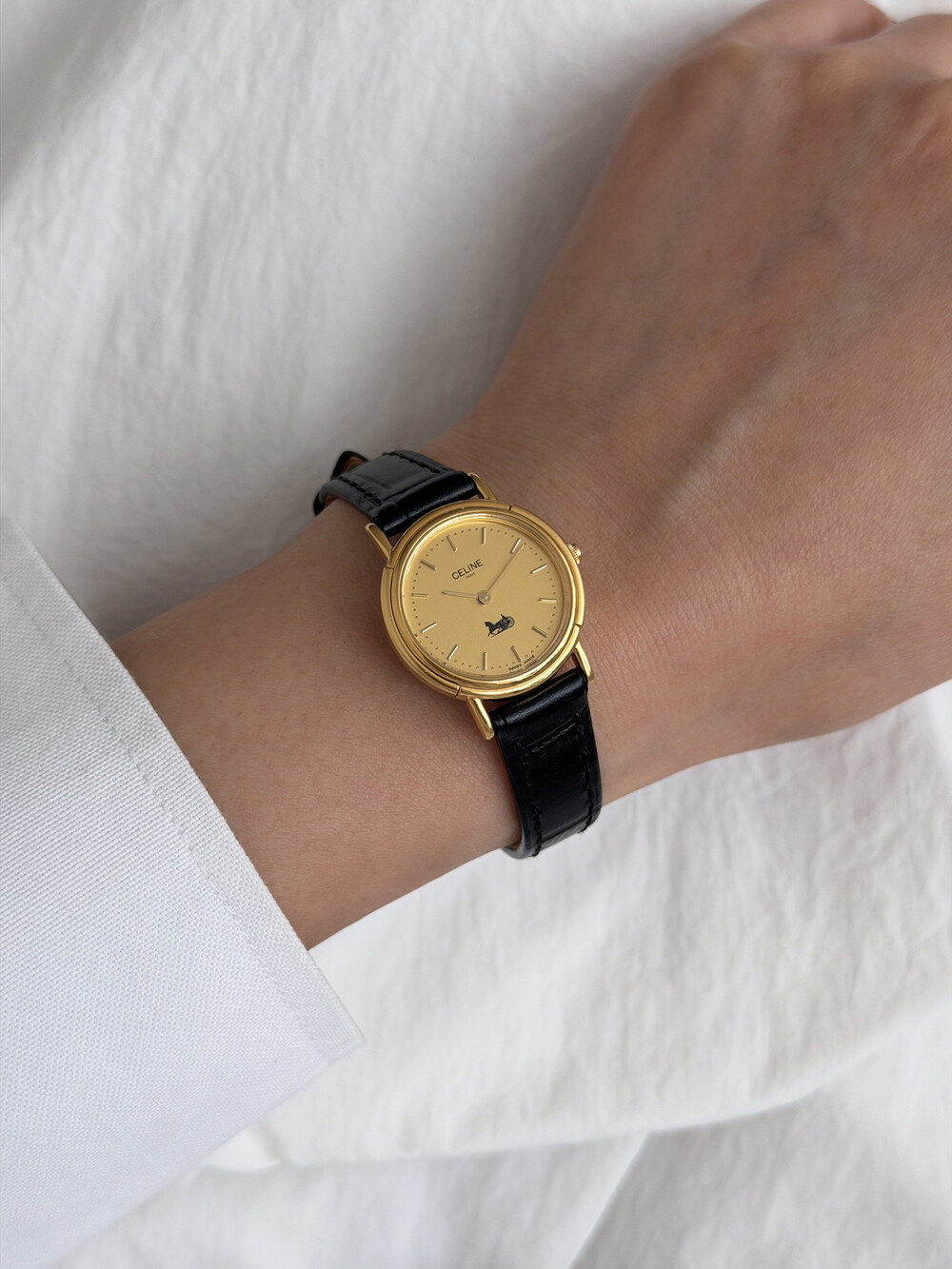 부드러운 골드 톤 케이스와 다이얼 위를 장식하는 셀린느 시그니처 마차 심볼이 매력적인 모델입니다.