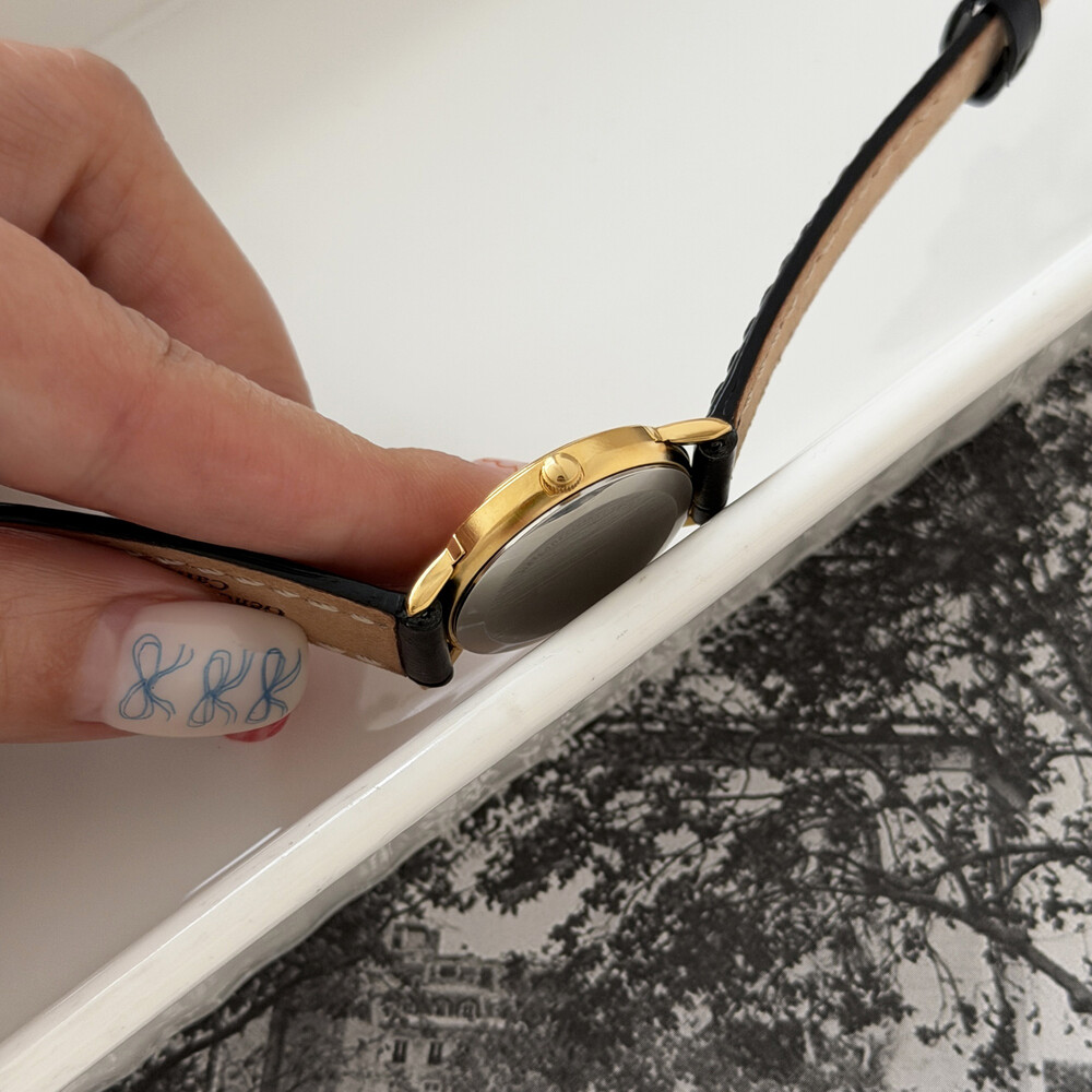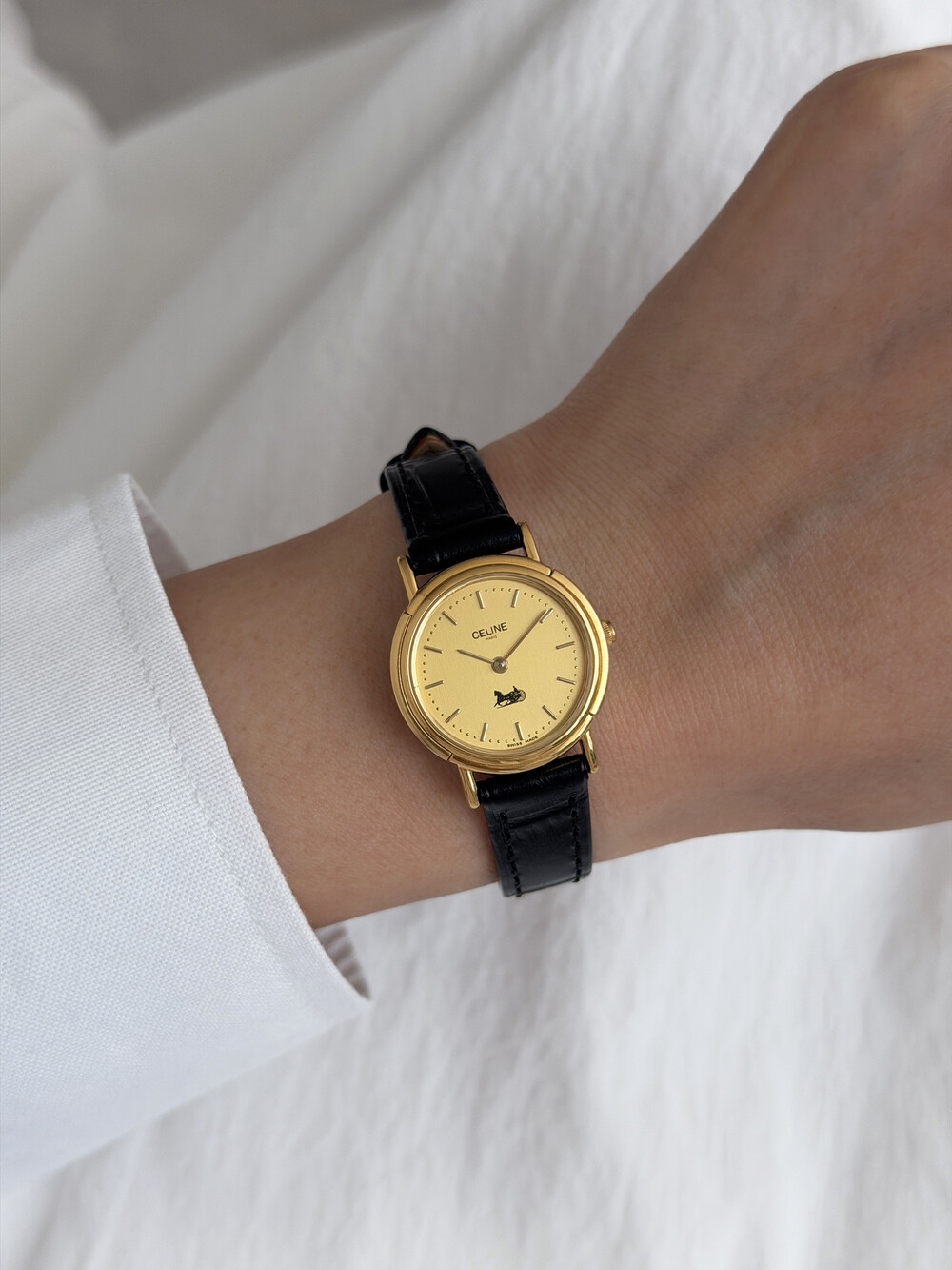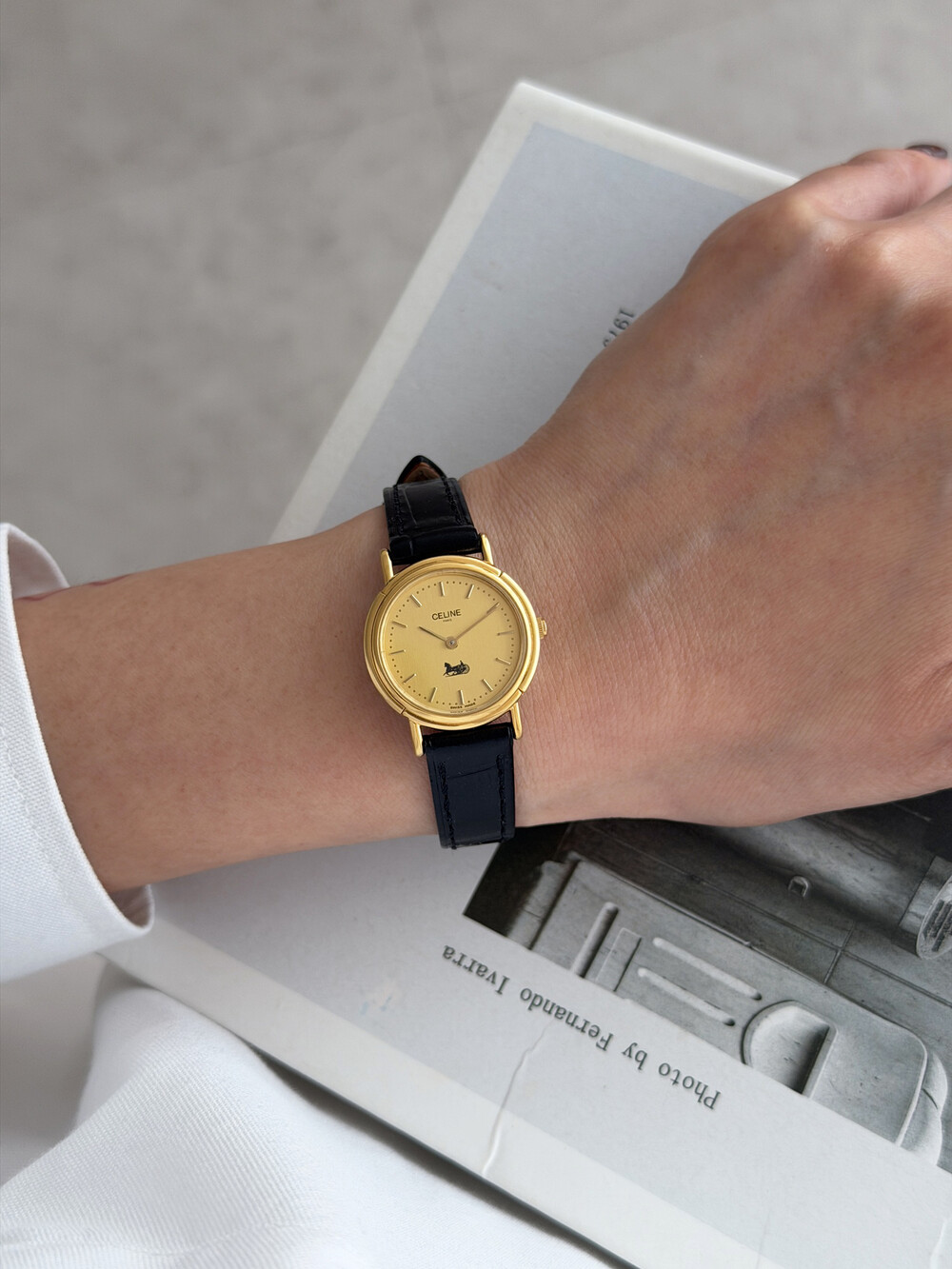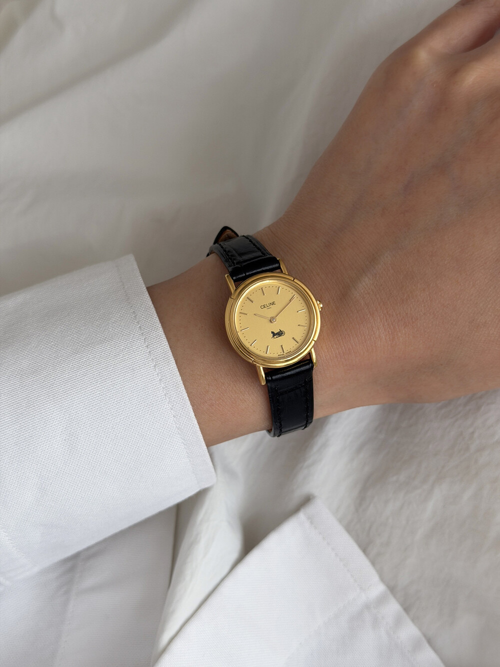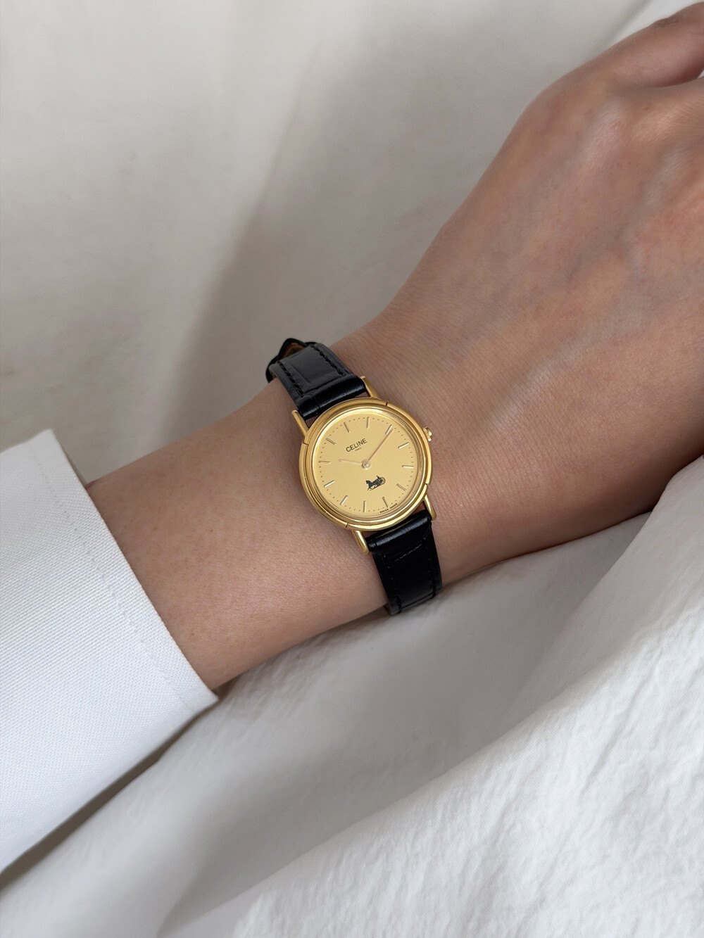부드러운 골드 톤 케이스와 다이얼 위를 장식하는 셀린느 시그니처 마차 심볼이 매력적인 모델입니다.