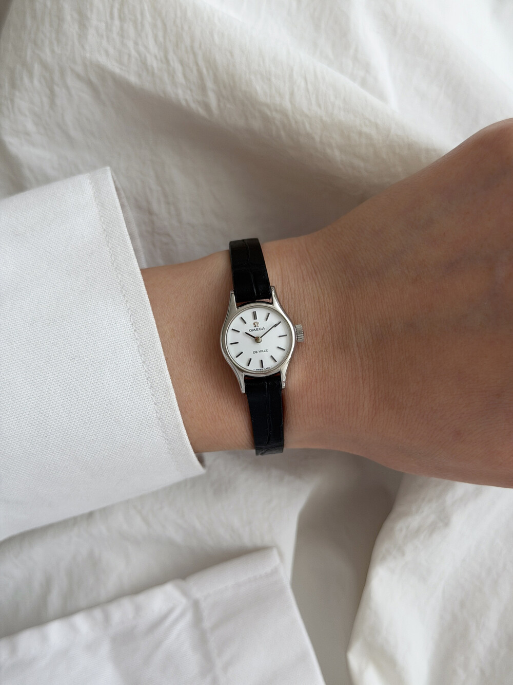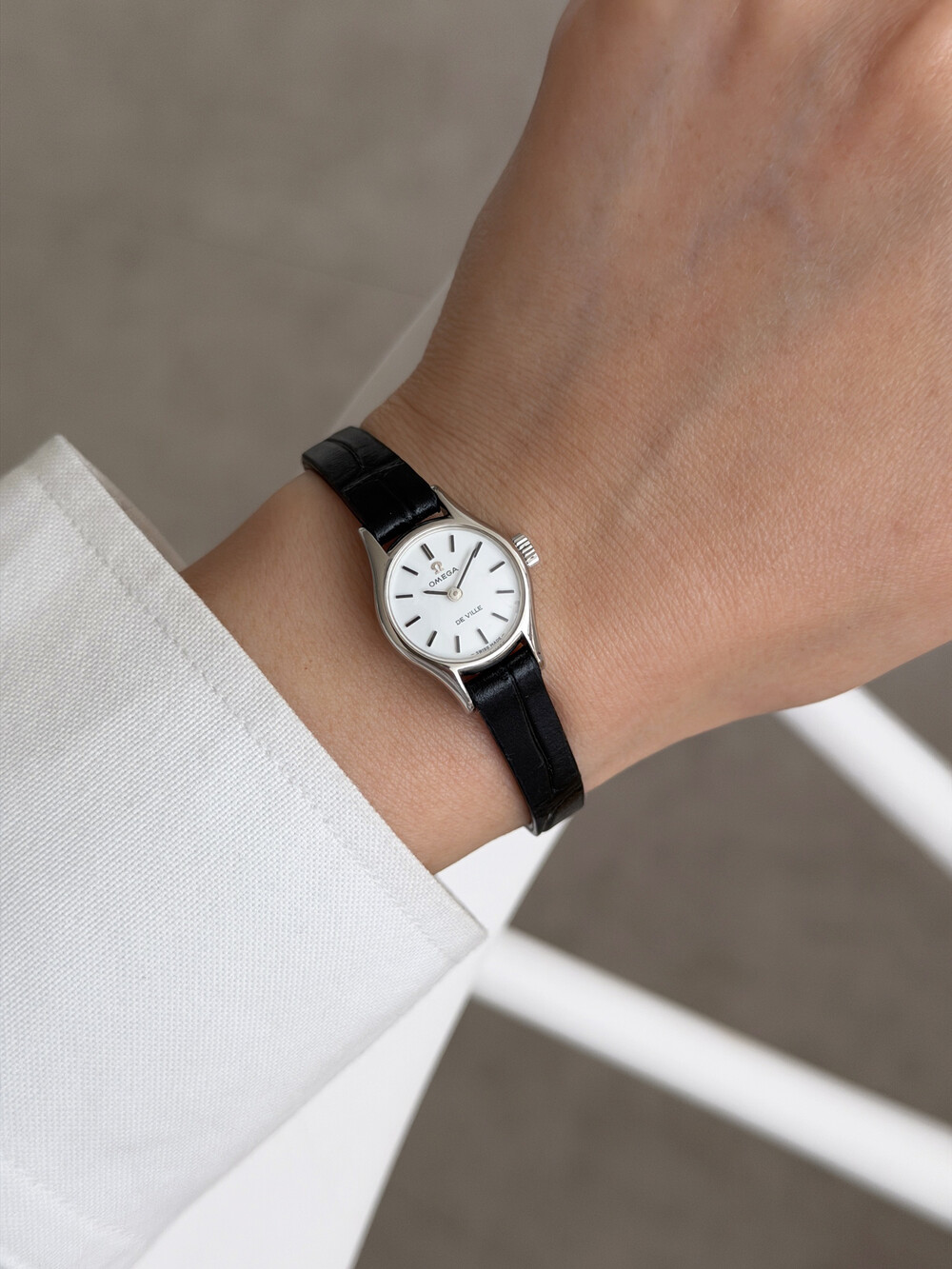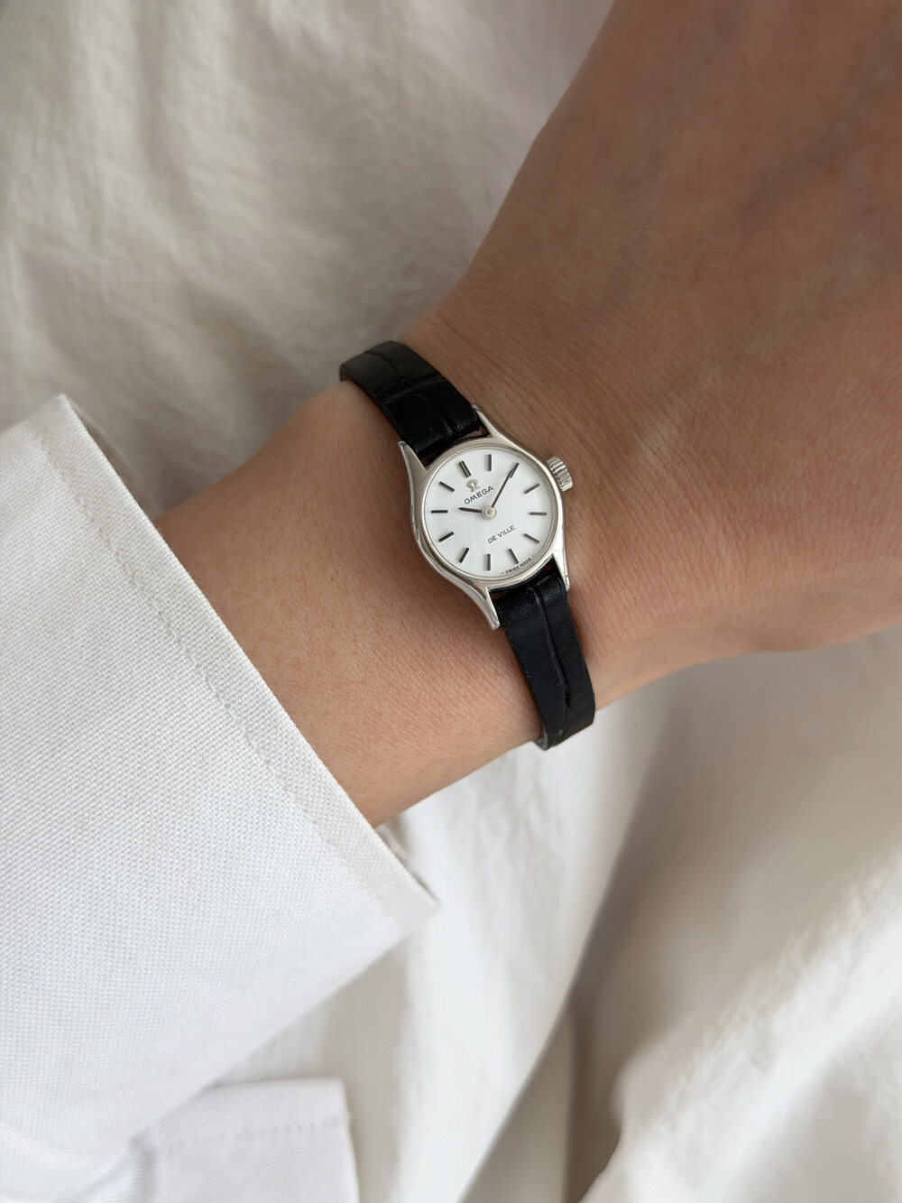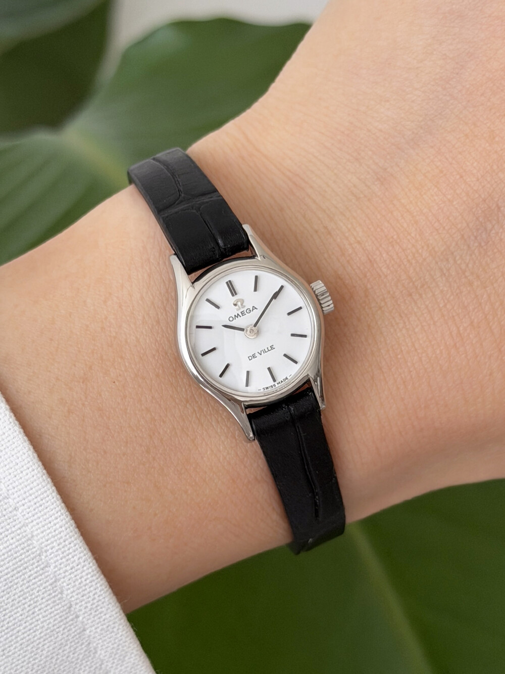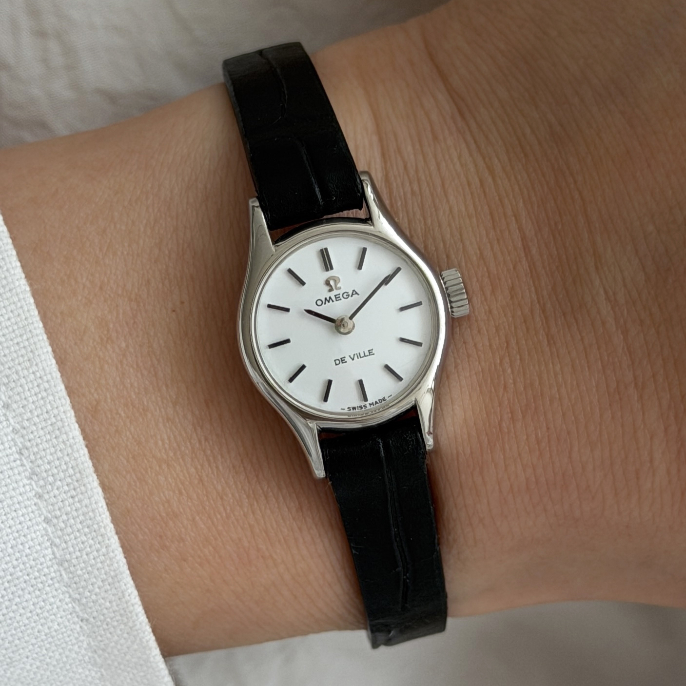 1969년도에 제작된 오메가 드빌 모델로 깔끔한 화이트 다이얼 위를 장식하는