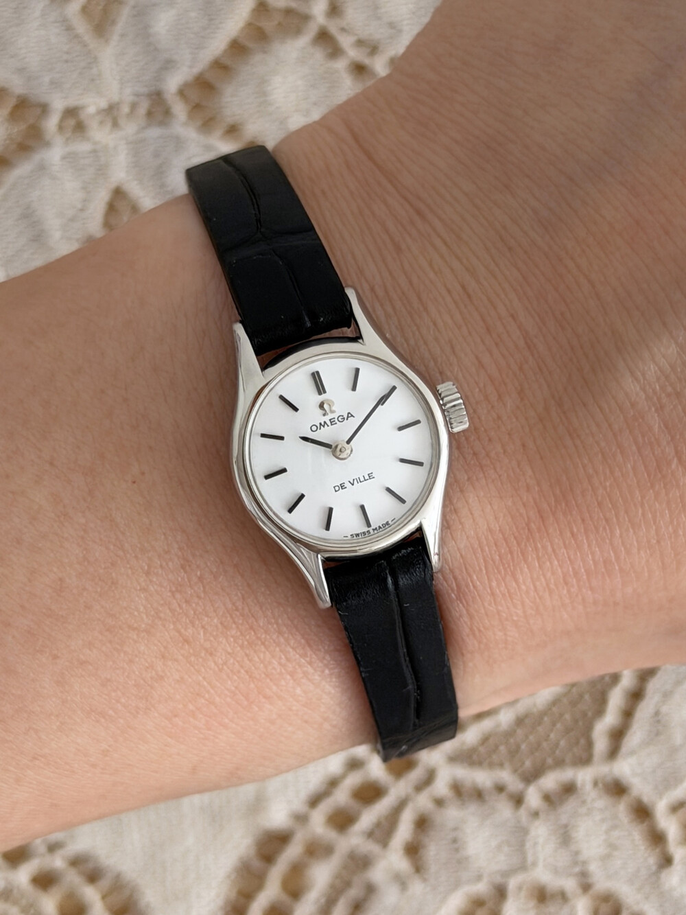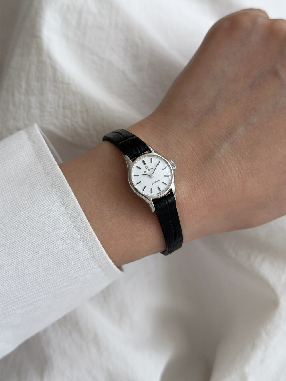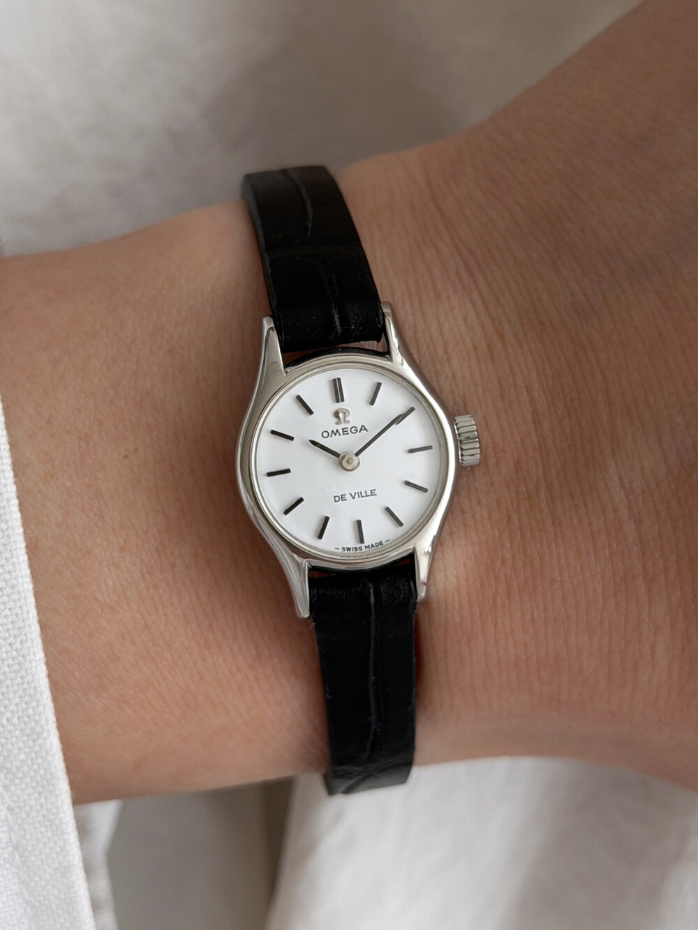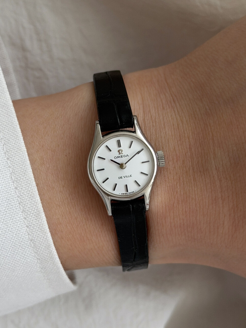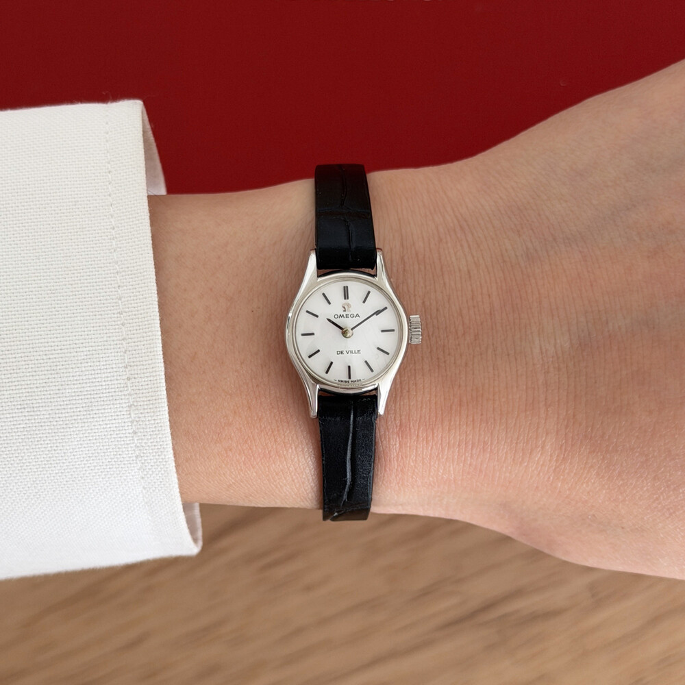 1969년도에 제작된 오메가 드빌 모델로 깔끔한 화이트 다이얼 위를 장식하는