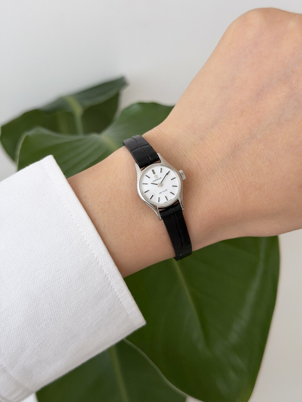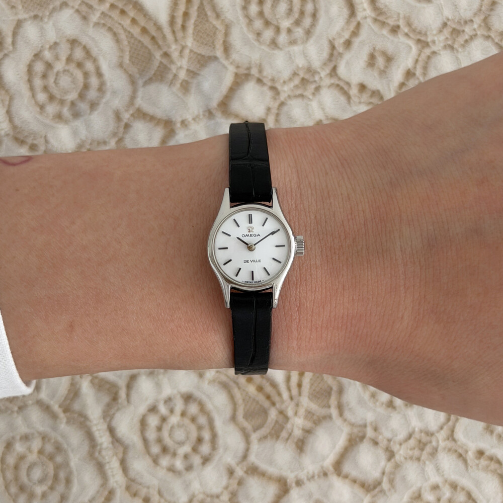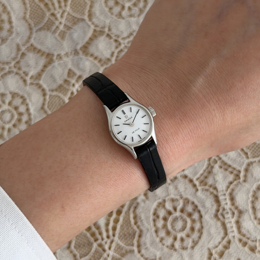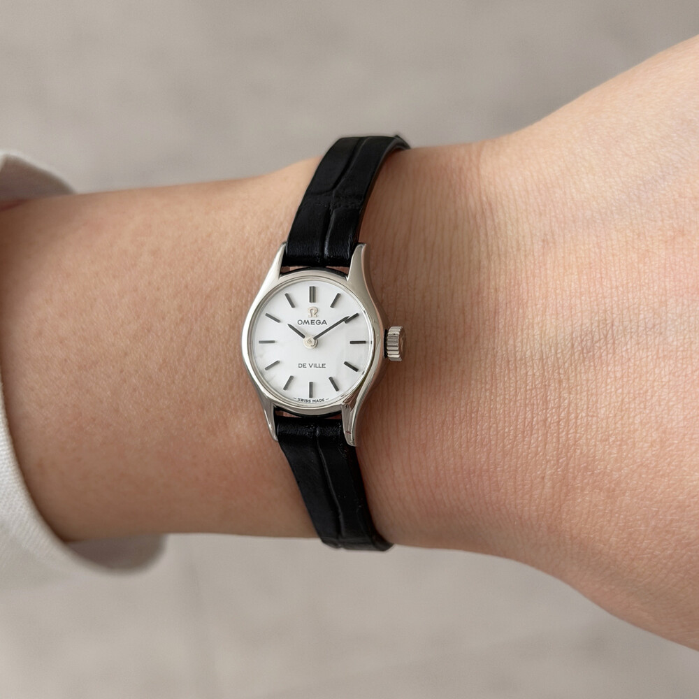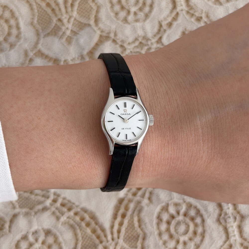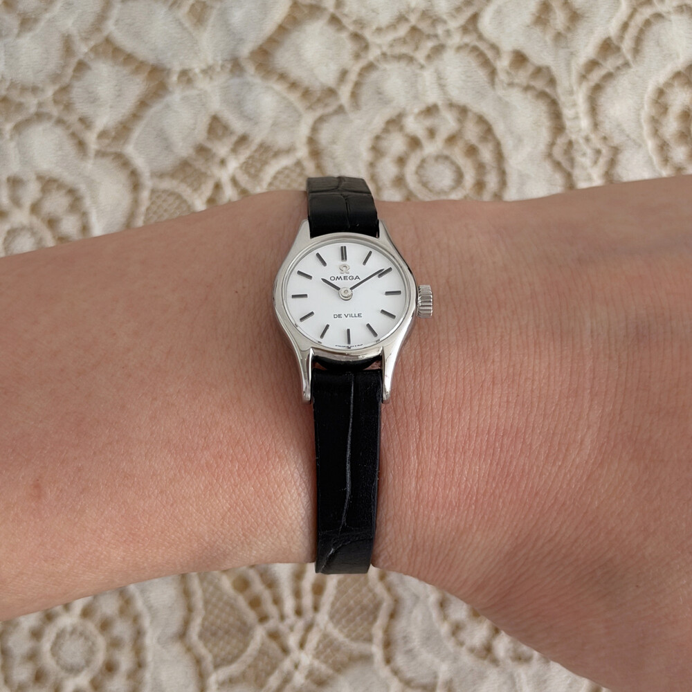 1969년도에 제작된 오메가 드빌 모델로 깔끔한 화이트 다이얼 위를 장식하는