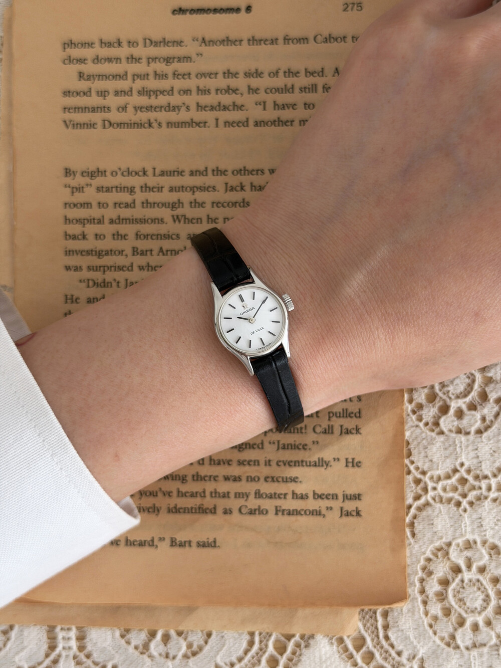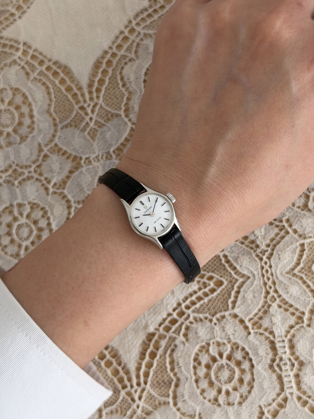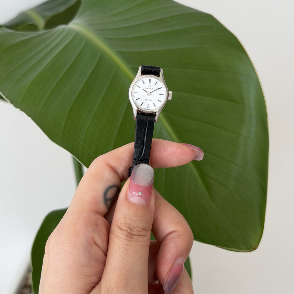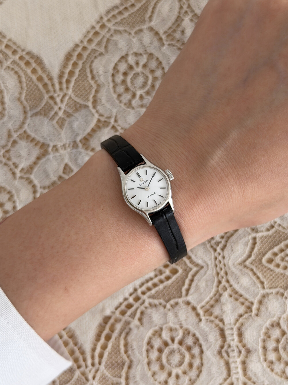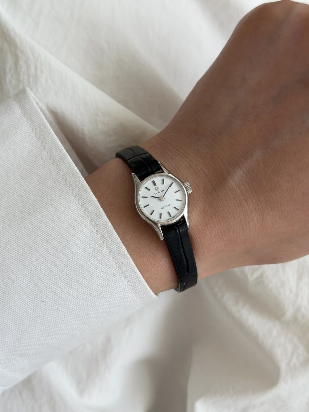 1969년도에 제작된 오메가 드빌 모델로 깔끔한 화이트 다이얼 위를 장식하는