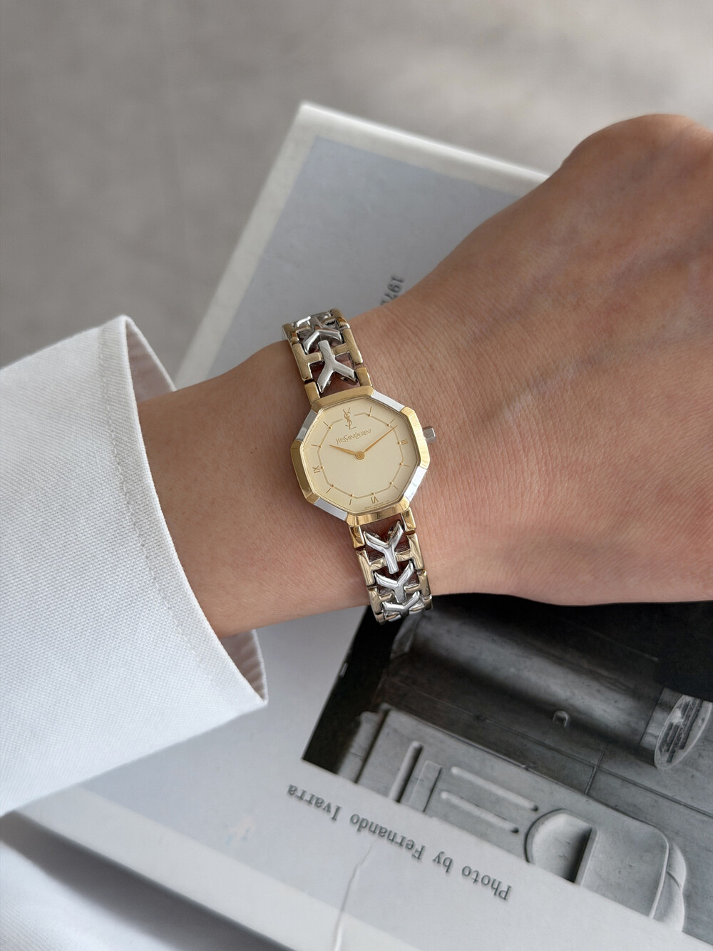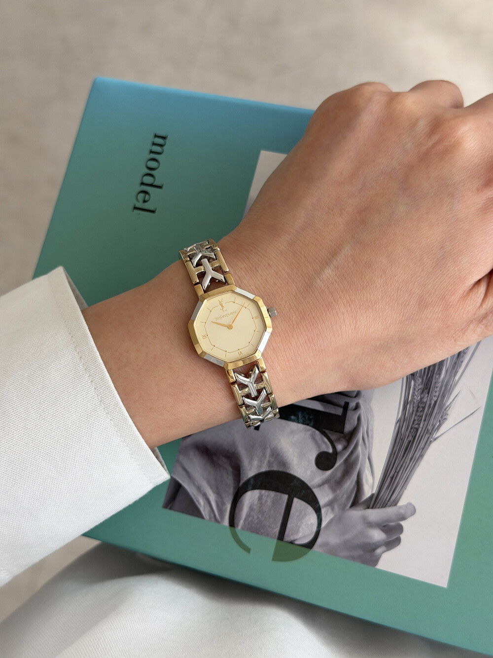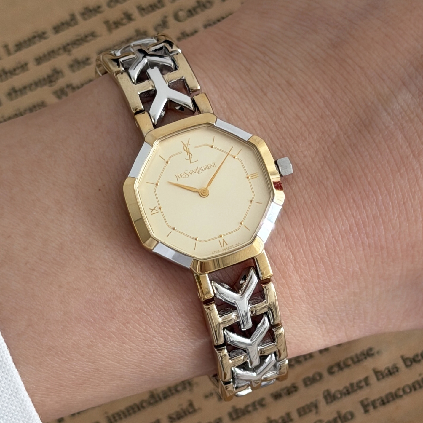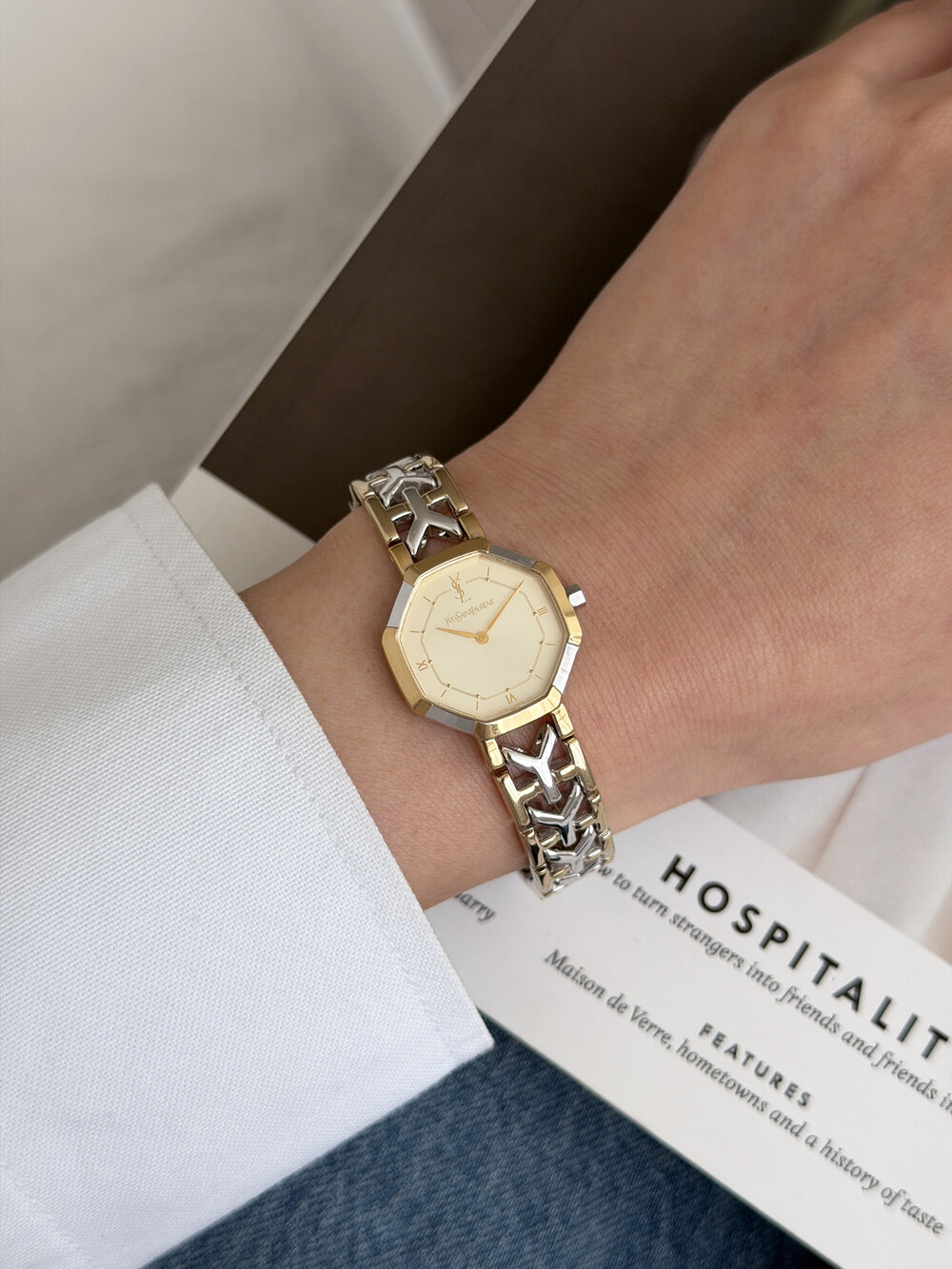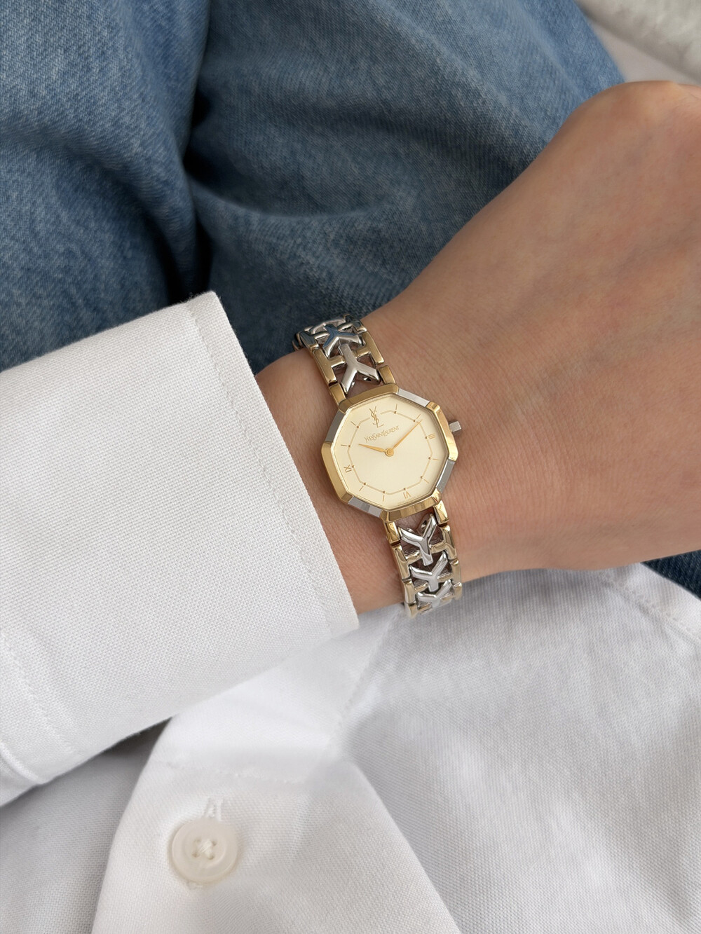 부드러운 골드&실버 투톤 컬러의 케이스와 샴페인톤 다이얼 위를 장식하는 생로랑 YSL 로고가