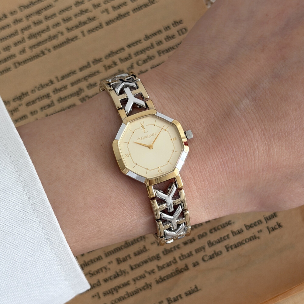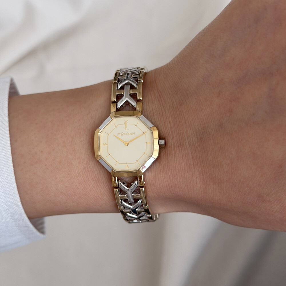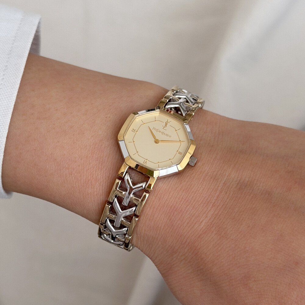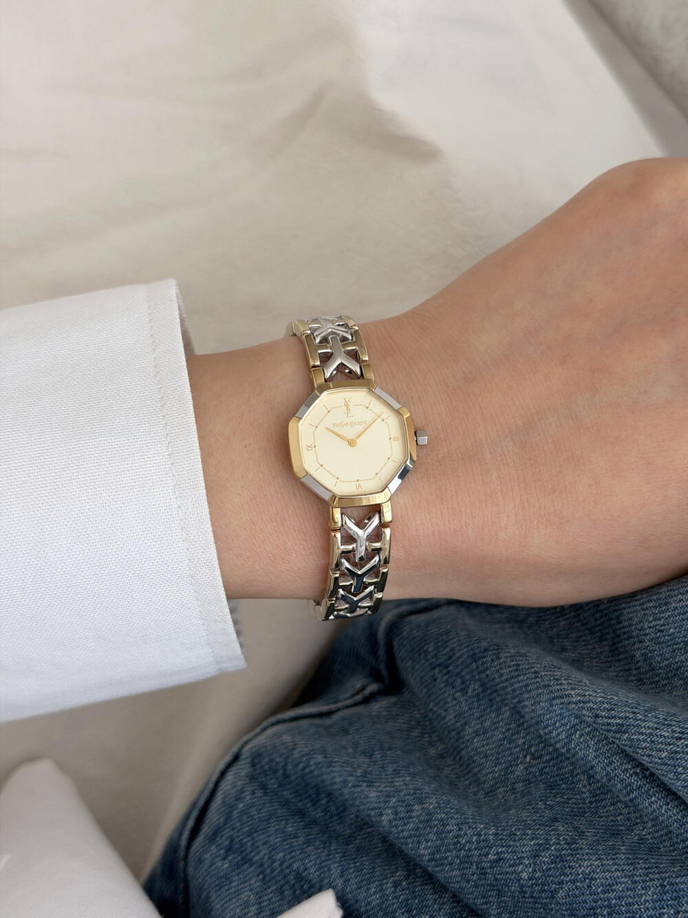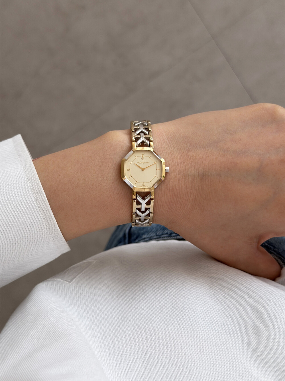 부드러운 골드&실버 투톤 컬러의 케이스와 샴페인톤 다이얼 위를 장식하는 생로랑 YSL 로고가